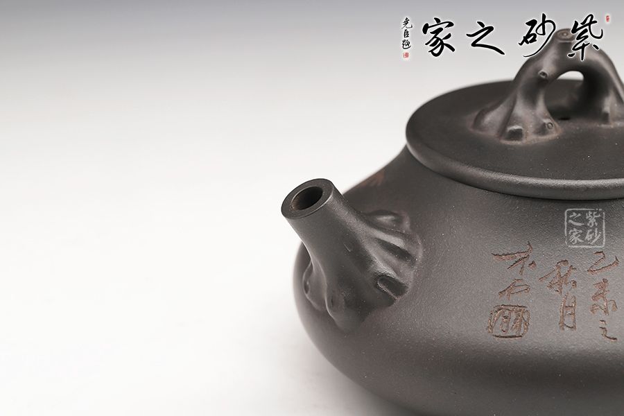此壺在經(jīng)典石瓢的基礎(chǔ)上加以創(chuàng)新,壺身呈“三角”,圓形平蓋纖秀輕盈,壓于壺口。古椿樹(shù)枝彎曲而成的橋型鈕古韻精致,壺嘴壺把搭配合宜。整器簡(jiǎn)樸大方,端莊典雅,自有一股瑩潤(rùn)朗健的氣度。