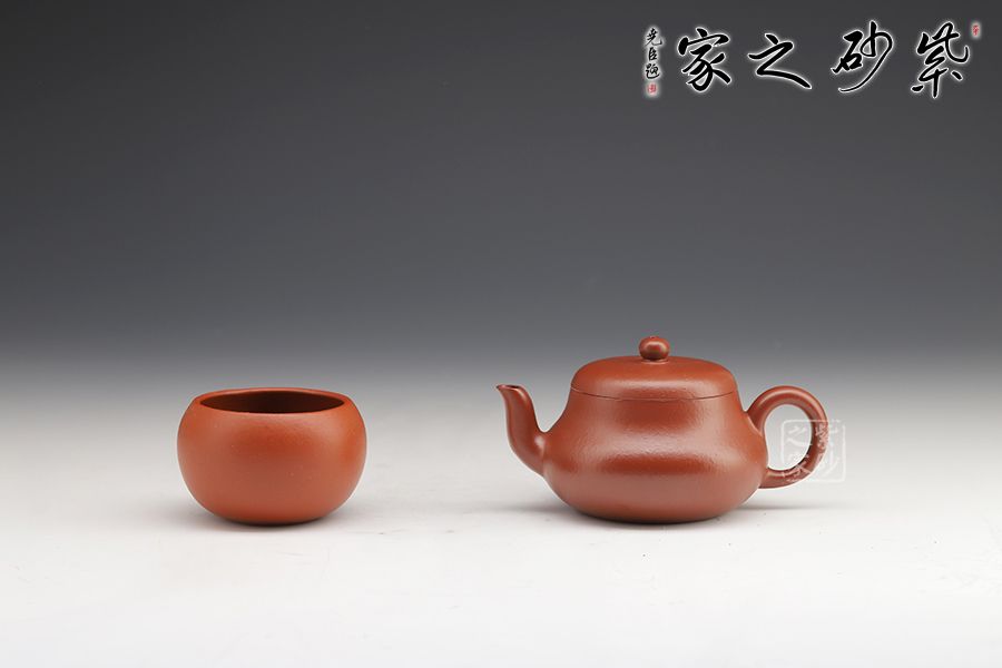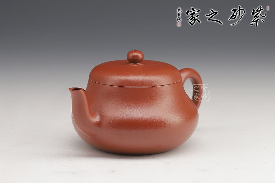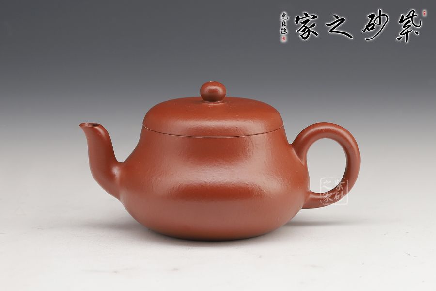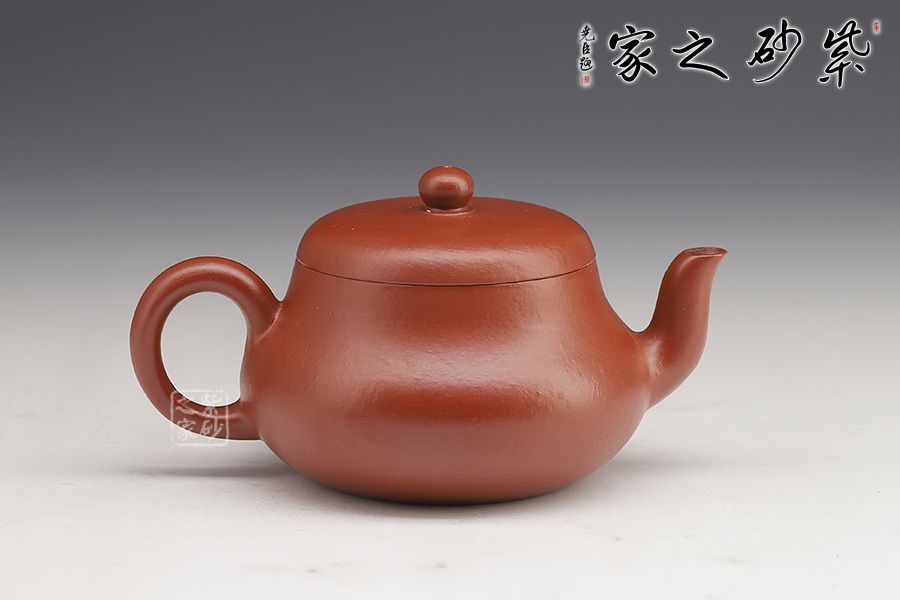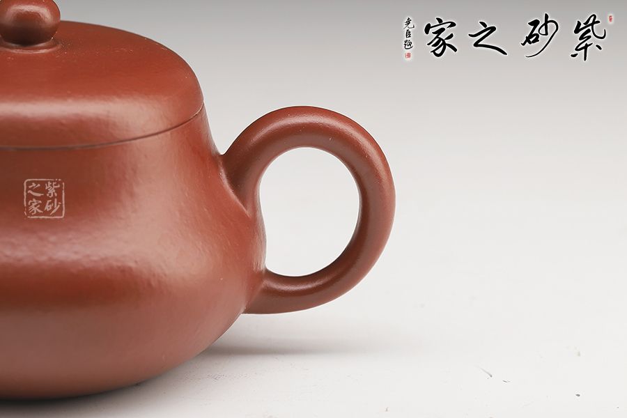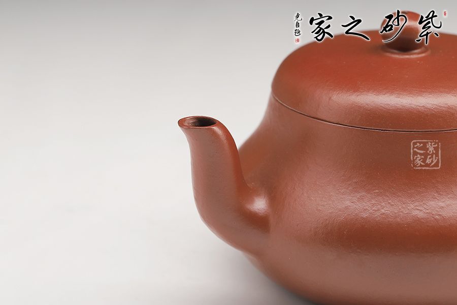 此壺精選泥中貴族朱泥制作而成,亮麗的泥色中透露出一種無(wú)所畏懼的豪氣,更兼一股溫文爾雅的翩翩君子之風(fēng),惹人憐愛(ài)。寶珠形壺鈕壓于壺蓋之上,壺體猶如一個(gè)變形的葫蘆。溜肩修長(zhǎng),彎嘴自壺身挺峭而出,圈隨圓把,細(xì)膩優(yōu)雅,略微向外傾斜,與壺嘴形成橫向拉伸,張力畢現(xiàn)。壺身底部略微收縮,整個(gè)壺體呈下沉之勢(shì),挺拔飛逸之時(shí)整個(gè)壺體不乏穩(wěn)重敦厚,大氣有形。