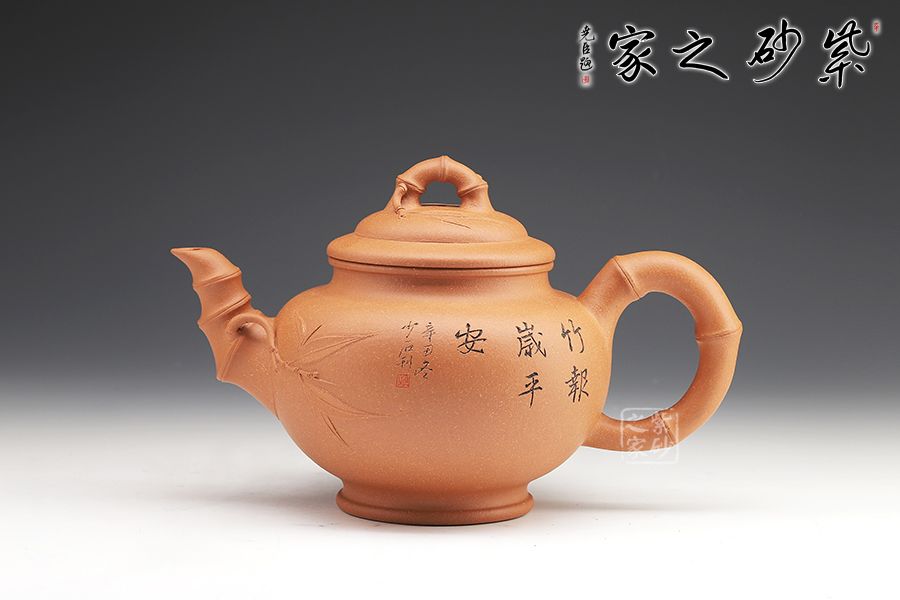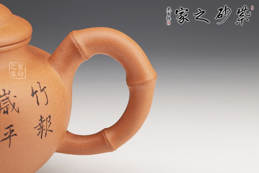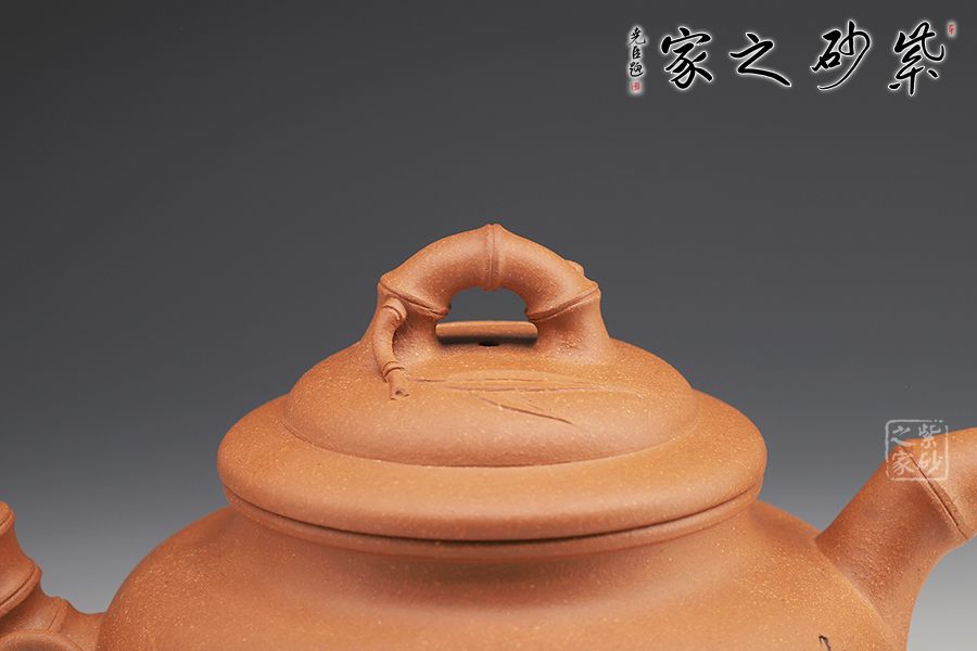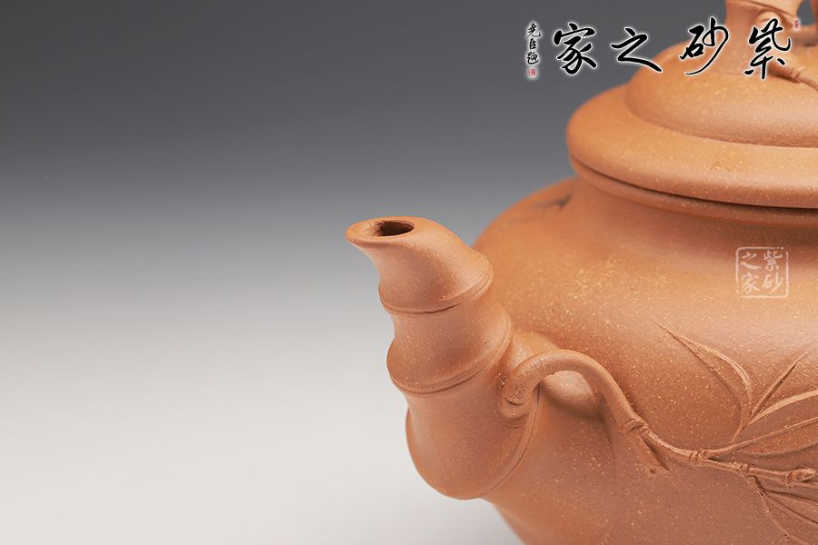 笑櫻是紫砂的經(jīng)典壺型之一,此器將竹節(jié)與笑櫻結(jié)合起來,賦予了新的意義。壺身圓潤(rùn)飽滿,壺蓋微鼓,蓋上以竹枝做橋形鈕,流、把均以竹枝隨形捏制。壺身正面貼塑一枝嫩竹,竹葉清疏可愛,與壺蓋裝飾一致。整器端莊大方,體態(tài)優(yōu)美,匠心獨(dú)運(yùn),值得把玩賞用。