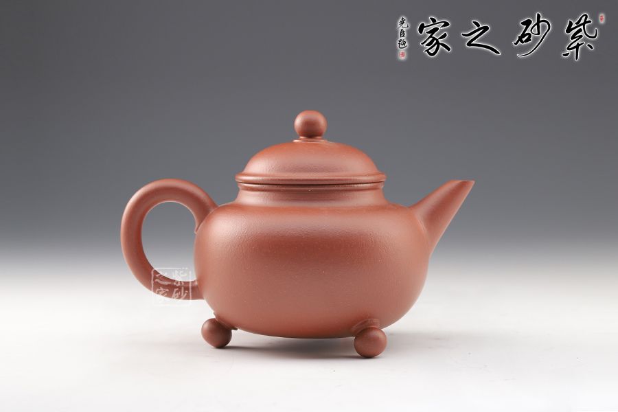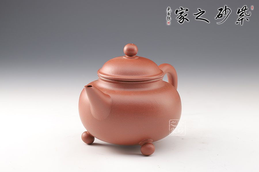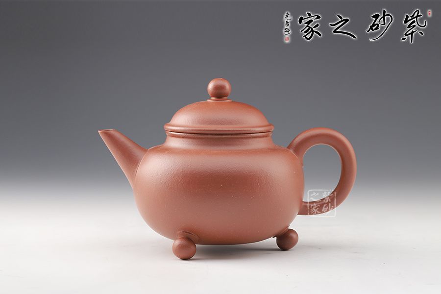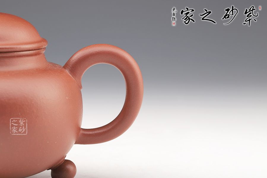 三足水平,顧名思義,該壺最大的亮點(diǎn)在于壺足的精心設(shè)計和制作。三足可愛圓潤,于壺底部力鼎壺身,平穩(wěn)閑適。壺鈕如珠,與壺足相映成趣。此壺整體圓潤飽滿,瑩潤古樸,雅致端莊。直流嘴上翹,俊秀挺拔,出水干脆利落。耳形端把骨肉亭勻,俊俏有力,端握舒適。壓蓋式,子母線嚴(yán)絲合縫,緊密貼合,氣密性良好。
