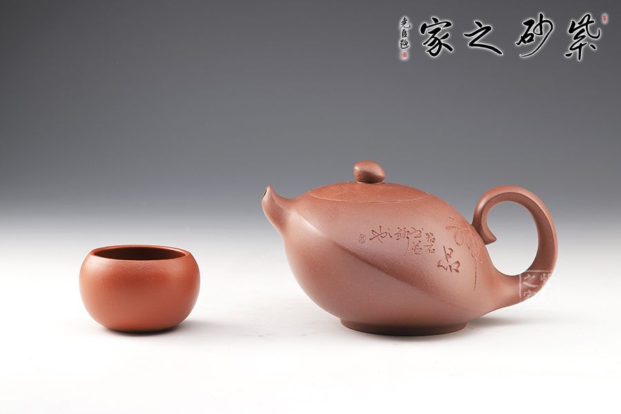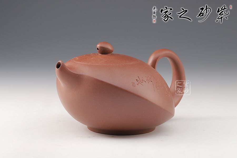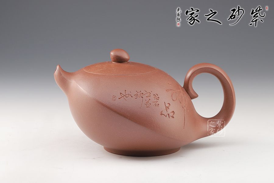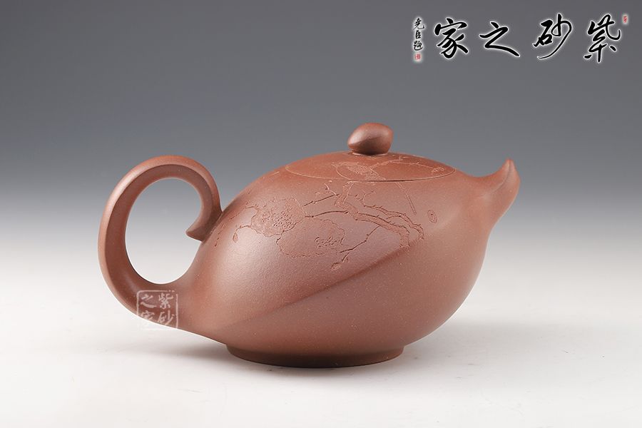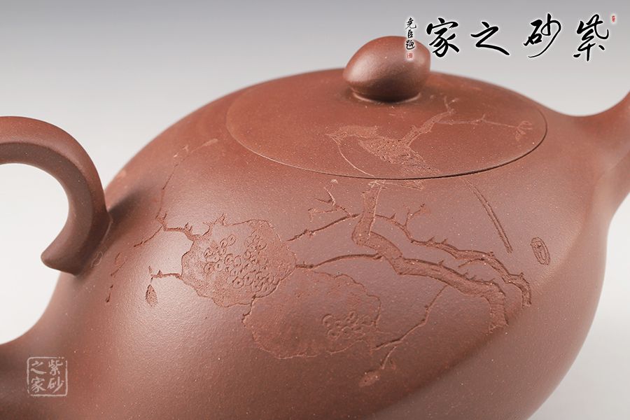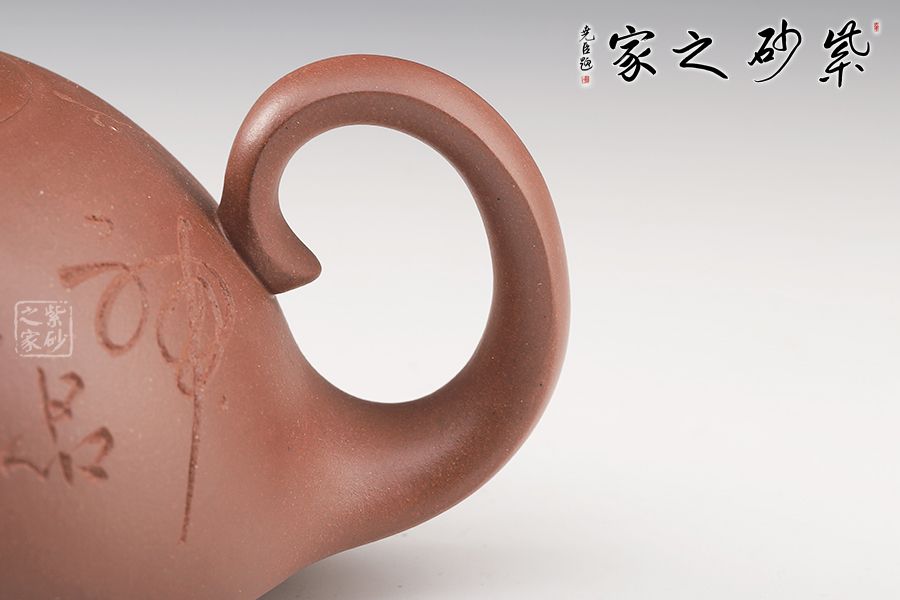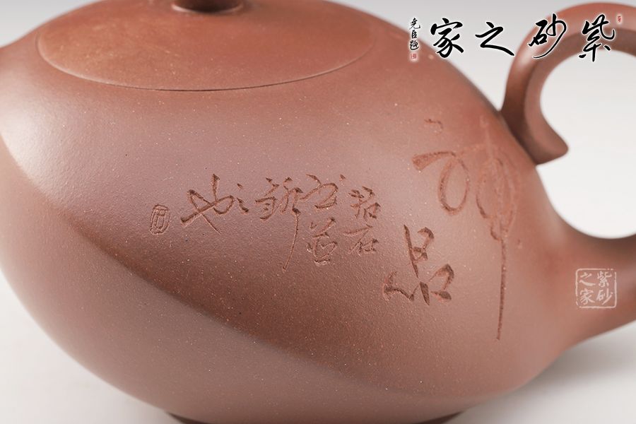 此壺造型奇特,壺身飽滿,壺底穩(wěn)重,壺蓋與壺身融為一體,氣密性良好。壺嘴上翹,出水更順暢。壺鈕如整器縮影,拿捏方便。壺身刻繪,刀法凌而不亂,足見老師技藝之高超。