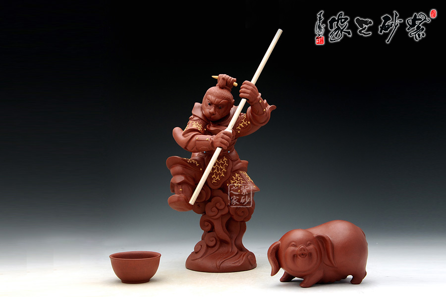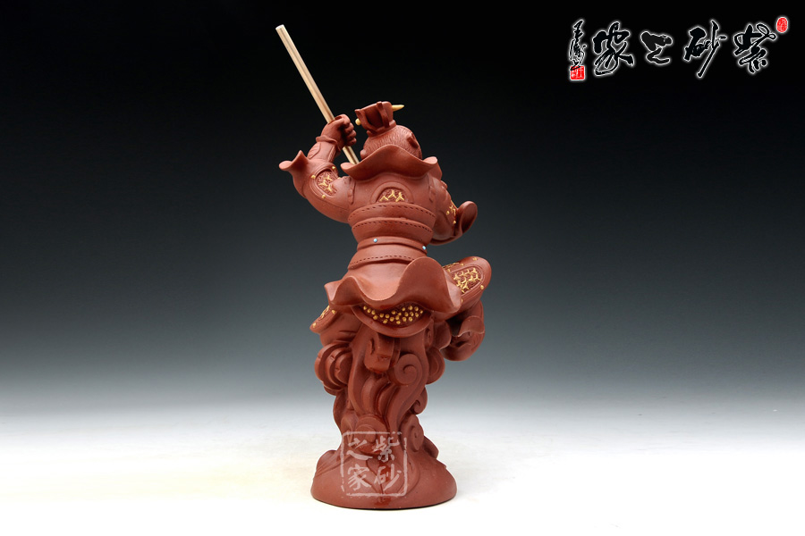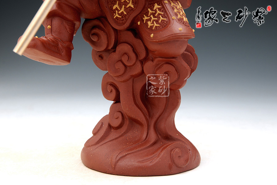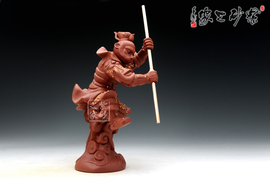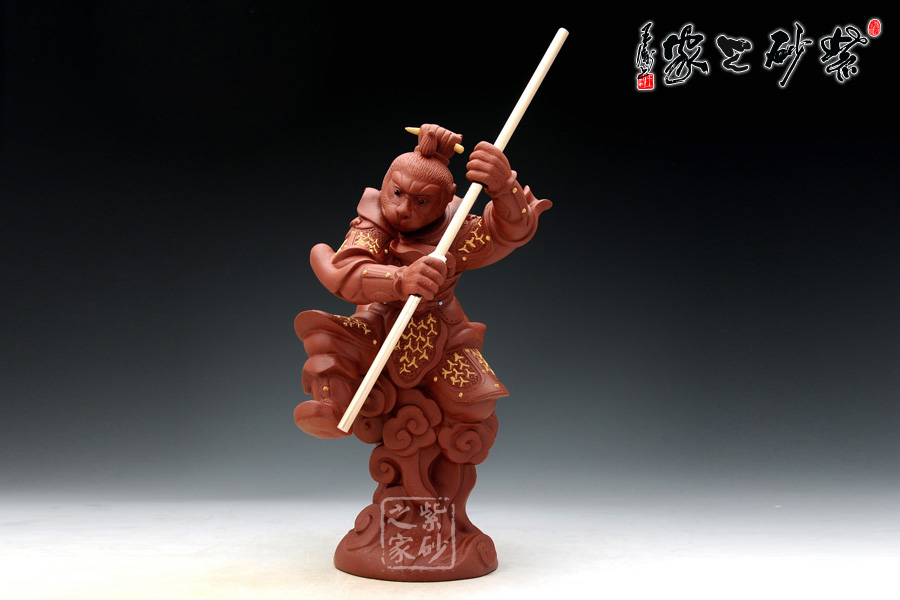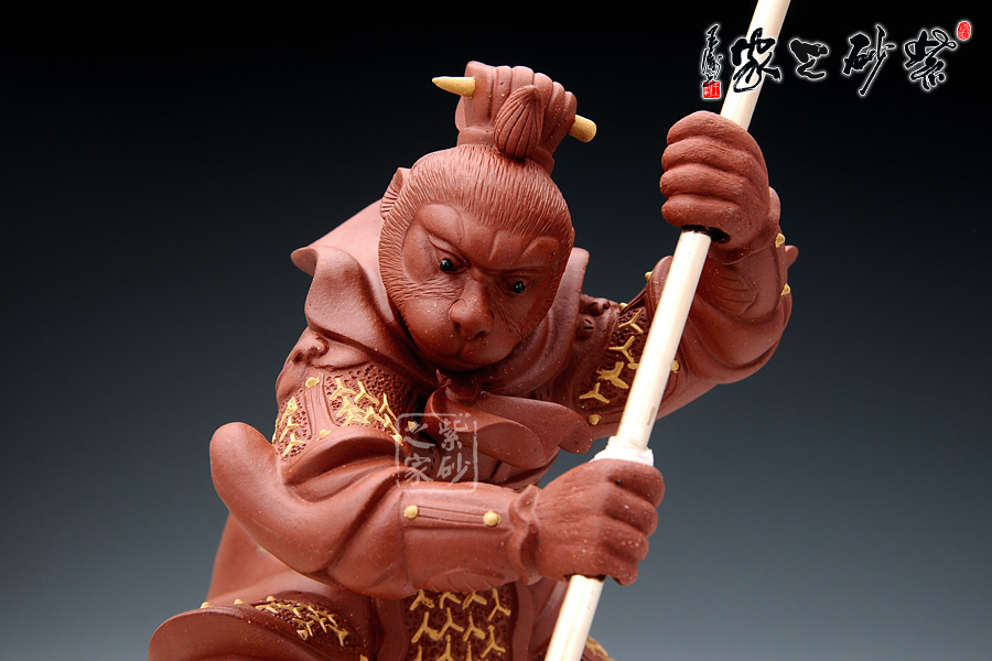 這款雜件取形于中國經(jīng)典四大名著之《西游記》中的孫悟空的神話形象,孫悟空象征著正氣,有辟邪鎮(zhèn)宅之功用,《西游記》是許多人心目中不朽的回憶,孫悟空也是同樣象征著我們兒時的一種精神力量。這款作品造型逼真,面目威嚴(yán),身披鎧甲,頭戴紫金冠,手舞金箍棒,腳踩筋斗云,真是我們記憶中的形象。