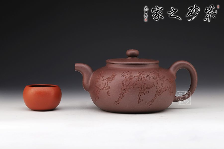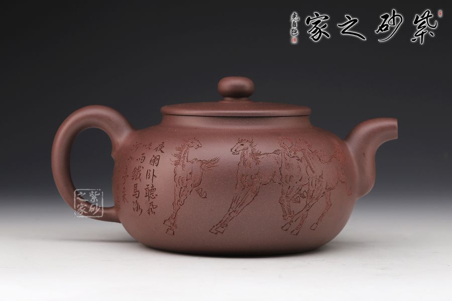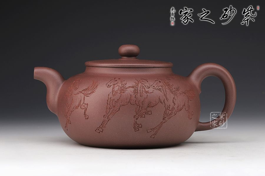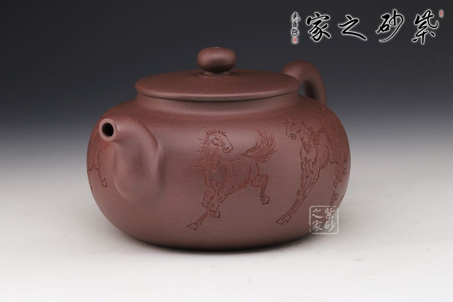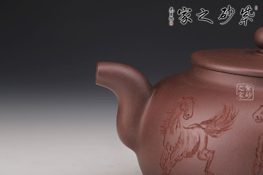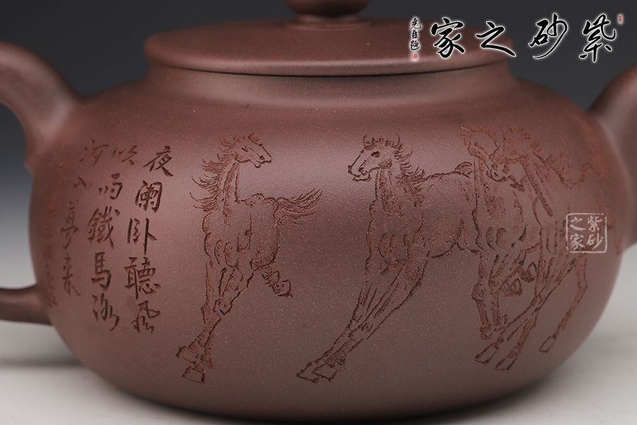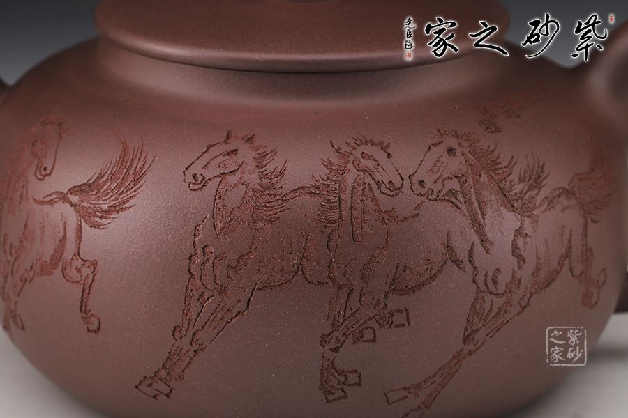 此壺扁圓,從流把延續(xù)至壺蓋、壺身至壺底,僅用曲線過渡,沒有一個(gè)棱角和一根多余的線條,像一位氣定神閑的老人端坐,自然而飽滿,簡單卻不單調(diào)??汤L的八駿圖氣勢恢宏,大氣磅礴。