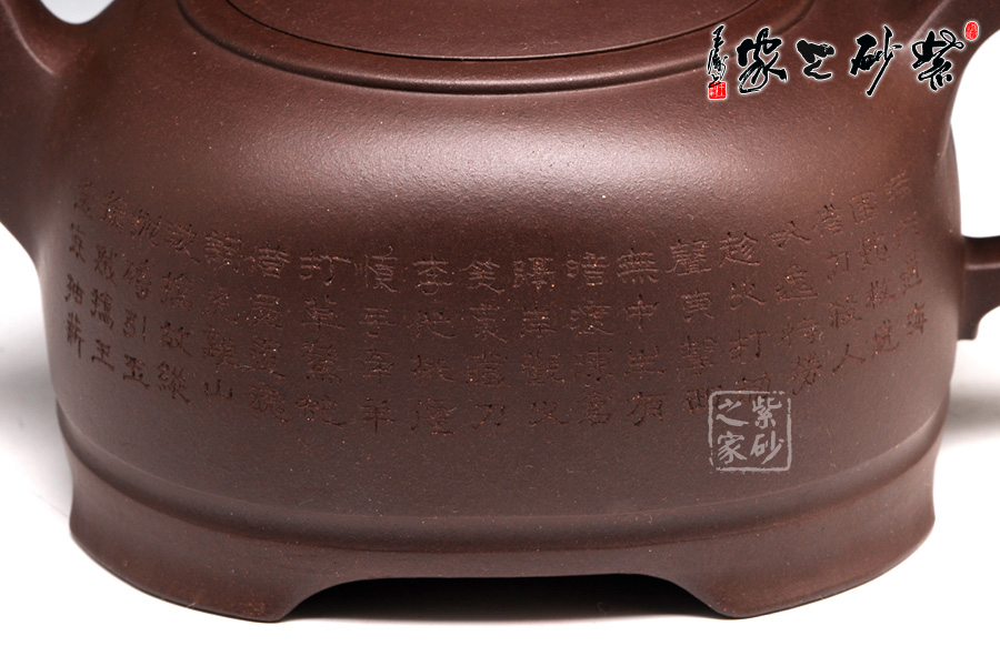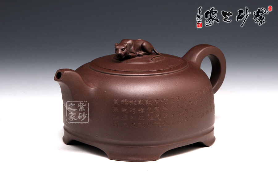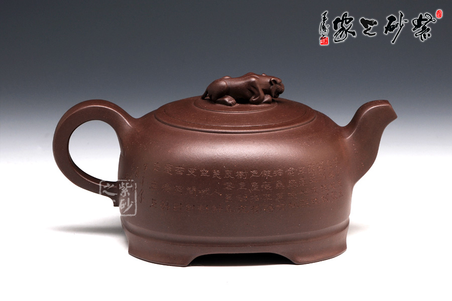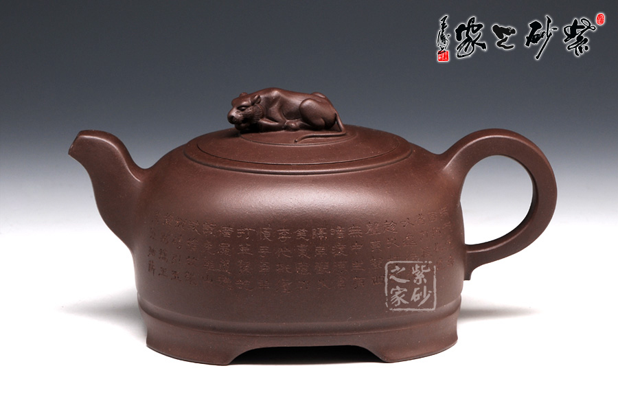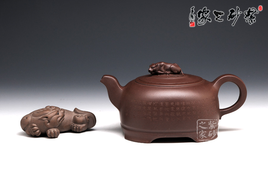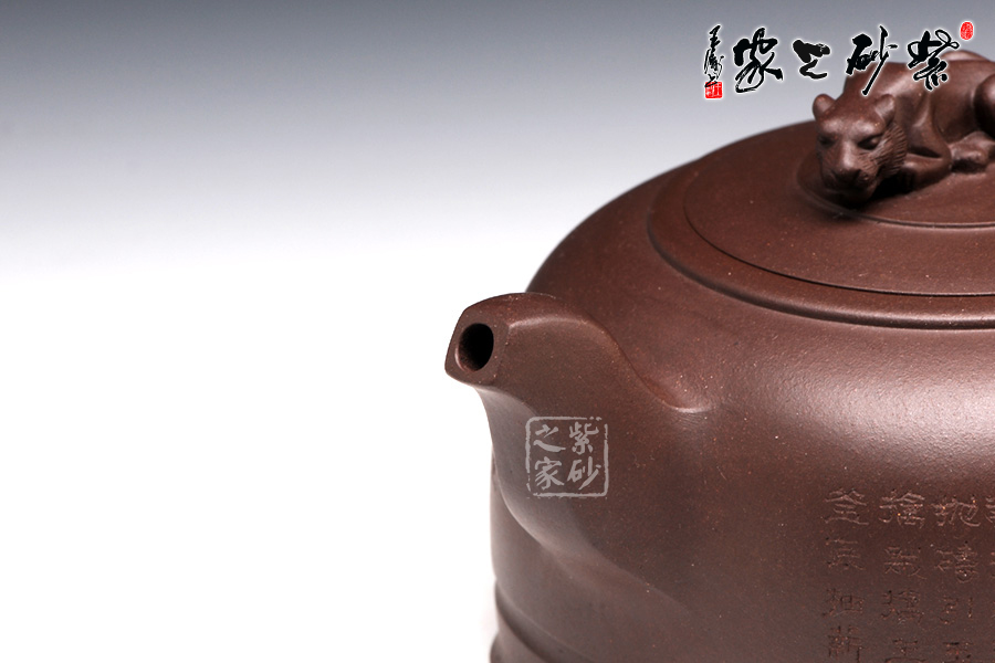此壺整體如臥虎狀,有蓄勢待發(fā)之勢,四足如擲地有聲,寓意昂揚(yáng)睿智,采用原礦紫泥制作,色澤醇厚,砂質(zhì)綿柔