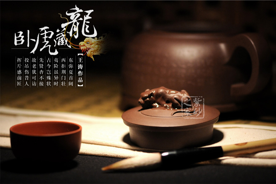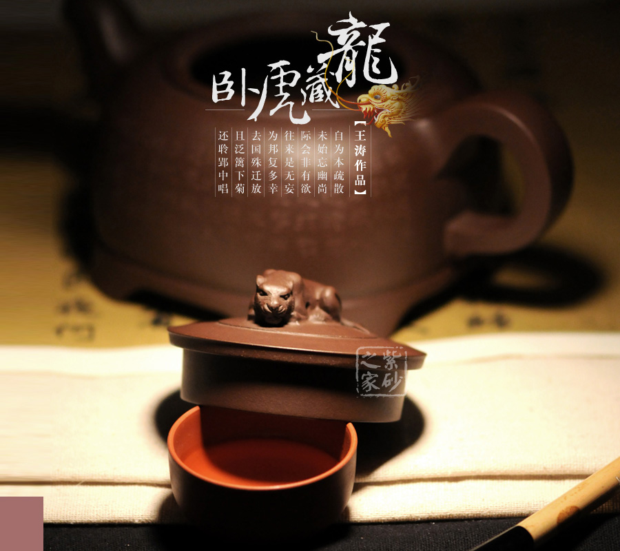 創(chuàng)作理念自述:臥虎藏龍這幾個字眼就是很霸氣,龍虎也是中國傳統(tǒng)文化中不可或缺的經(jīng)典圖騰,這把臥虎藏龍壺我是根據(jù)簡單的字面意思來設(shè)計的,壺身由于不能脫離實(shí)用性,所以是以虎的輪廓為原型設(shè)計而來,四足開門格外穩(wěn)重些,壺嘴和壺把的設(shè)計正好延伸了虎首、虎尾的線條感,壺鈕就是捏成的臥虎的造型,我十分注重神韻姿態(tài),虎的造型也頗得壺友的贊譽(yù),藏龍呢,我設(shè)計的是貼在了壺蓋內(nèi)壁,不貼于壺底是考慮到長期茶湯浸泡回產(chǎn)生移位或斷裂,貼在壺蓋上更合理一些。