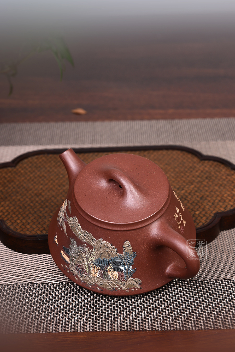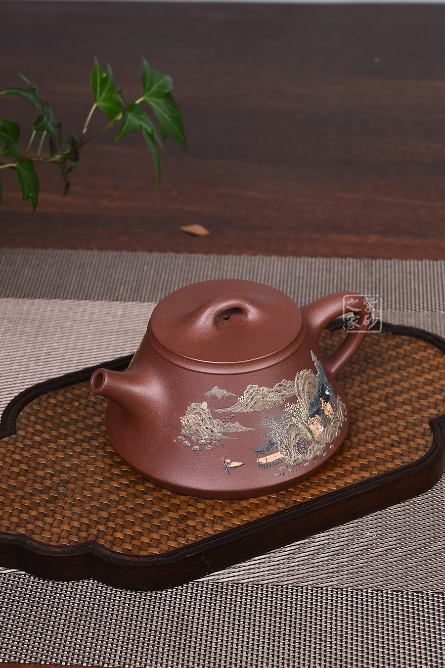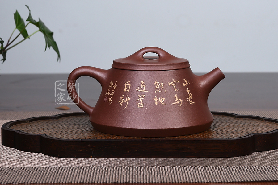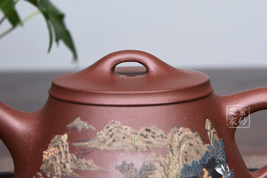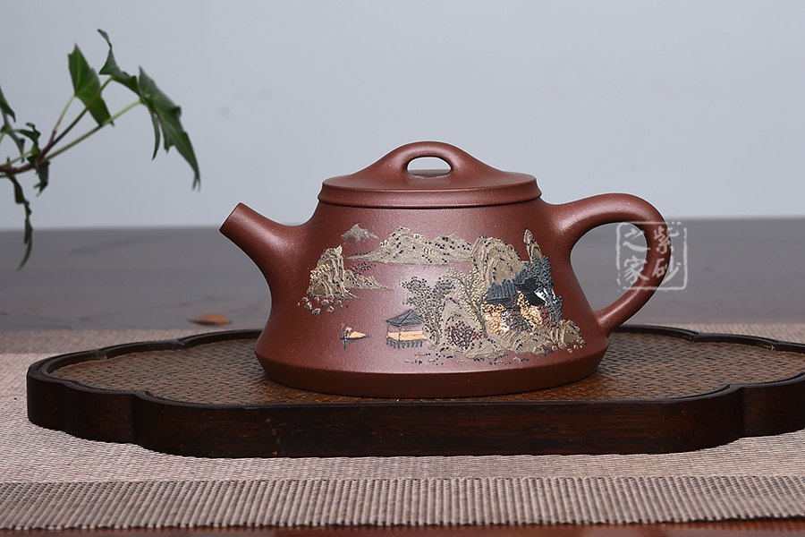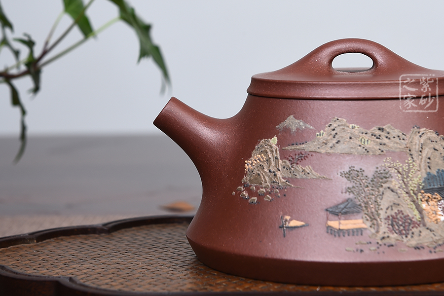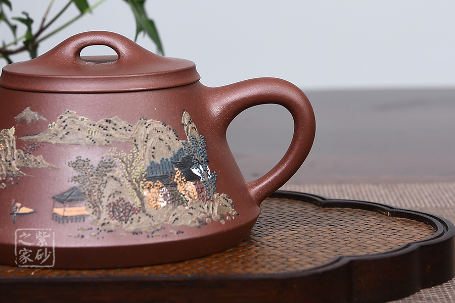 此款壺器型古拙,線面簡(jiǎn)潔明快,還不失沉穩(wěn)大度,壺身仍沿襲古老方法上小下大,使重心下垂,使用起來更穩(wěn)當(dāng)。壺嘴采用短而有力的直筒形,出水的力度更加佳,壺鈕如同一條拋物線連接壺蓋兩端,形如拱橋。老師創(chuàng)新將普通石瓢的壺底三足改為棱線平底,穩(wěn)重大氣質(zhì)感。壺身泥繪江南水鄉(xiāng)之景,更添意境。
