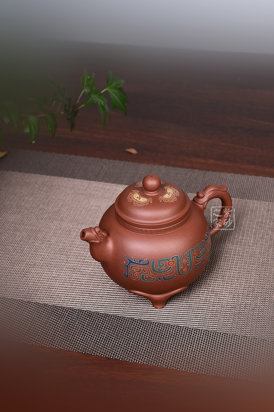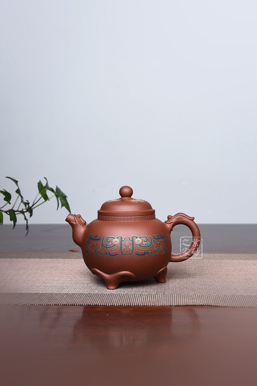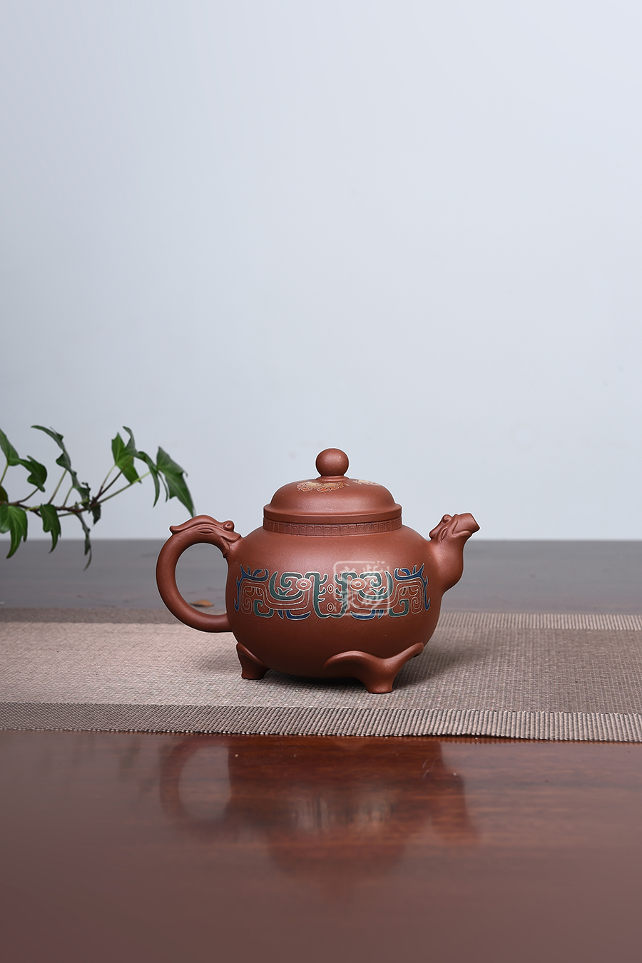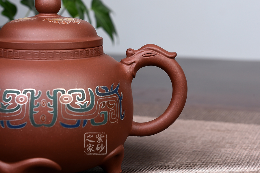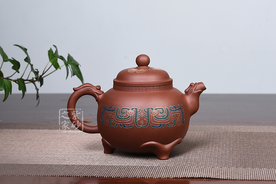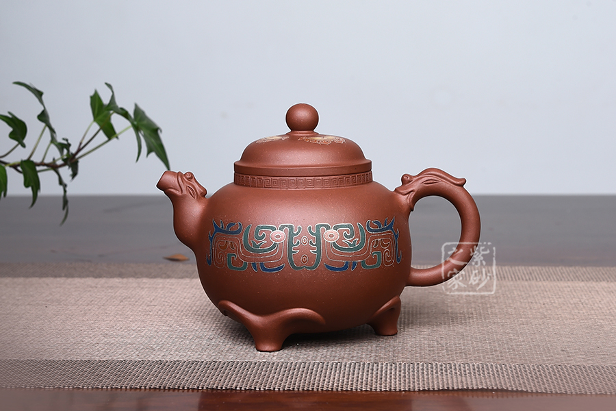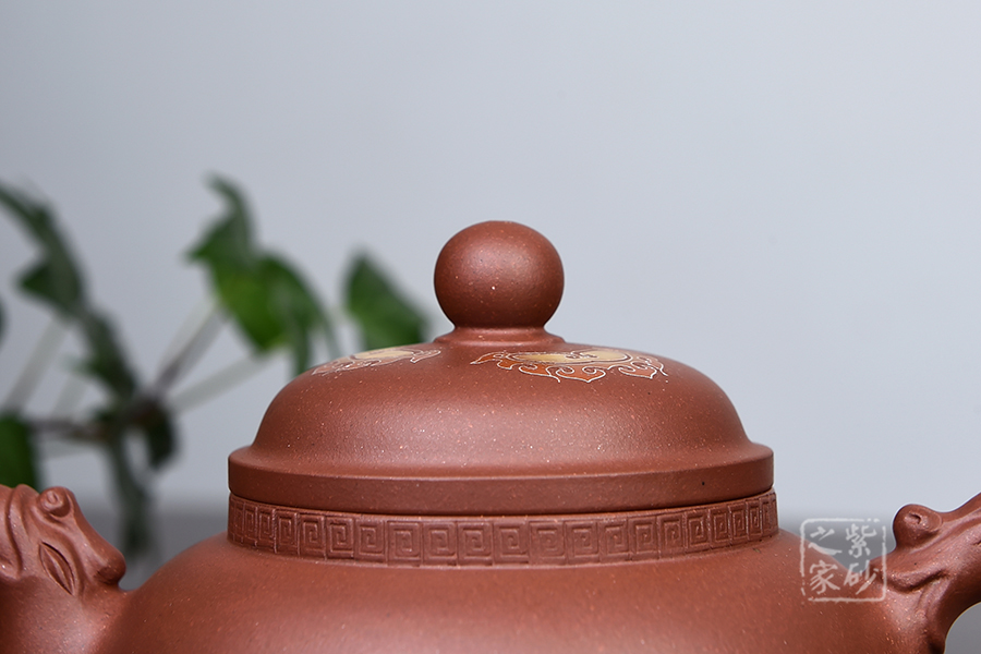 此壺仿羊而做,底部三足似羊角,形象逼真,沉穩(wěn)有力,牢牢支撐壺體。壺身圓潤(rùn),壺腹飽滿,似大肚之態(tài)。壓蓋設(shè)計(jì),蓋頂高聳。 三羊開(kāi)泰,羊同“陽(yáng)”,有吉亨之象,常用來(lái)稱頌歲首或寓意吉祥。