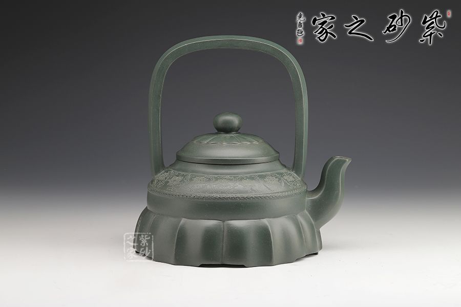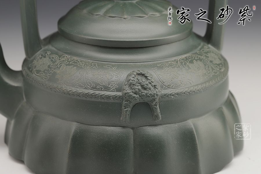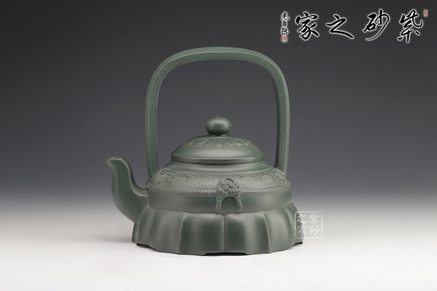 此壺如層層疊疊的少女半裙,壺身上部圓潤挺拔,柔和素雅,下部由起伏的方片塑造成飄逸的裙擺。壺蓋貼荷葉邊紋飾,三彎流與扁方體提梁互增氣勢,棱線呼應(yīng)。整器造型俏麗,線條流暢,既有方器的干凈利落,又有花塑器的生動形象。