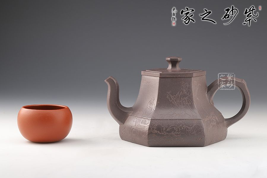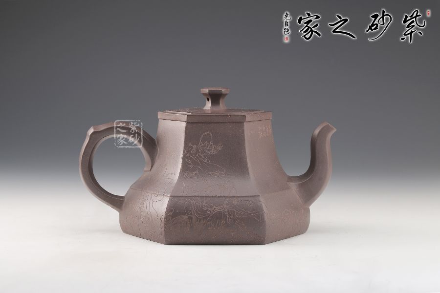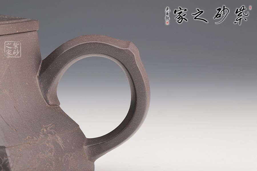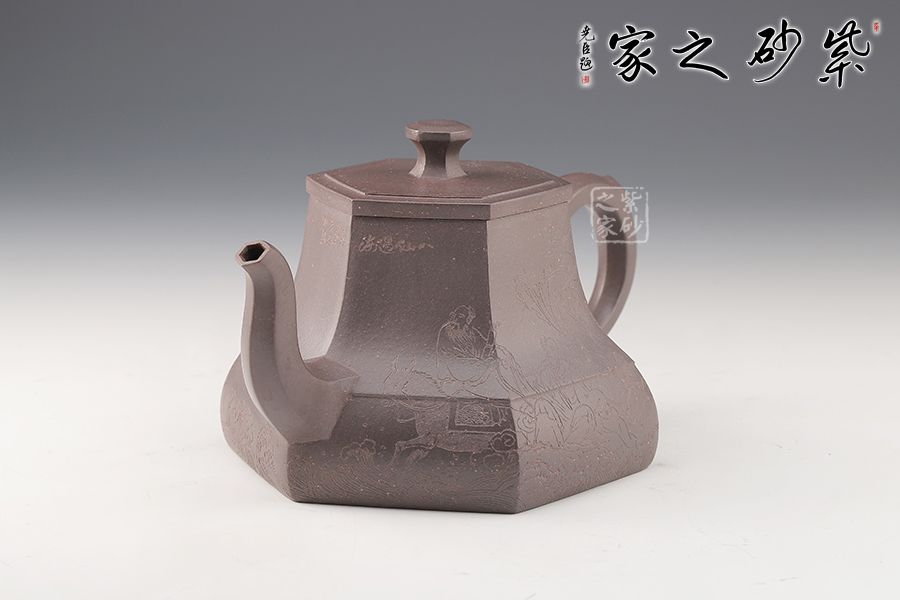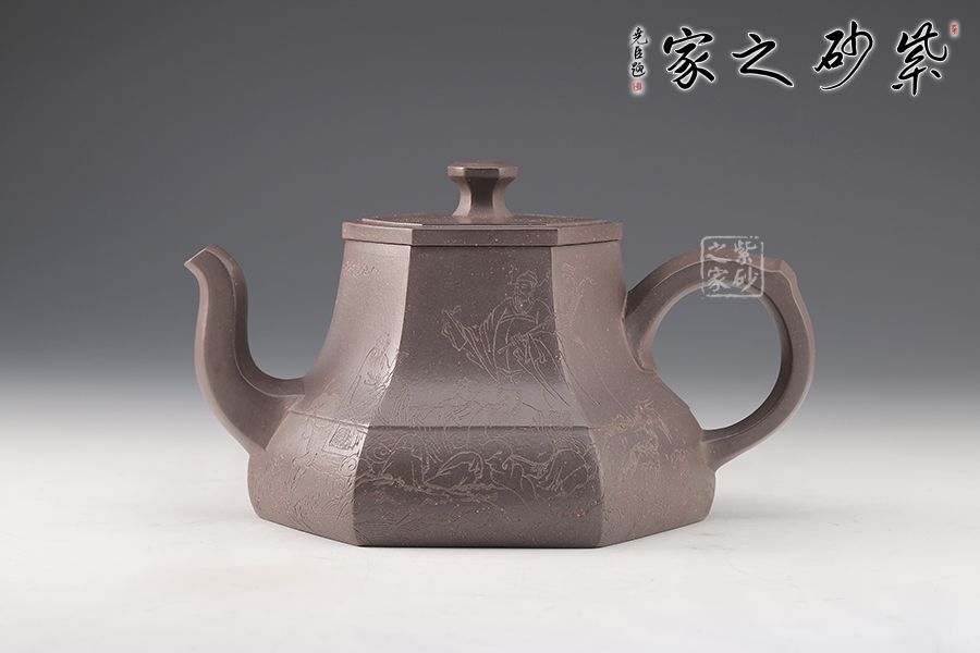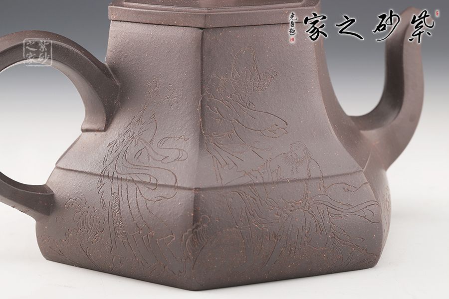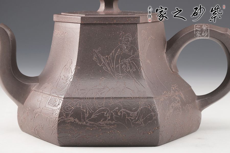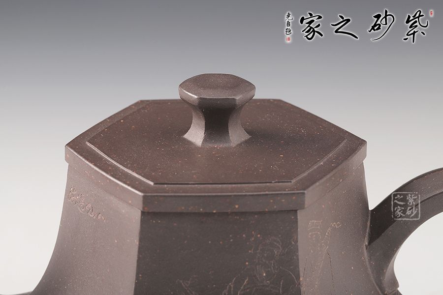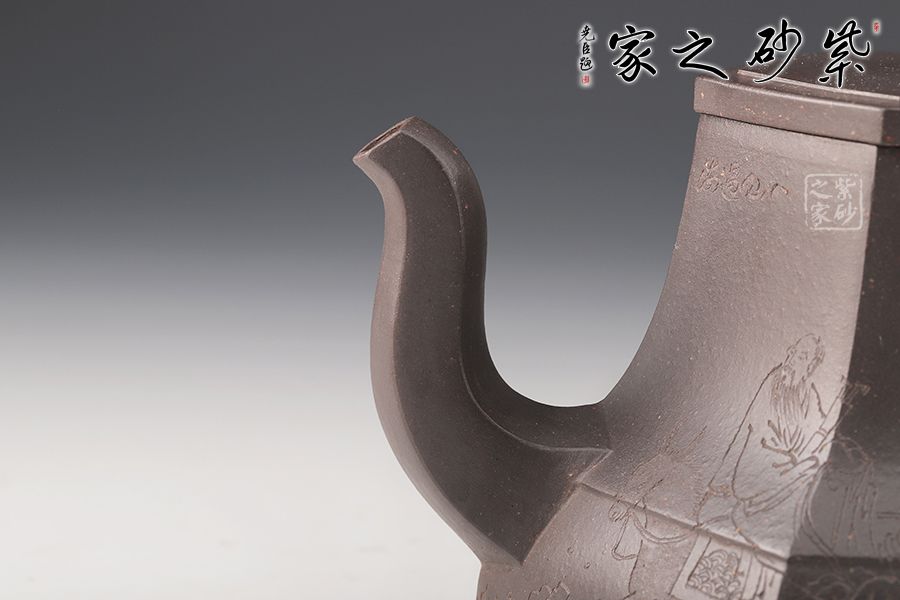 春華六芳壺精選青灰泥全手工制作而成,色澤古樸,壺身八個泥片拼制而成,難度極高。壺腹一條棱線裝飾,上下分割,非常立體。嘴把四方造型,線條十分流暢。壓蓋設(shè)計,嚴(yán)絲合縫,壺鈕別致,似縮小版的壺身。刻繪裝飾,美觀大氣。