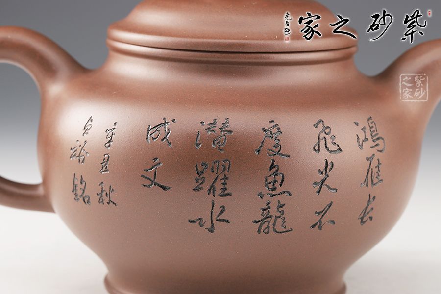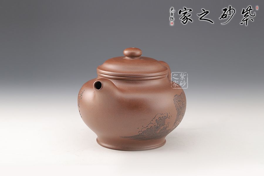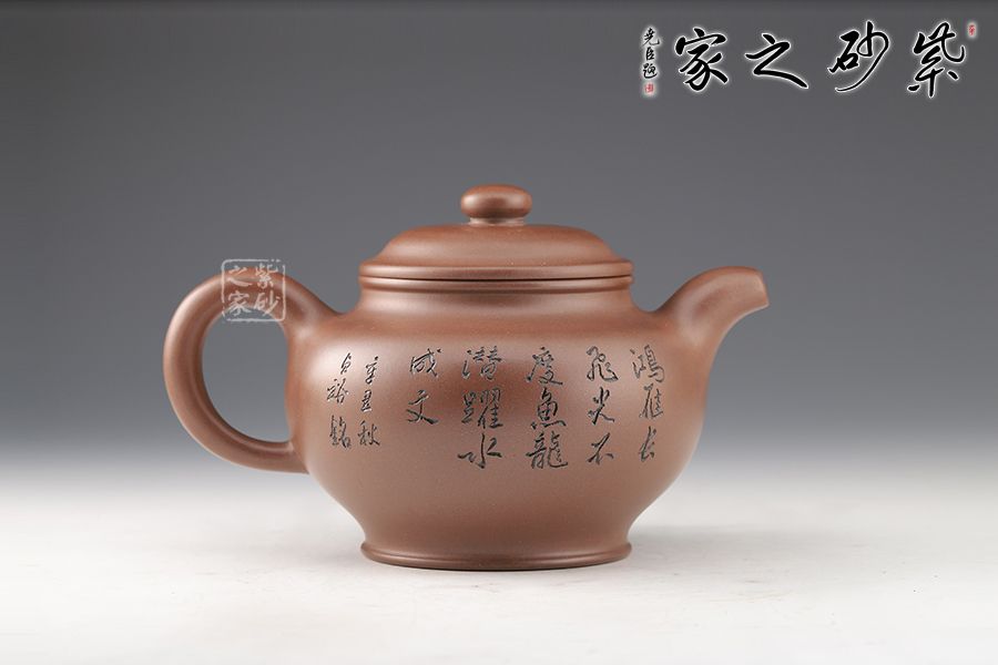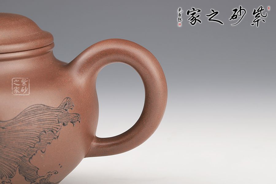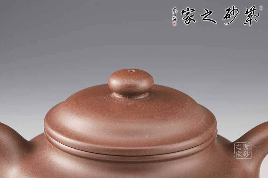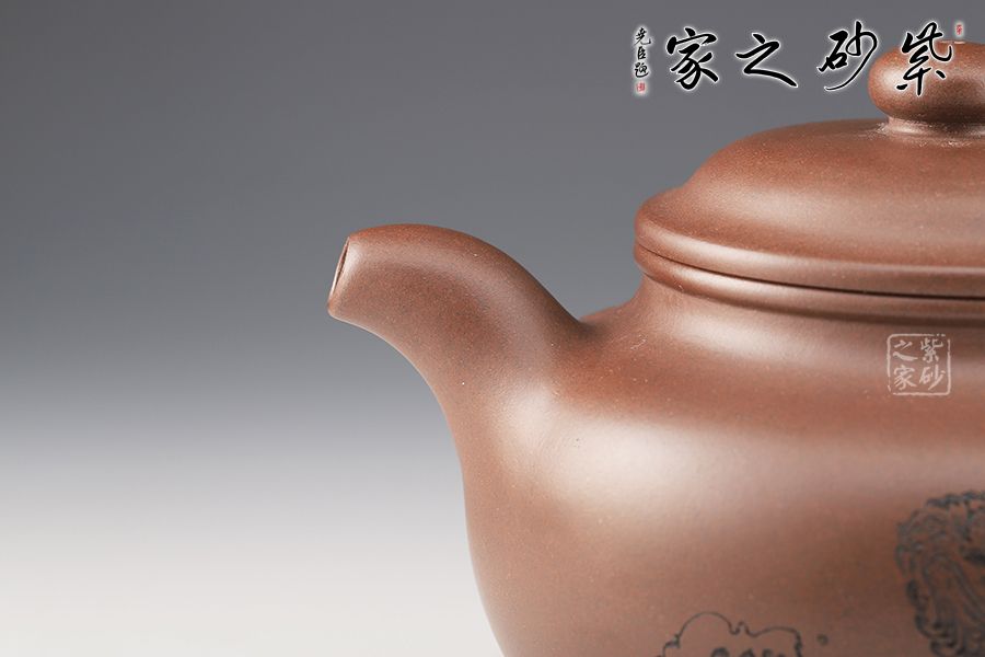 此壺有著渾圓的壺身,半圓的壺蓋,圓鈕,線條流暢,比例得當(dāng),不費(fèi)吹灰之力,壓蓋略微渾厚,呈鎖蓋之勢,點(diǎn)線之間見出魅力,彎流嘴胥出,在端頭下壓,柔美之姿明顯,壺柄略微上抬之后優(yōu)雅滑落而下,形成一條圓潤飽滿的弧線,樸雅大方。