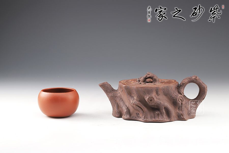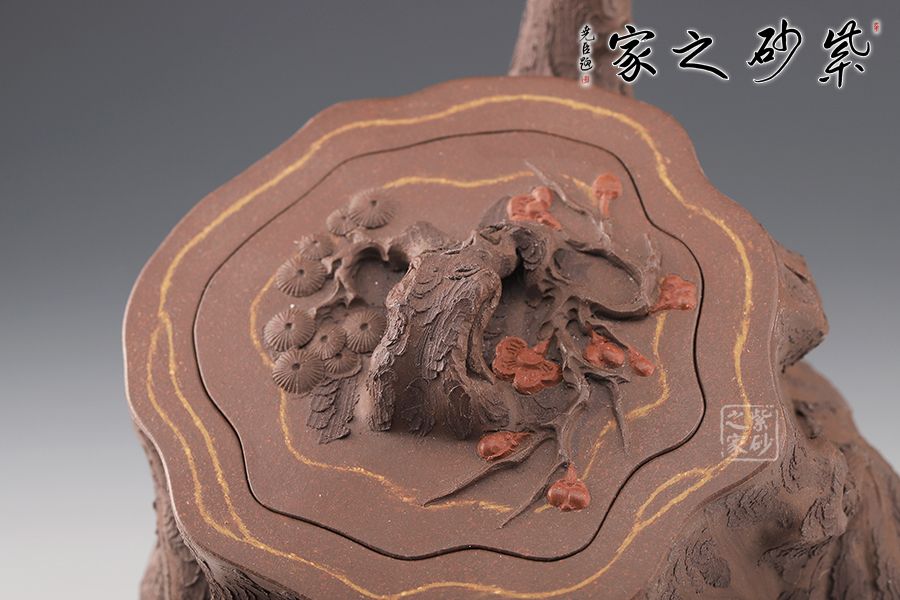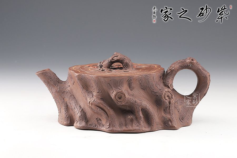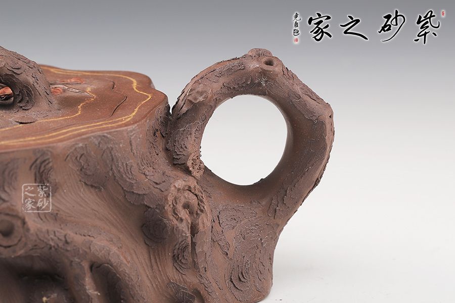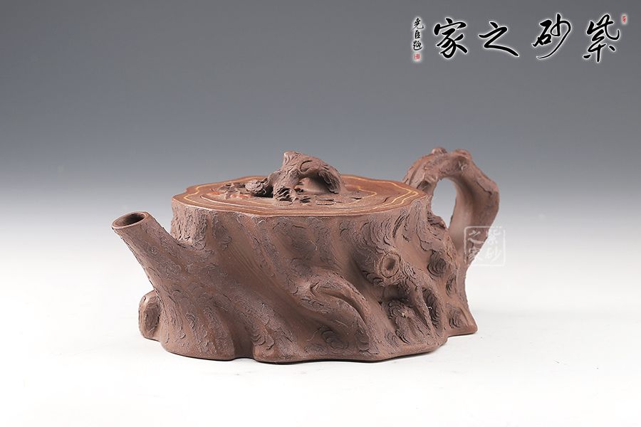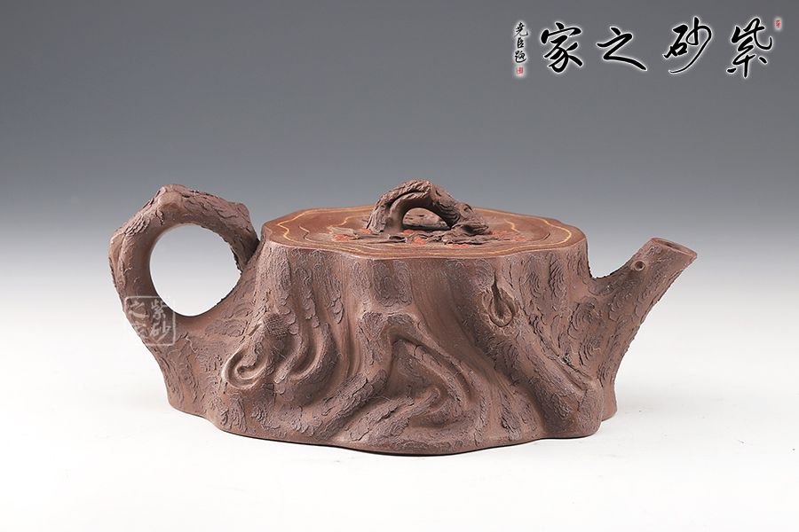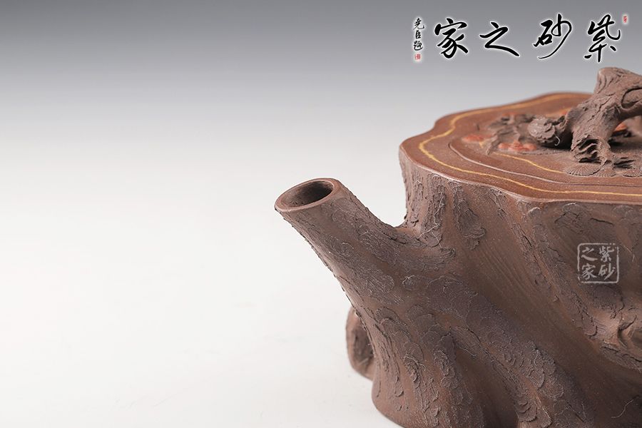 壺嘴、壺鈕和壺把則是樹枝,有彎有直,有收有放,粗細(xì)不一,樹樁粗細(xì)不同,上下全不規(guī)則,再加上各種瘢痕、裂紋、樹皮的模樣,將樹樁壺點(diǎn)綴得尤其逼真,整體壺器清香自然,十分雅致。