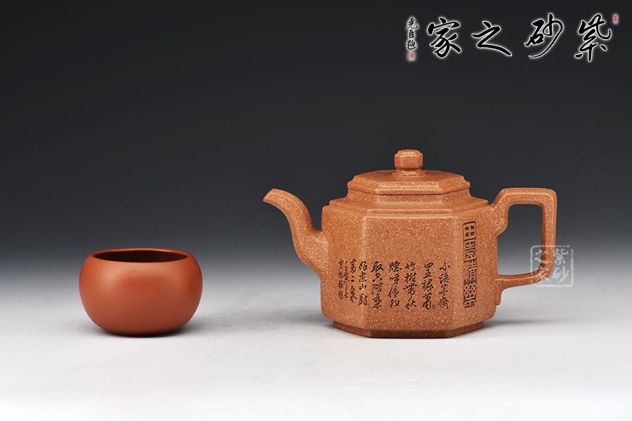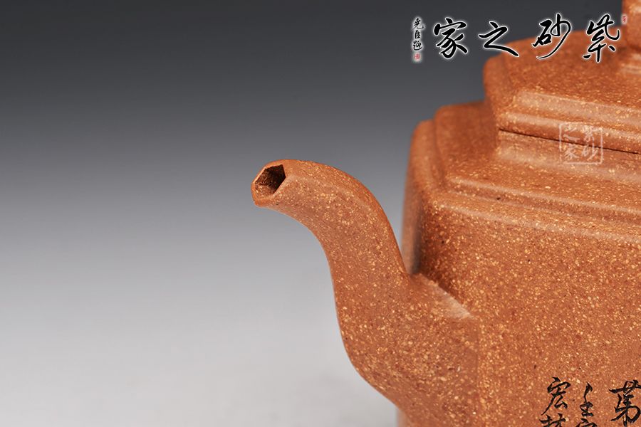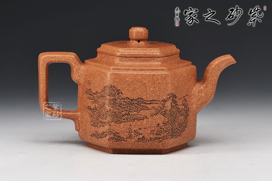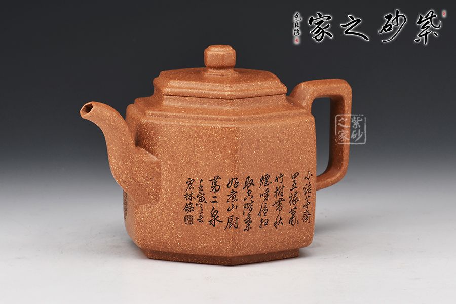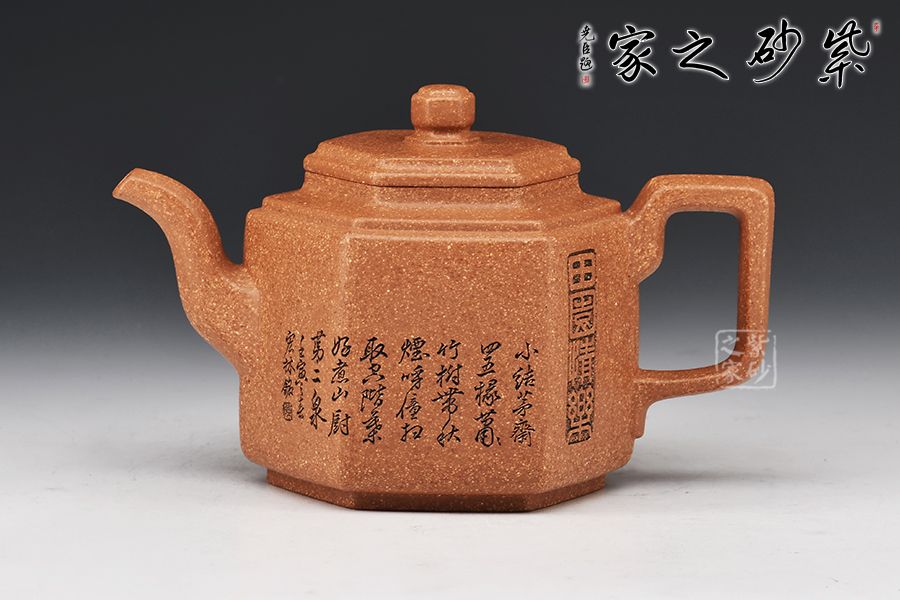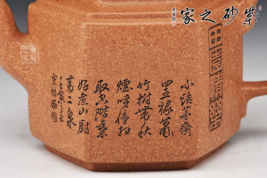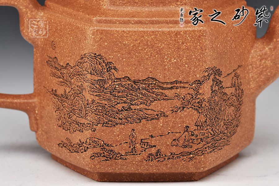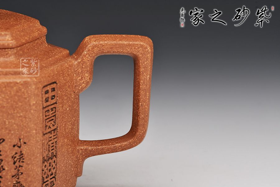 此壺以原礦紫泥作胎,伴以粒粒金砂,古樸雅致。四方入壺,壺身挺拔,四方平壓蓋、橋鈕彰顯古韻。彎流、飛把于壺腹自然胥出,線條勁中帶柔,比例和諧,美觀大氣。雙面刻繪刀法利落,筆力飄逸,情趣韻味優(yōu)雅,值得賞藏。好料精工,方中寓圓,值得入手品賞。