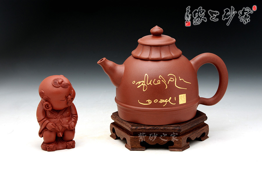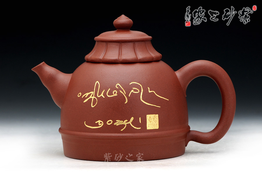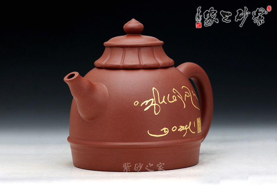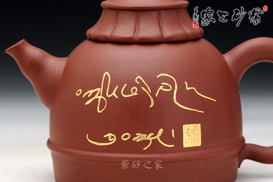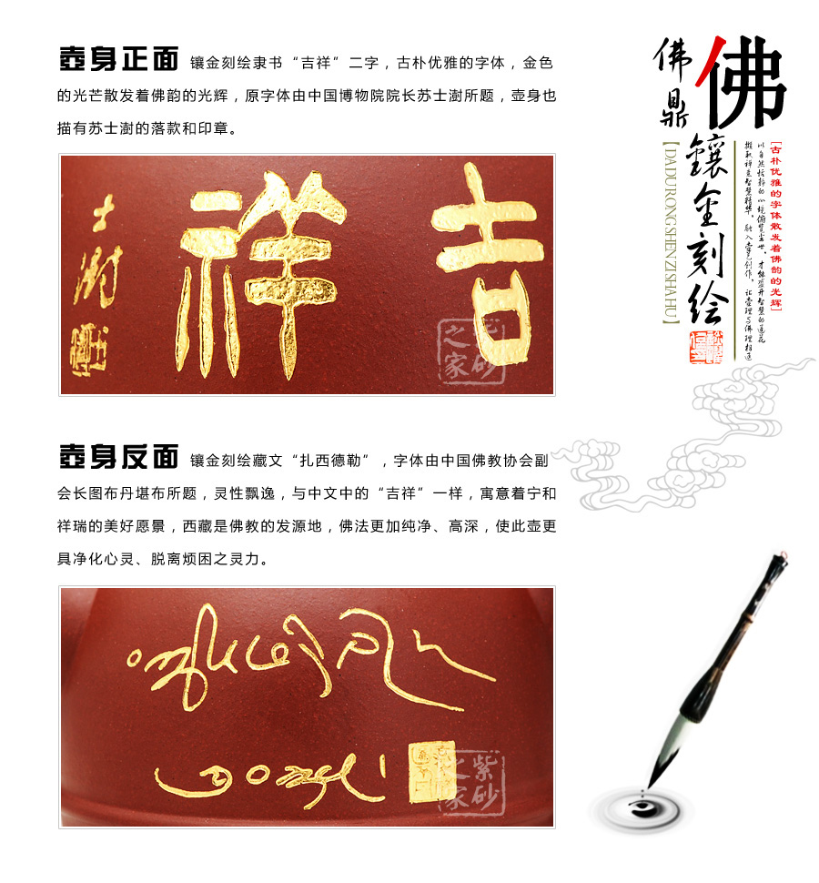 鑲金刻繪:壺身正面鑲金刻繪隸書(shū)“吉祥”二字,古樸優(yōu)雅的字體,金色的光芒散發(fā)著佛韻的光輝,原字體由中國(guó)博物院院長(zhǎng)蘇士澍所題,壺身也描有蘇士澍的落款和印章。 壺身反面鑲金刻繪藏文“扎西德勒”,字體由中國(guó)佛教協(xié)會(huì)副會(huì)長(zhǎng)圖布丹堪布所題,靈性飄逸,與中文中的“吉祥”一樣,寓意著寧和祥瑞的美好愿景,西藏是佛教的發(fā)源地,佛法更加純凈、高深,使此壺更具凈化心靈、脫離煩困之靈力。