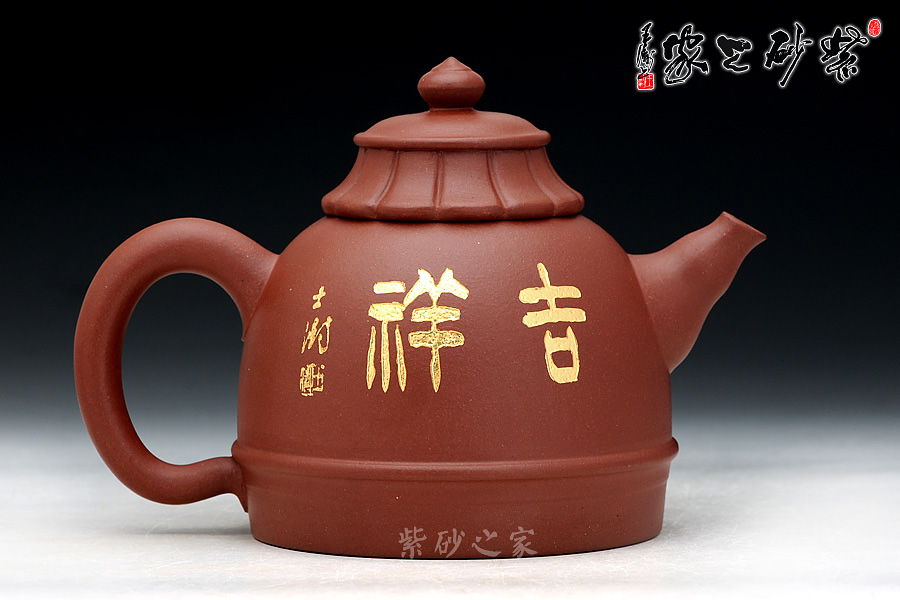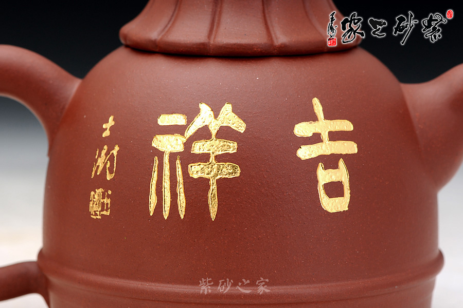 B面: 裝飾: 吉祥 裝飾者:蘇士澍 裝飾內(nèi)容: 壺身反面鑲金刻繪“吉祥”二字,古樸祥和,原字體為中國(guó)博物院副院長(zhǎng)蘇士澍所題,更添收藏價(jià)值