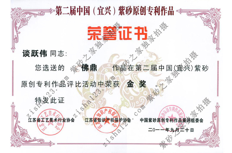 2011年9月 《佛頂壺》獲第二屆中國(guó)紫砂原創(chuàng)專(zhuān)利作品評(píng)選金獎(jiǎng)