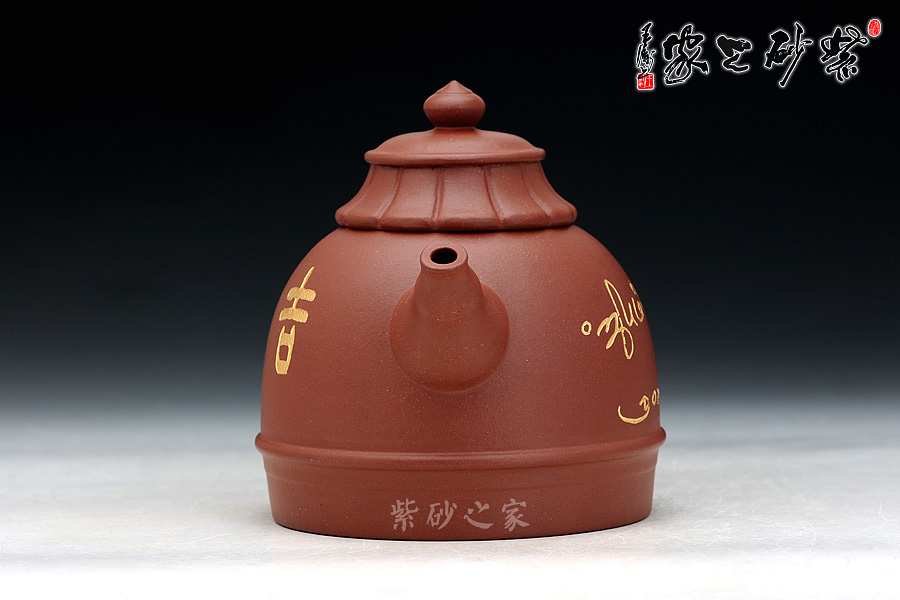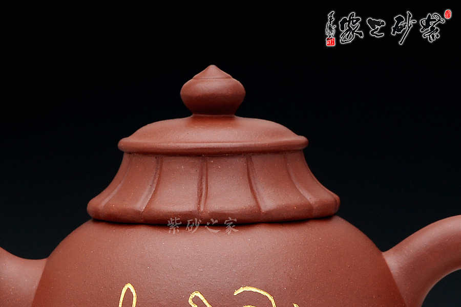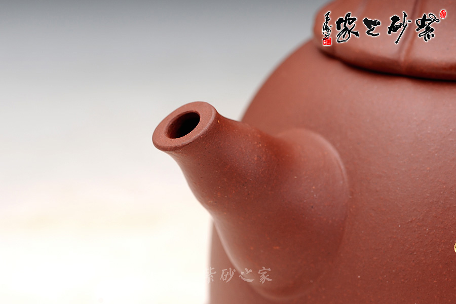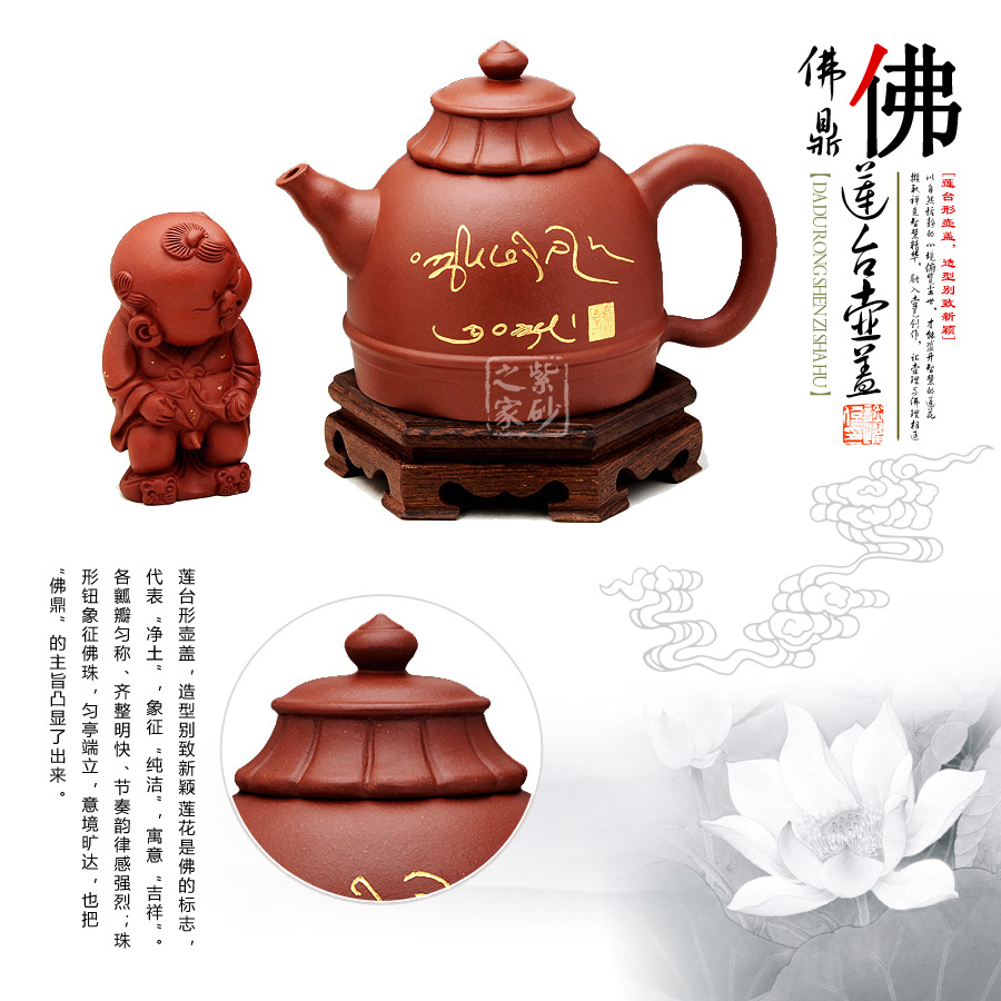 蓮臺(tái)壺蓋:蓮臺(tái)形壺蓋造型別致新穎,蓮花是佛的標(biāo)志,代表“凈土”,象征“純潔”,寓意“吉祥”。各瓤瓣勻稱(chēng)、齊整明快、節(jié)奏韻律感強(qiáng)烈;珠形鈕象征佛珠,勻亭端立,意境曠達(dá),也把“佛頂”的主旨凸顯了出來(lái)。