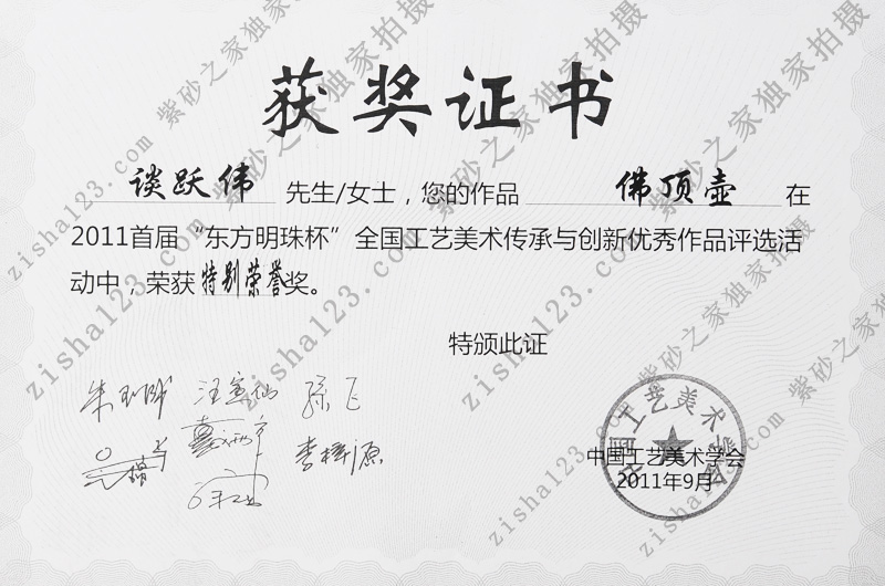 2011年9月 《佛頂壺》獲全國(guó)工藝美術(shù)傳承與創(chuàng)新優(yōu)秀作品評(píng)選“東方明珠杯”特別榮譽(yù)獎(jiǎng)