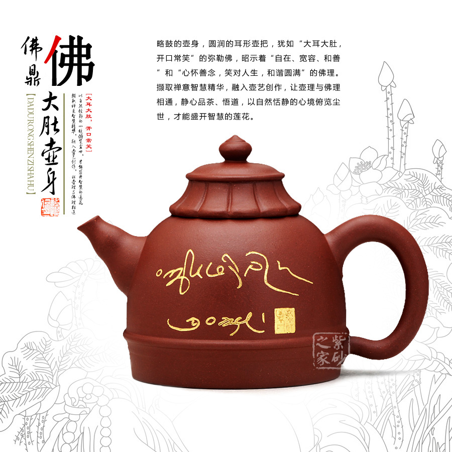 大肚壺身:略鼓的壺身,圓潤(rùn)的耳形壺把,猶如“大耳大肚,開(kāi)口常笑”的彌勒佛,昭示著“自在、寬容、和善”和“心懷善念,笑對(duì)人生,和諧圓滿(mǎn)”的佛理。擷取禪意智慧精華,融入壺藝創(chuàng)作,讓壺理與佛理相通,靜心品茶、悟道,以自然恬靜的心境俯覽塵世,才能盛開(kāi)智慧的蓮花。