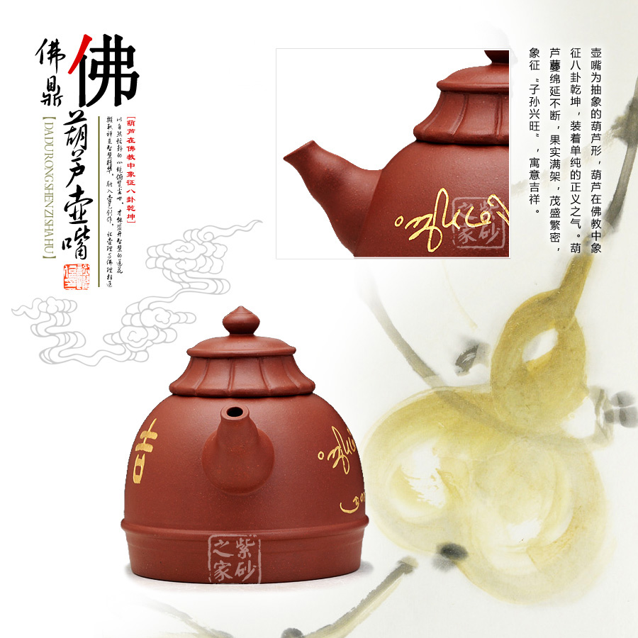 葫蘆壺嘴:壺嘴為抽象的葫蘆形,葫蘆在佛教中象征八卦乾坤,裝著單純的正義之氣。葫蘆藤蔓綿延不斷,果實(shí)滿(mǎn)架,茂盛繁密,象征“子孫興旺”,寓意吉祥。
