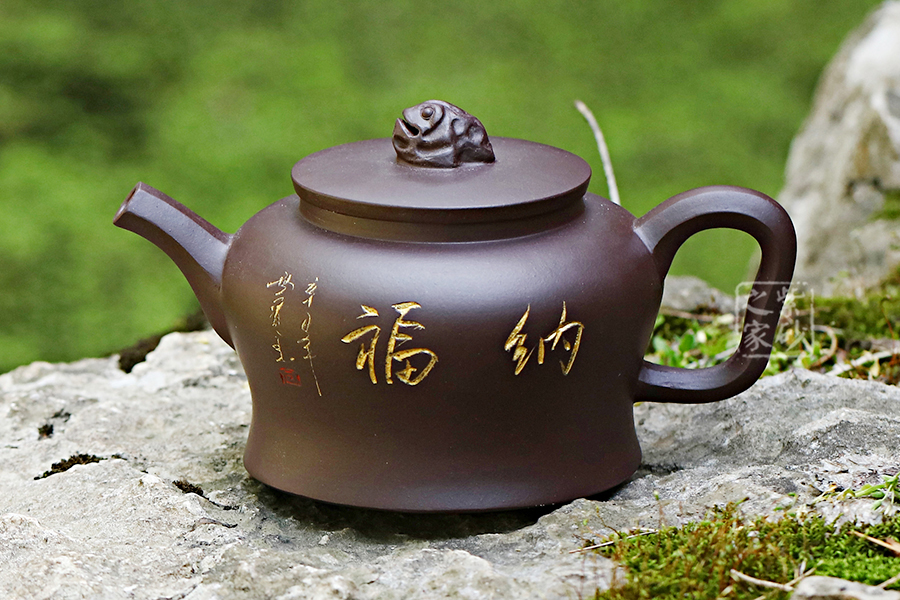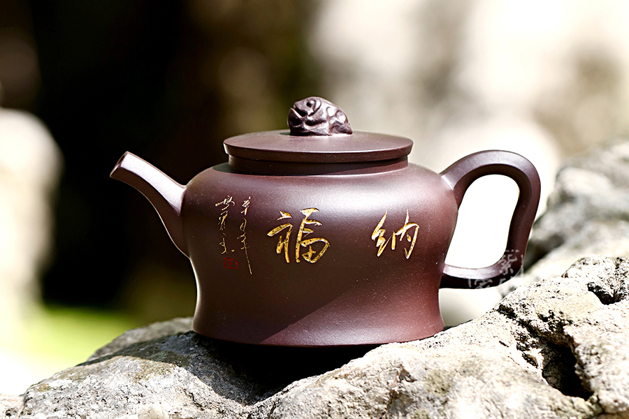 以此入壺,亦有吉祥韻味。蓋雕刻金蟾做鈕,神態(tài)威嚴,雕刻精細。壺身“納?!倍趾魬黝}。作品既不損金蟾富貴氣象,又保留了文人特有的克制,寓意招財納福。
