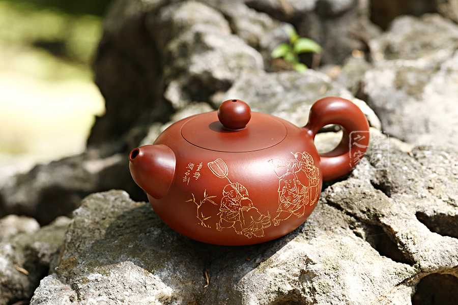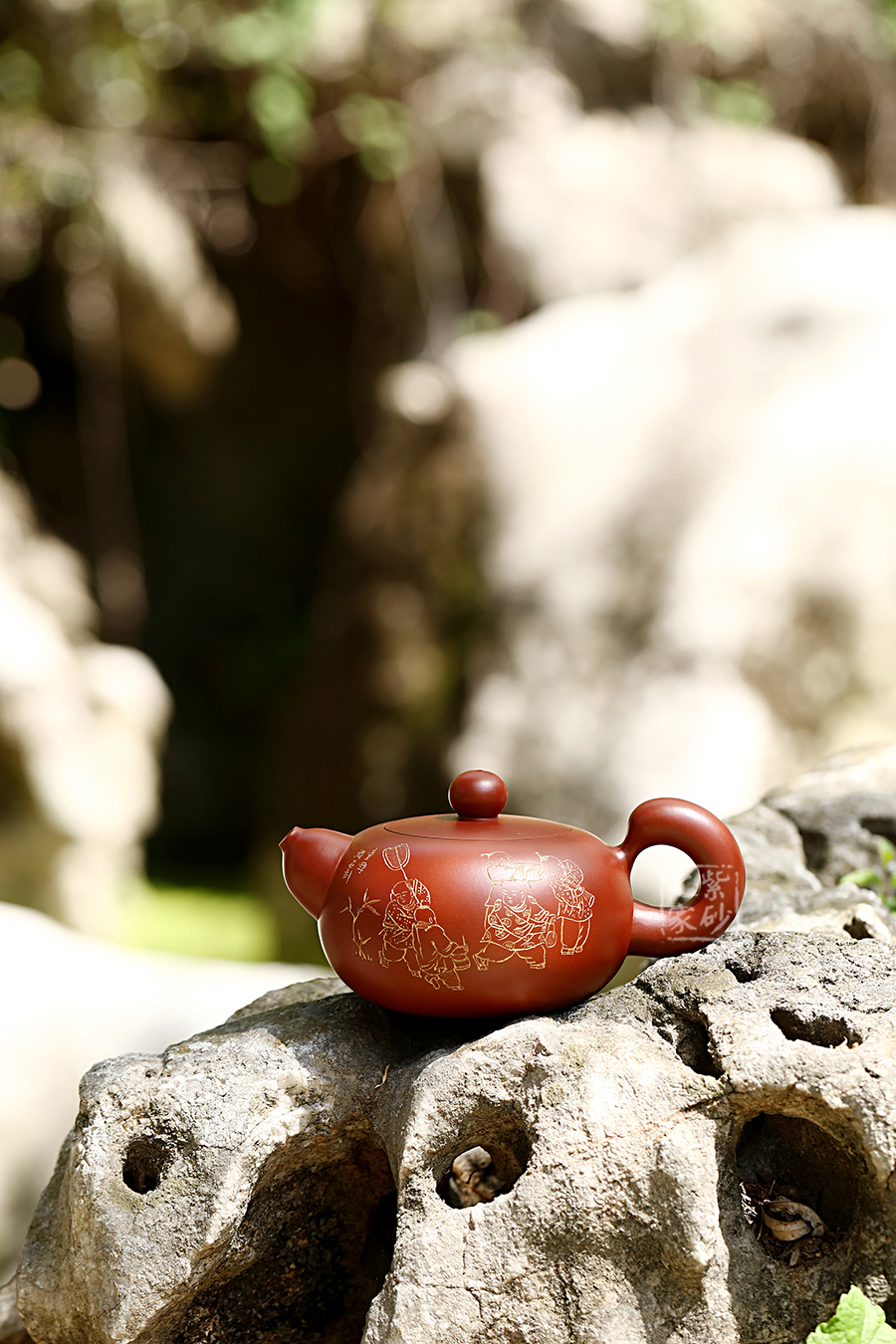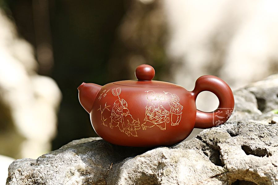 此壺選用朱泥極品——大紅袍制作而成,胎質(zhì)純而細(xì)膩。壺嘴翹起似孩子嘟嘟小嘴,率真可愛(ài)。刻繪童趣圖為紫砂壺增色不少,在壺雅韻基礎(chǔ)上又添一絲雅韻,讓人心生向往。