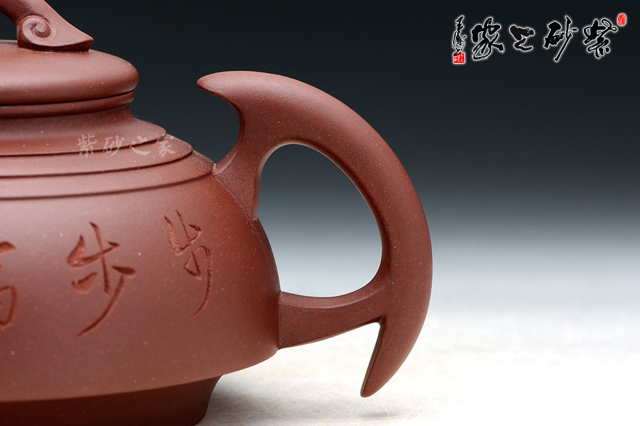 初見楊志仲老師的這款壺,其中的寓意就已然呈現(xiàn)在眼前,壺身如倒扣的碗形,順勢而上;三環(huán)肩線層層漸高;壺身正面刻繪“步步高升”四字,寓意躍然壺上;反面刻繪枝節(jié)分明的竹枝,自古以來,竹就有節(jié)節(jié)高升之意;壺鈕為橋型如意,意為萬事如意;壺嘴以龍頭飾之,去人中之龍的美意;壺把高懸的新月,更有待滿之勢;每一個部分都透露出步步高升的美意。