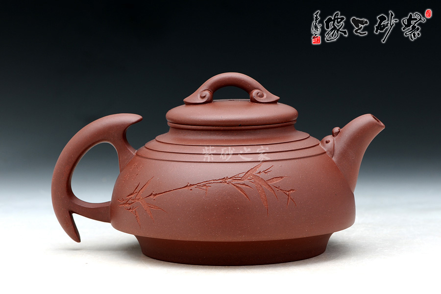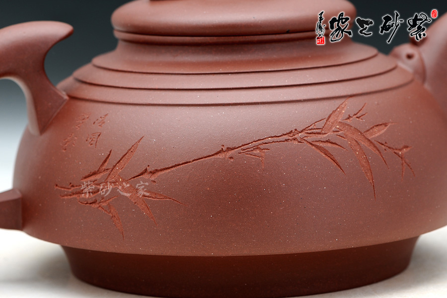 B面: 裝飾: 素刻竹枝 裝飾者:楊志仲 裝飾內(nèi)容: 壺身篆刻由陶刻大師楊志仲(悟石)操刀,反面所刻為筆直蒼翠的竹枝,竹枝清瘦而干練,骨肉勻婷,竹葉飄逸靈秀,竹在中國的文化中也象征著節(jié)節(jié)高升之意,與壺的主題相符。