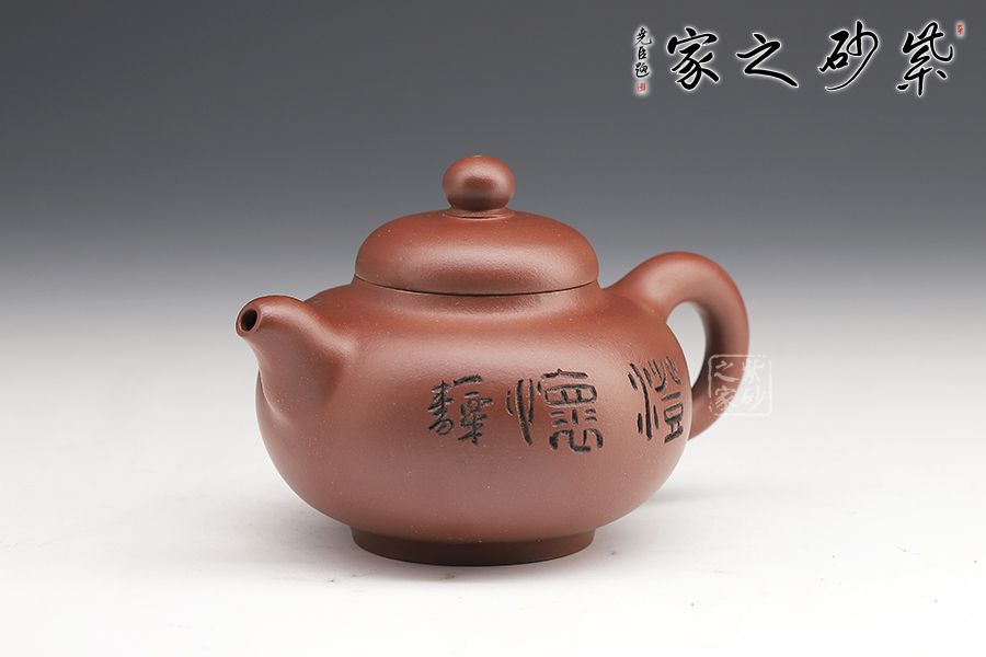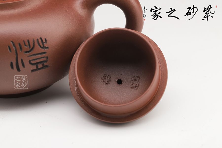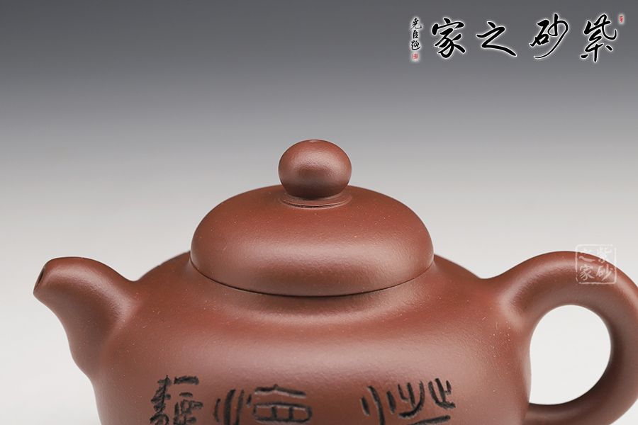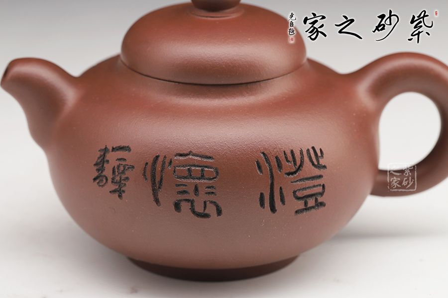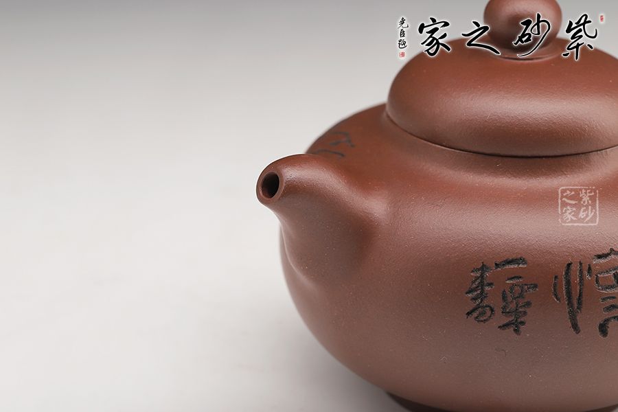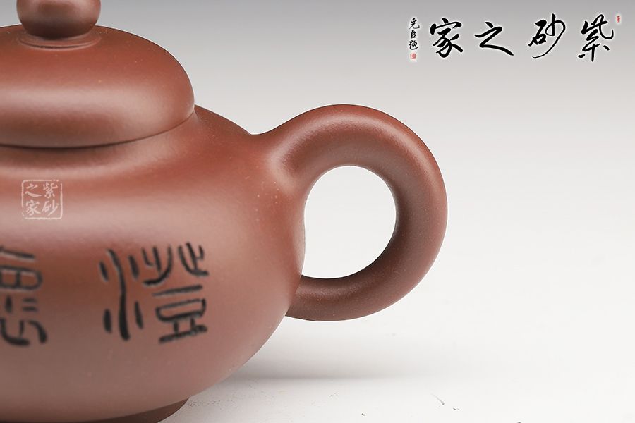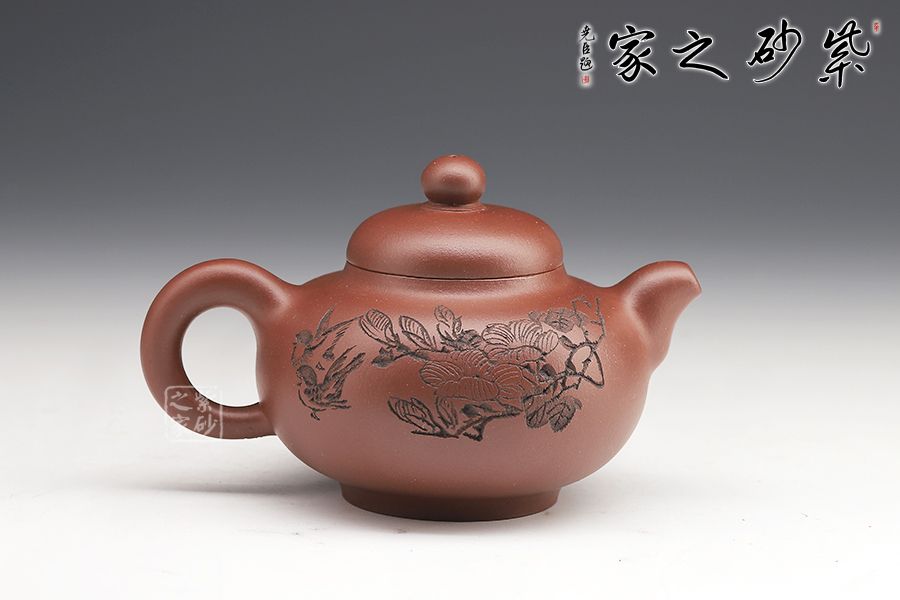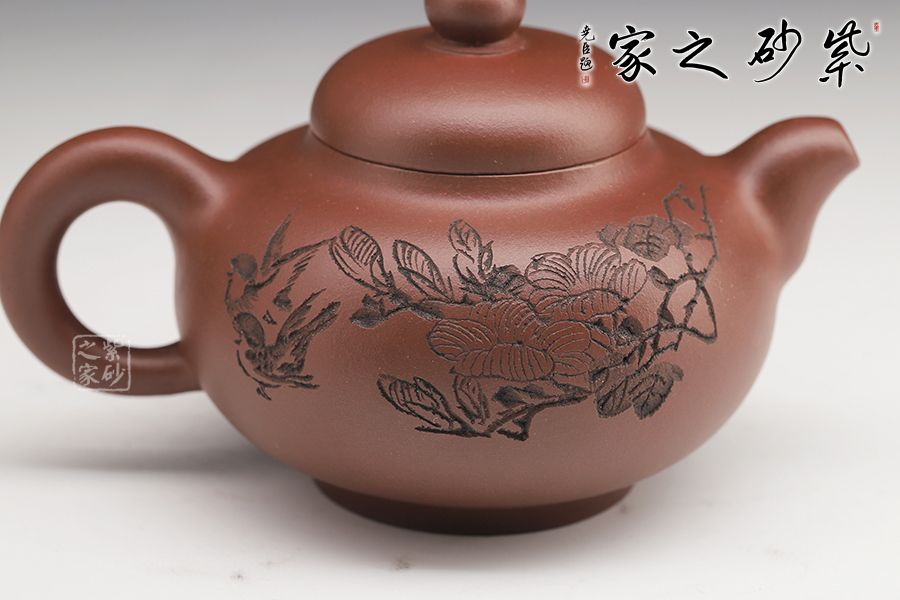 此壺壺身飽滿圓潤,圈底穩(wěn)重,壺蓋之上圓珠壺鈕玉潤,壺嘴與壺把相呼應(yīng)。壺身刻繪蒼勁,凌厲飄逸,花鳥圖刀法利落,情趣韻味高雅。毛國強大師自制自銘,值得收藏。