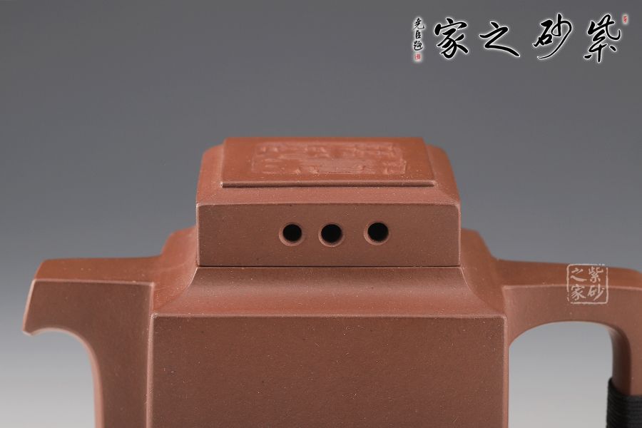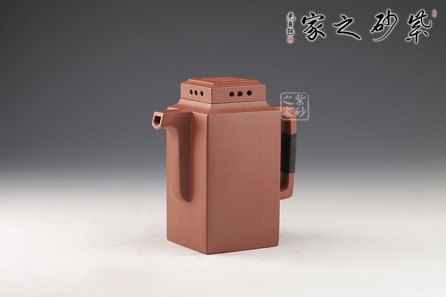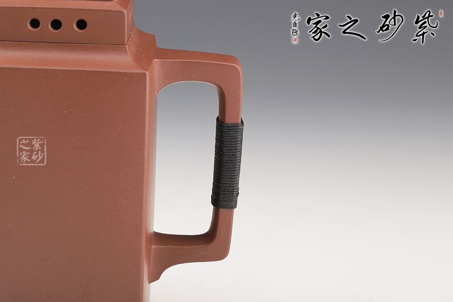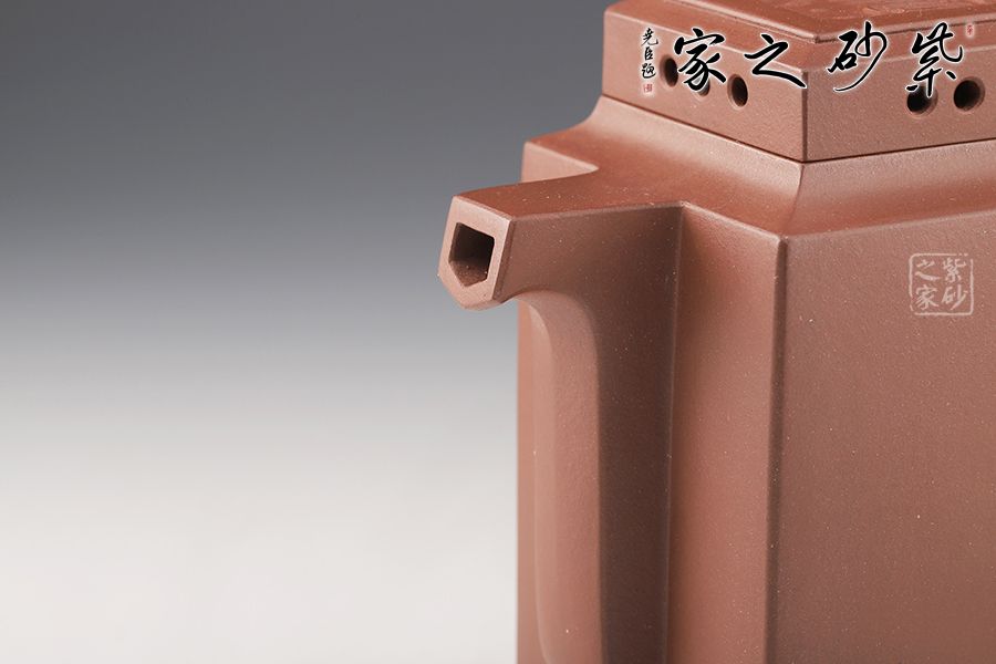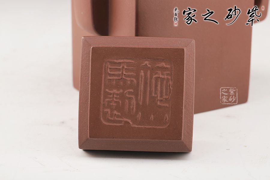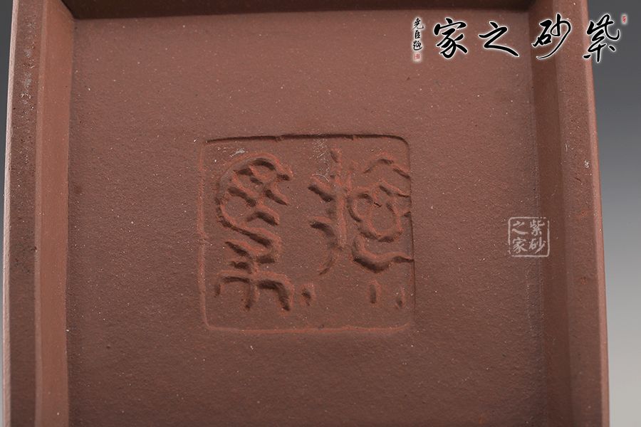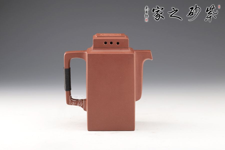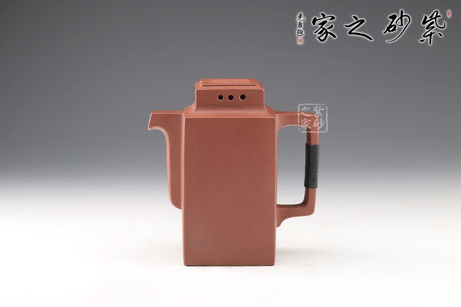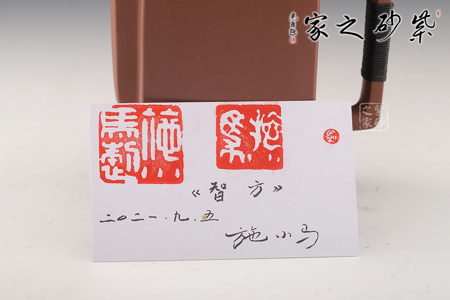 此款紫砂壺為現(xiàn)代紫砂名家施小馬先生于上世紀(jì)八十年代末期所創(chuàng)作品“智方壺”,由張守智先生設(shè)計(jì)。此壺壺身呈高長(zhǎng)方體式;由上窄下寬狀壺頸托起方形壺蓋,銜接、過(guò)渡自然、流暢,壺頸上口沿與壺蓋結(jié)合緊密、嚴(yán)絲合縫;四方壺嘴帶長(zhǎng)流、耳狀方形壺把附著于壺身對(duì)應(yīng)兩側(cè);壺蓋即壺鈕。 整壺形神兼?zhèn)洌p用俱佳,實(shí)屬難能可貴的方器精品之作,極具收藏價(jià)值。