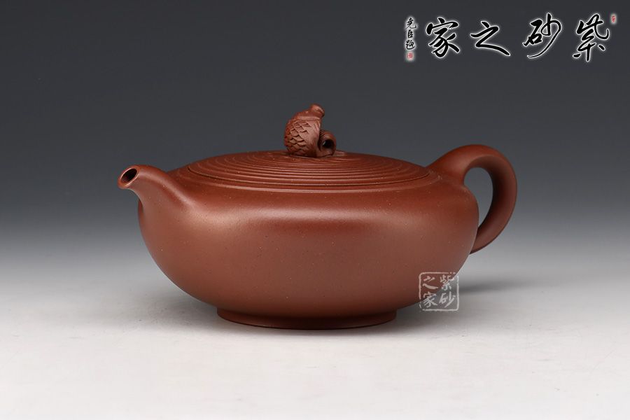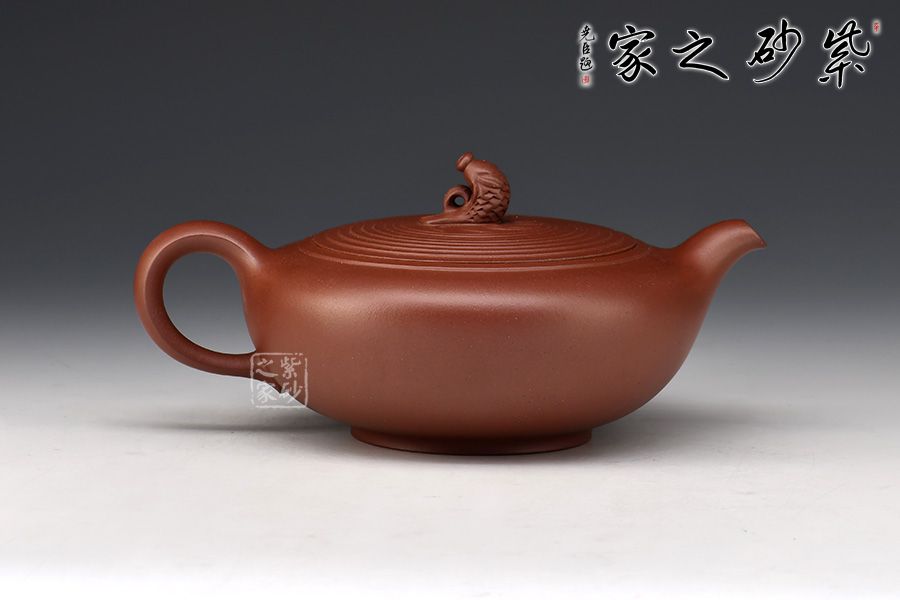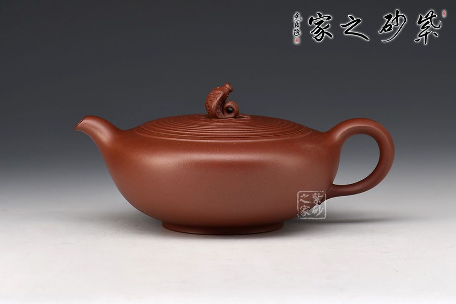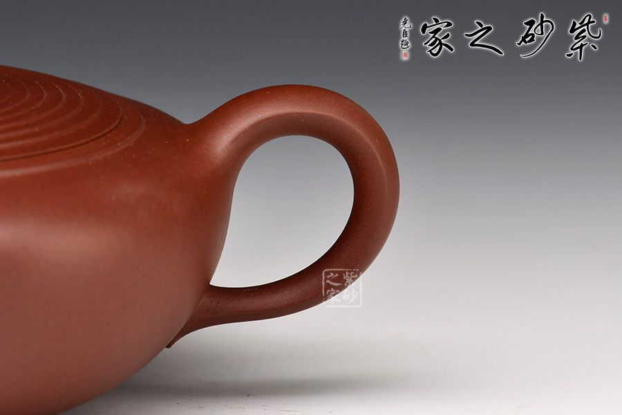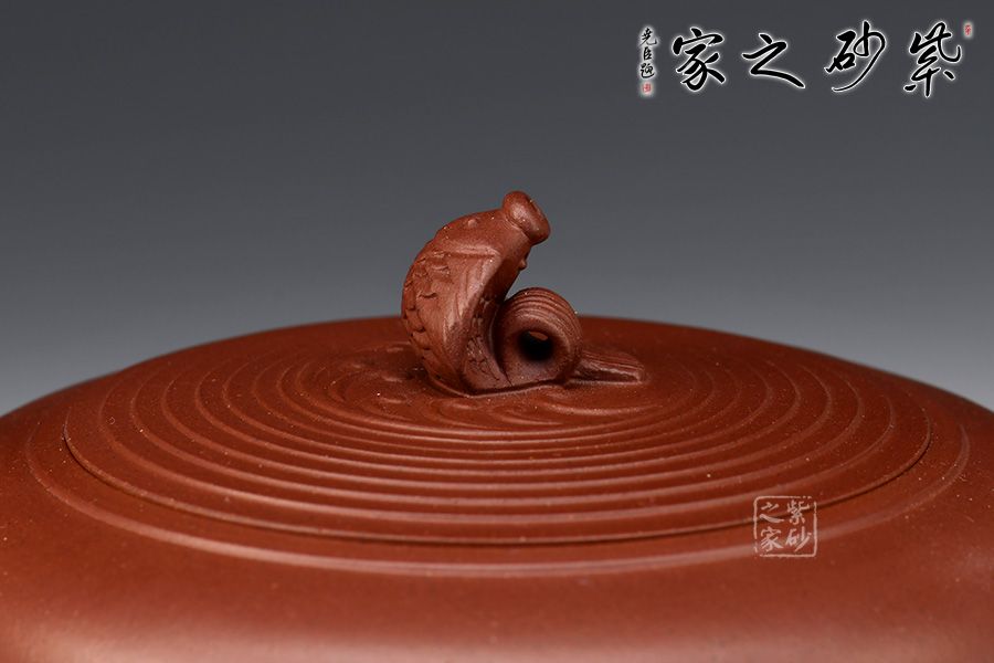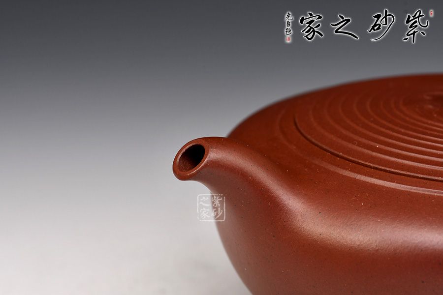 嵌蓋設(shè)計(jì),子母線隱沒(méi)在壺蓋壺肩的圈線之中,如層層波紋蕩漾開去,整個(gè)壺更加嚴(yán)謹(jǐn)精致。兩條明晰的線條從壺嘴開始,流至壺肩,最后收于飛處,氣韻流暢,晶潤(rùn)自然。