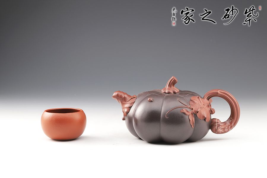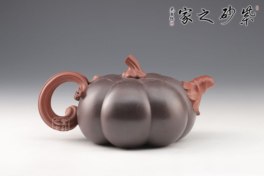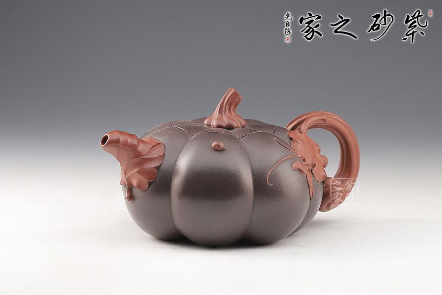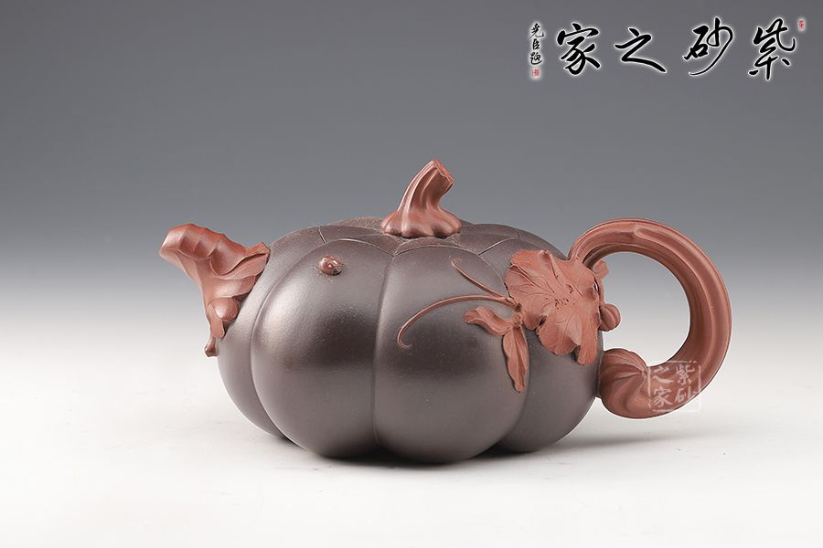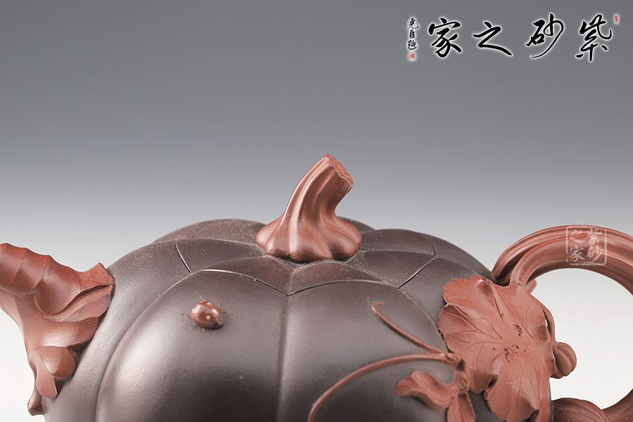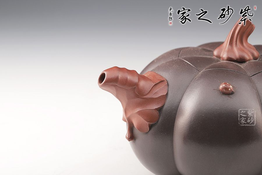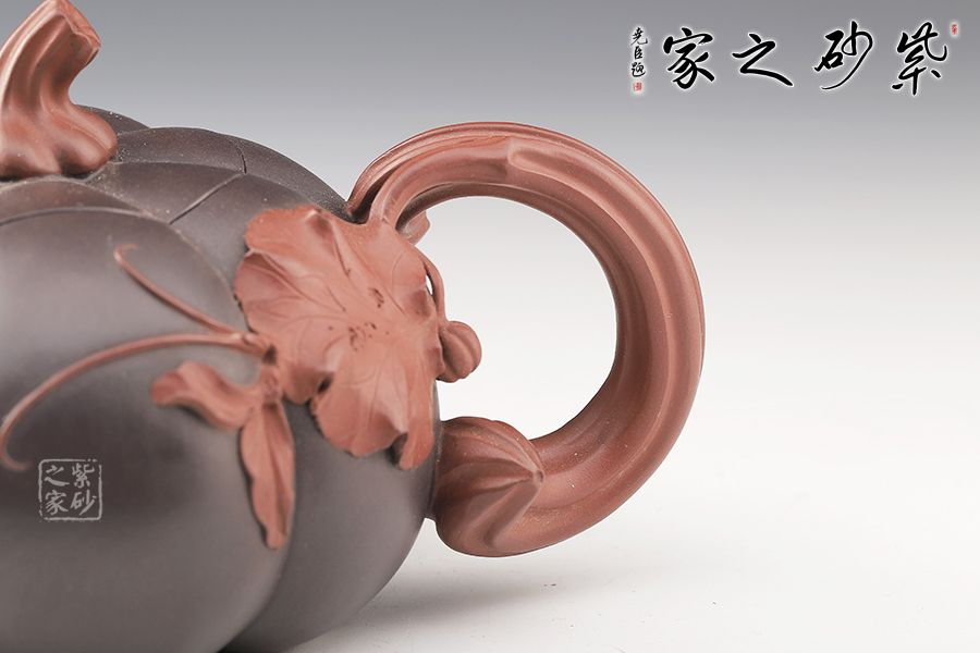此壺外形酷似南瓜,并集聚了南瓜的神韻,猶若瓜熟即將待落。壺鈕、壺把皆以南瓜藤為原型,形象逼真。壺嘴由南瓜葉包裹而成,精巧別致,創(chuàng)意極新。整壺趣味天真,意趣盎然。
