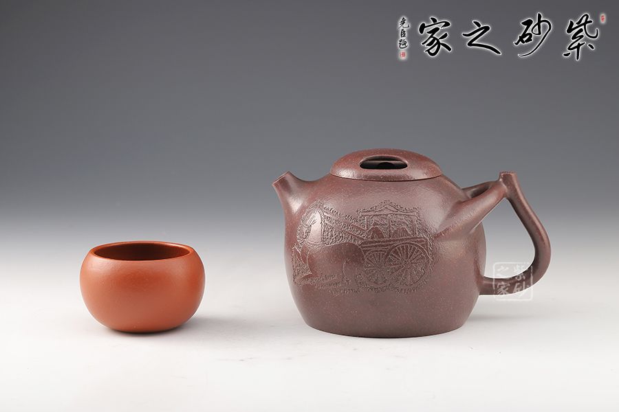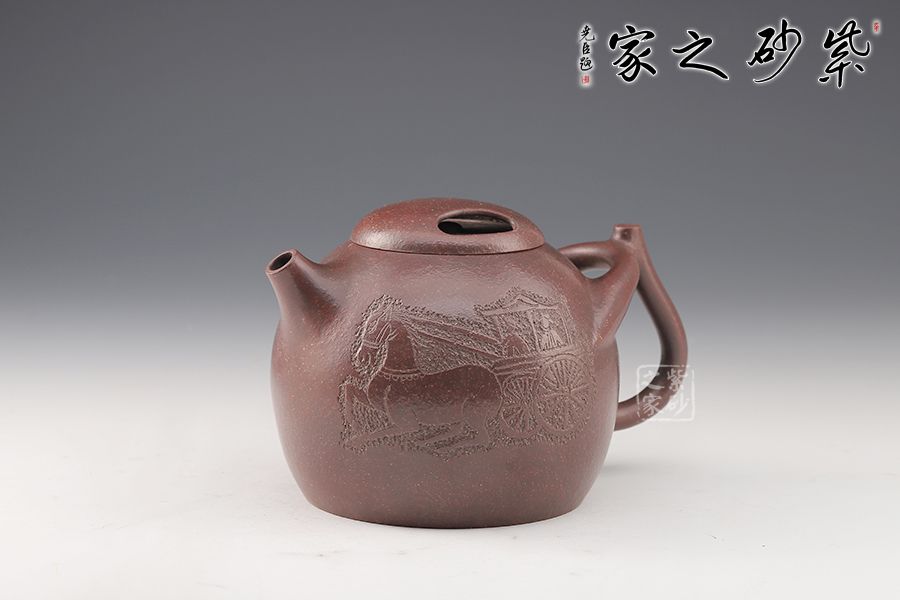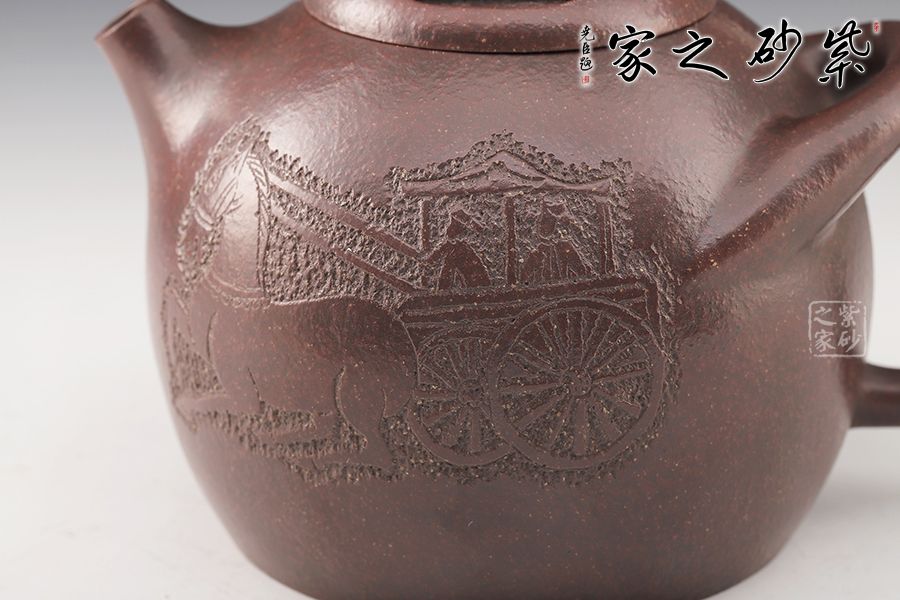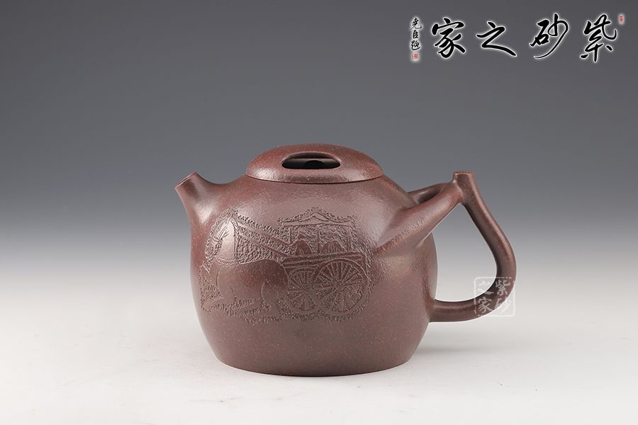 壺身刻繪古代磚繪馬車元素,以及酒爵,別具一格,此壺手中在握,博古賞用,是為上品。