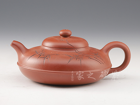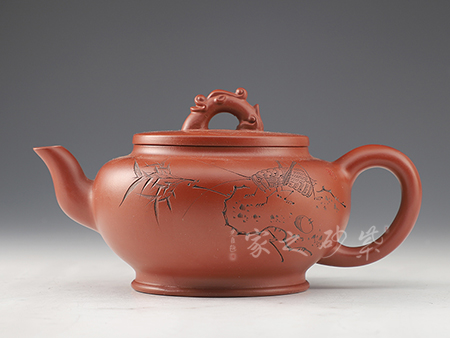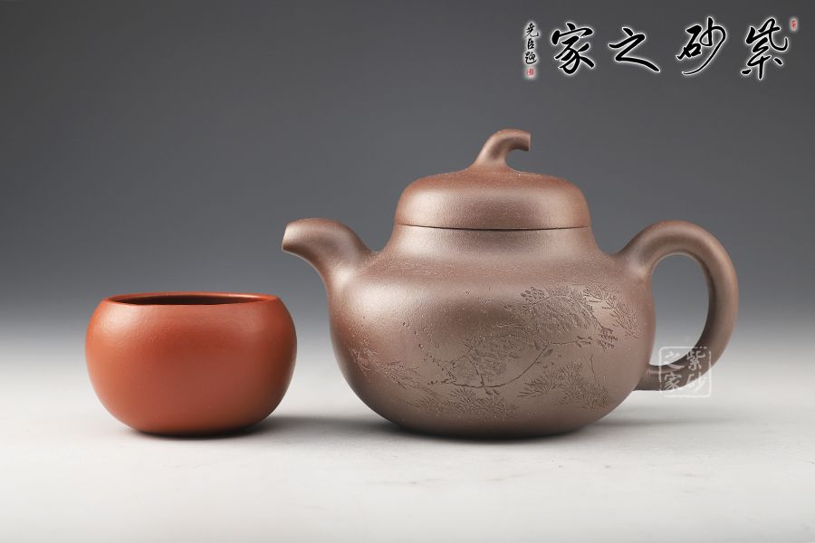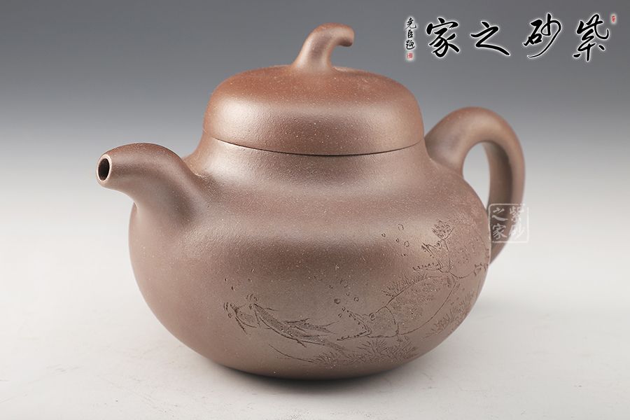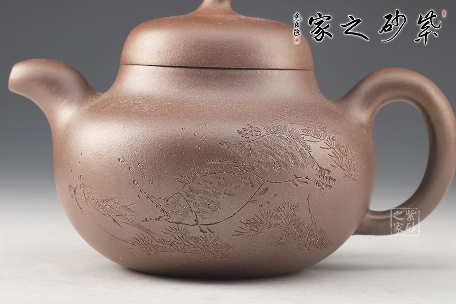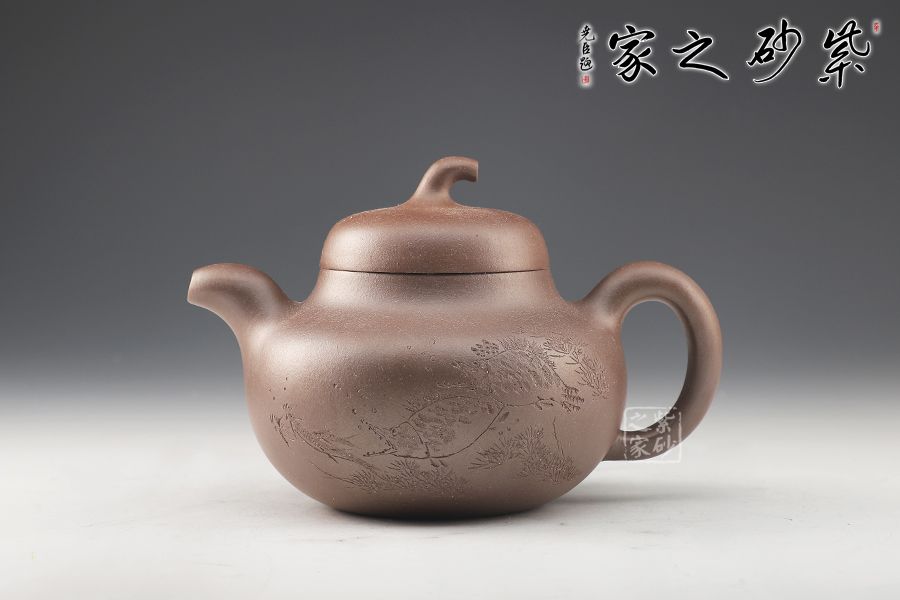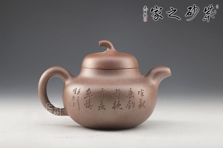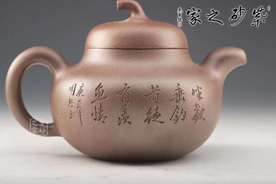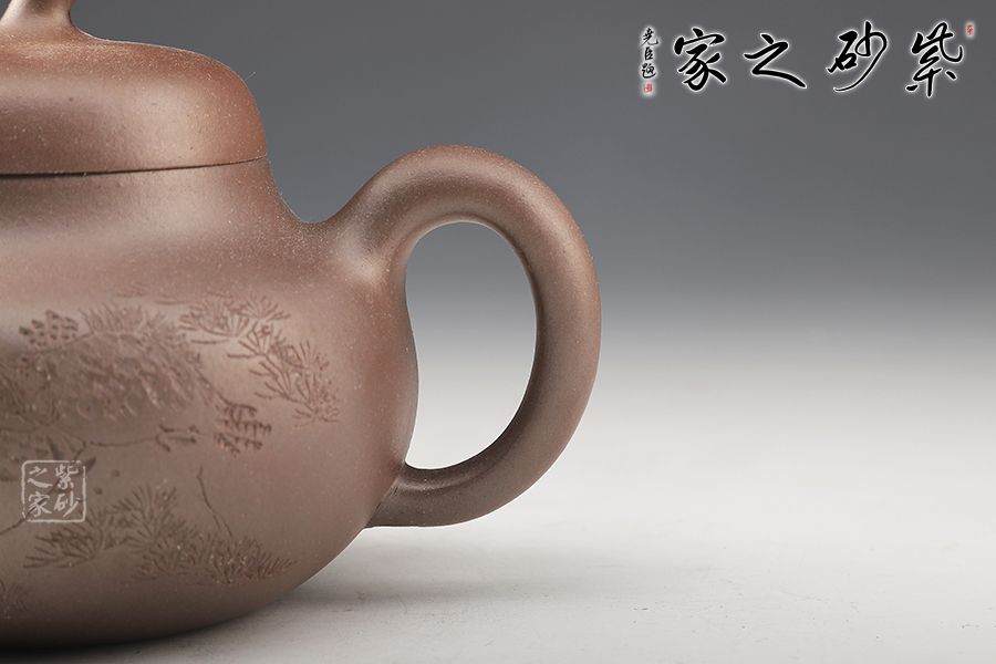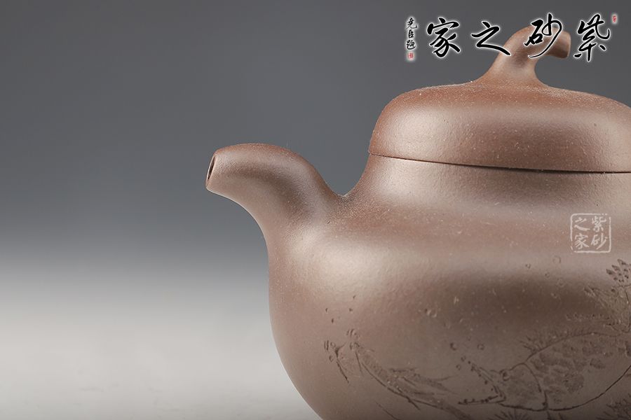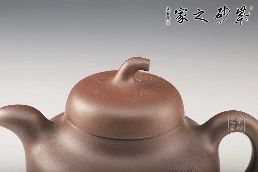 此壺為原礦黃金段柴燒,泥質(zhì)醇厚,色澤古穆。這款茄段的美妙之處在于似真似幻,在具體和抽象之間輪轉(zhuǎn)。以生活中常見的茄子為型,用圓潤的線條勾畫出茄子的動(dòng)態(tài)之美,與常見的茄段不同此款造型憨胖,敦實(shí)厚重,沉穩(wěn)有力,壺鈕為如茄蒂,逼真自如,流與把俊俏有力,舒暢自如,工藝精到。壺面刻繪溫婉動(dòng)人,讓人品壺之余,不禁身臨其景!