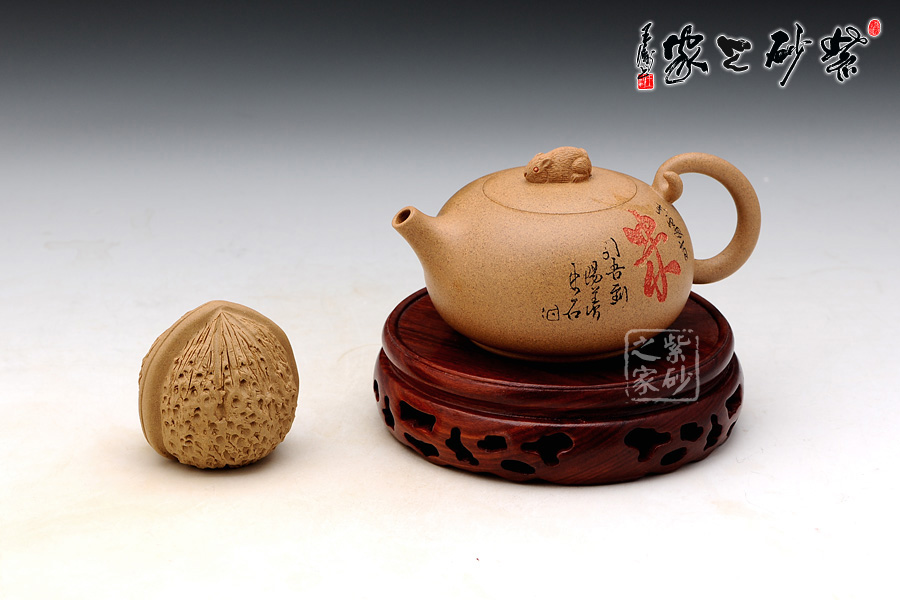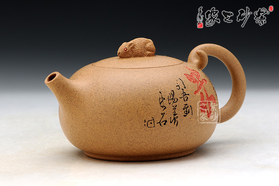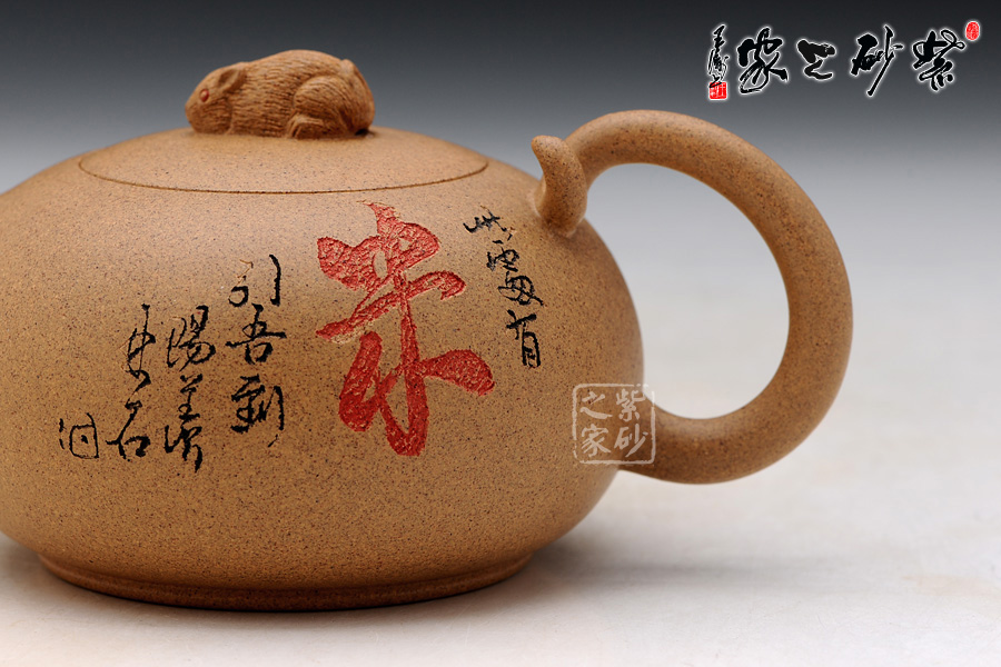 一只目光炯炯有神的小鼠伏與壺蓋之上,靈氣逼人,非常的可愛。尤其別出心裁的是壺柄的設(shè)計(jì),蜿蜒曲折,形如鼠尾,短而精巧的小嘴與其相呼應(yīng),相得益彰。壺身上刻有書法曰:“此處有米引吾到”陽羨藝石。