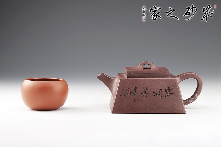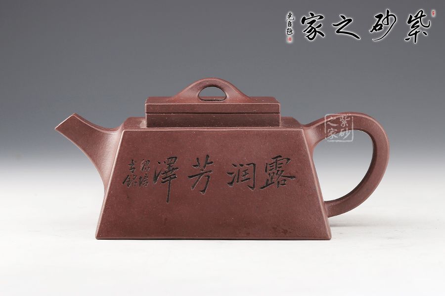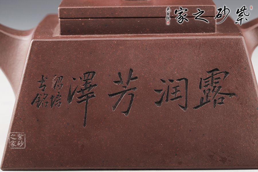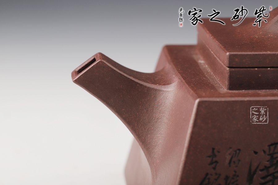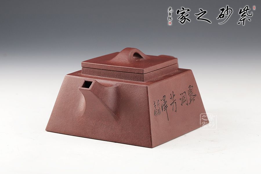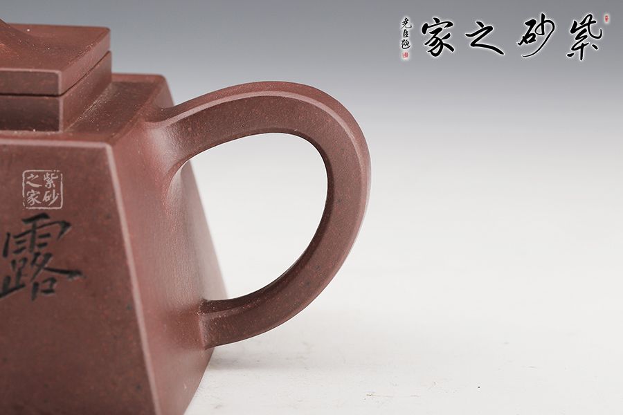 此款方升壺器型簡(jiǎn)潔明快,此壺四方基底,下寬上窄,具備方壺穩(wěn)重剛強(qiáng)的優(yōu)點(diǎn),又不流于呆板單調(diào)。全器表現(xiàn)出剛?cè)岵?jì)的美感,足見作者已掌握制壺精髓,能于不變中求變,正是對(duì)制壺者最大的考驗(yàn),作品表現(xiàn)出堅(jiān)實(shí)陽(yáng)剛之氣。
