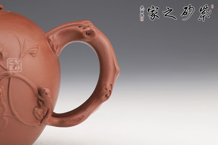 整壺呈圓形,壺蓋作內(nèi)嵌式,蓋頂與壺身沿口契合緊密,壺蓋面呈圓形,中部微隆,提鈕作折枝樣式,其上樹皮雕琢精細(xì),折枝造型經(jīng)兩段彎折接于頂蓋之上,壺蓋正面一端雕繪葡萄藤枝,上繪三五葡萄,另端圓雕一松鼠湊近聞嗅,松鼠造型小巧可愛,雙眼渾圓富于靈秀之氣。壺身一側(cè)作三彎式流嘴,仿枝干造型,流嘴根部一側(cè)于壺壁之上雕琢松樹葡萄圖案,其上描繪一松鼠正攀爬于藤枝之上,向葡萄果實(shí)爬去。流嘴對面設(shè)半圓形執(zhí)把,與提鈕、流嘴相互呼應(yīng)亦仿作枝干狀,執(zhí)把一側(cè)雕繪兩只松鼠,其中一只已經(jīng)靠近葡萄珠串,另一只則正沿藤枝向其爬去,三處所雕松鼠雖造型各異,卻均呈現(xiàn)出其機(jī)靈生動之姿,惹人喜愛。