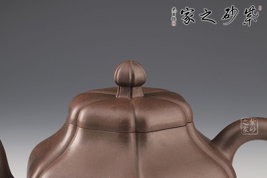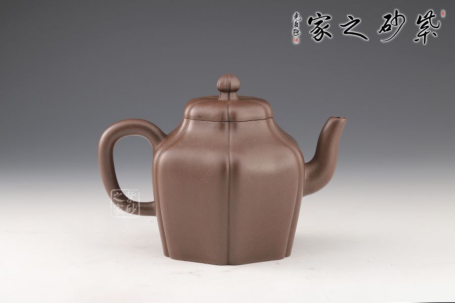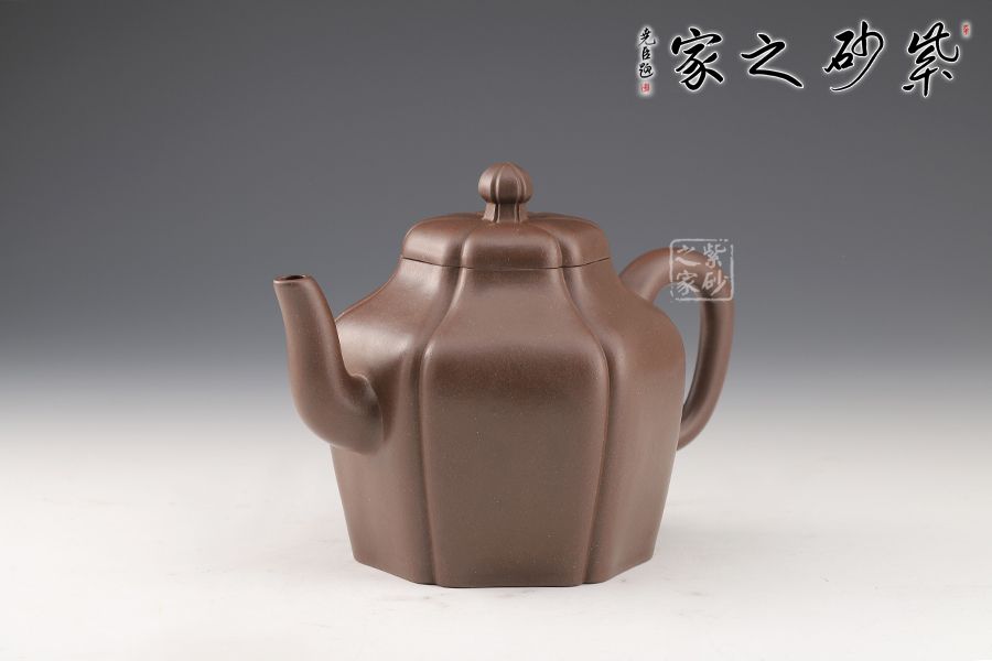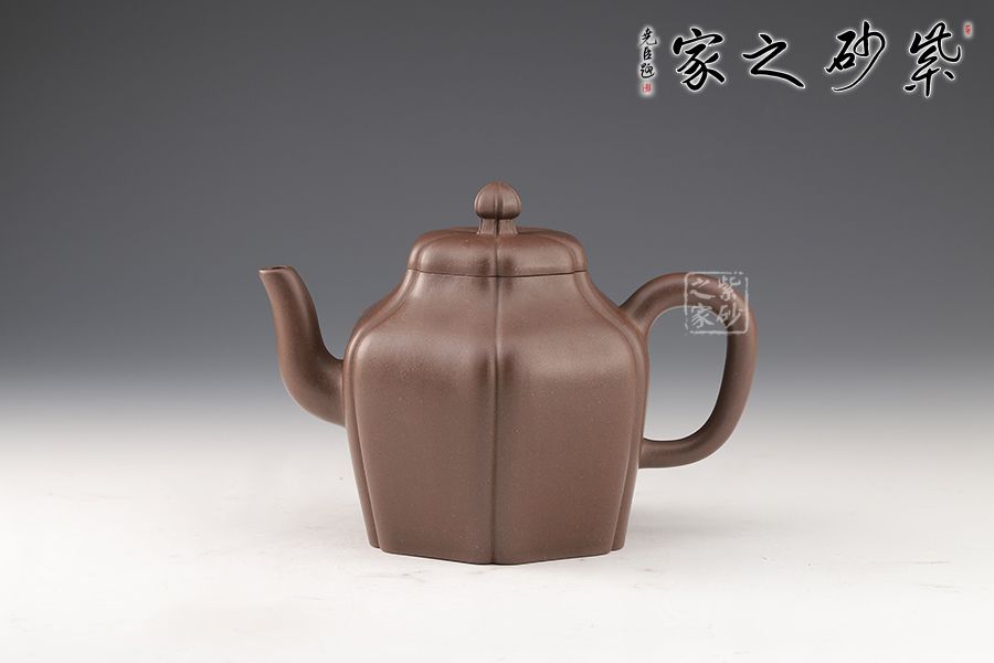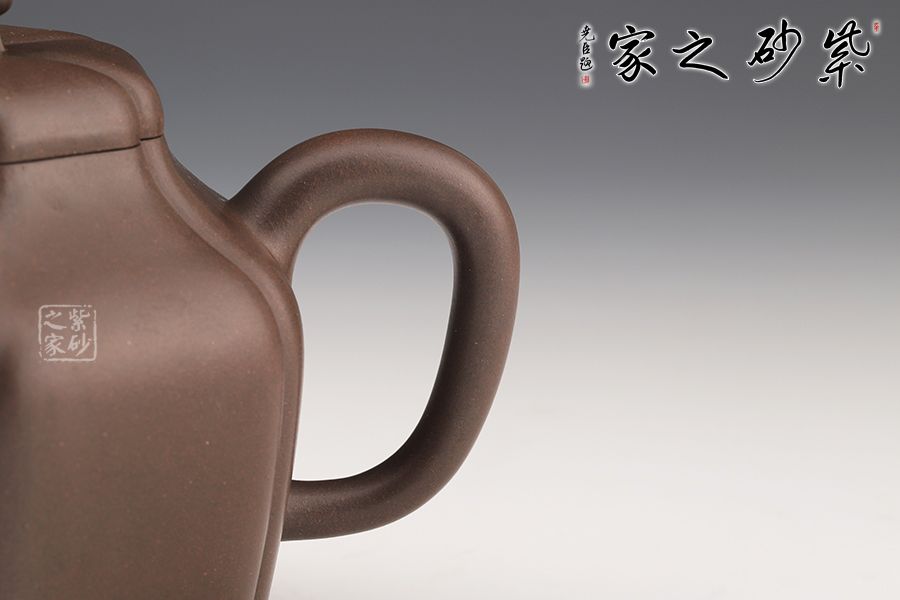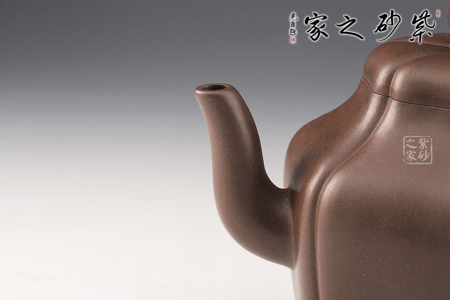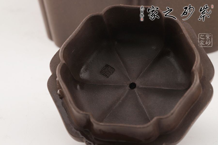 這款壺做工精細,成型難度極高,極具收藏價值。此壺六方造型溫潤大氣,富有靈氣,既有方器的挺秀,還有圓器的柔和,更有筋紋器的和諧對稱。壺身從壺鈕至壺底被均等分為六部分,線條流暢,輪廓分明。壓蓋氣密性極佳,茗香不散。三彎壺嘴上翹,更添祥瑞,與壺把遙相對應,和諧之美盡顯。壺體色澤厚重深邃,極具文化魅力。