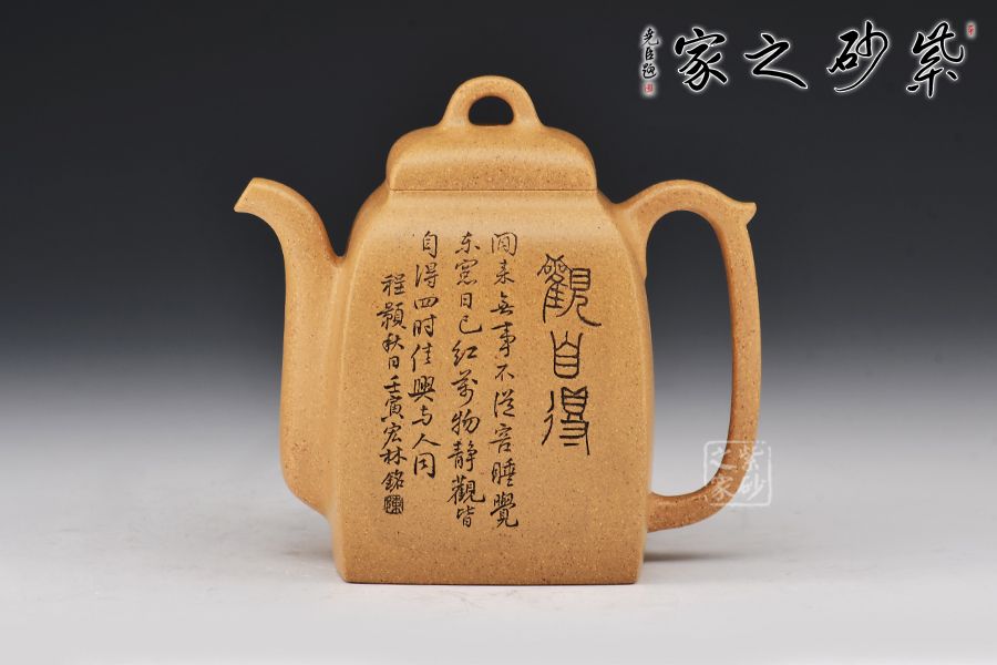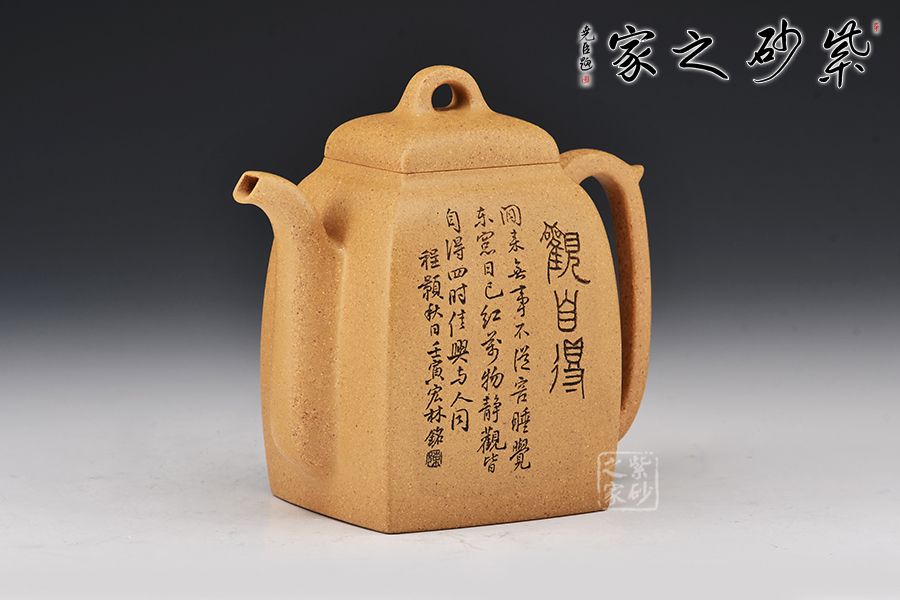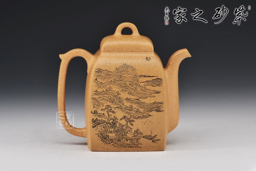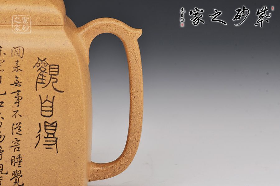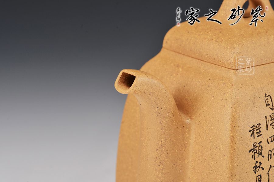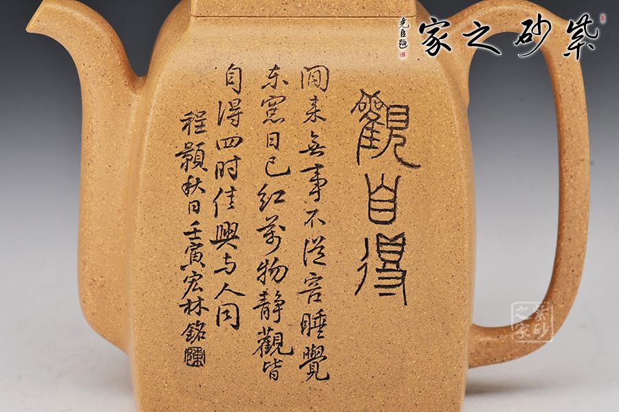 該壺采用刻繪裝飾工藝,雙面刻繪,詩詞與山水畫相結(jié)合,意境十足