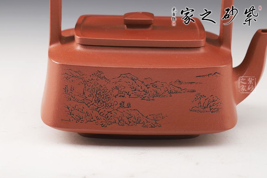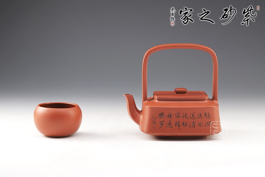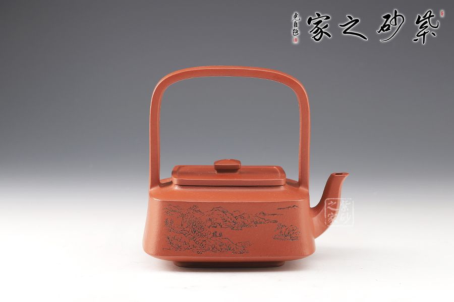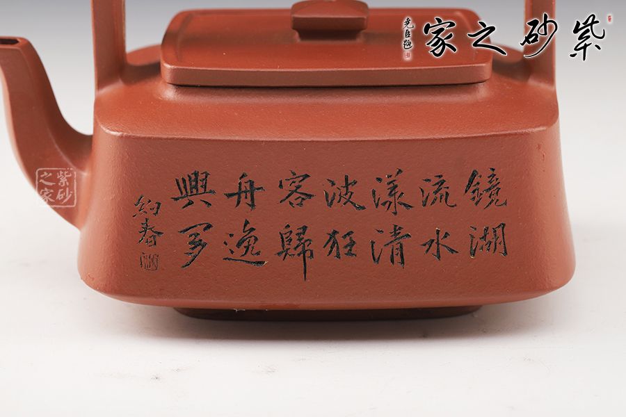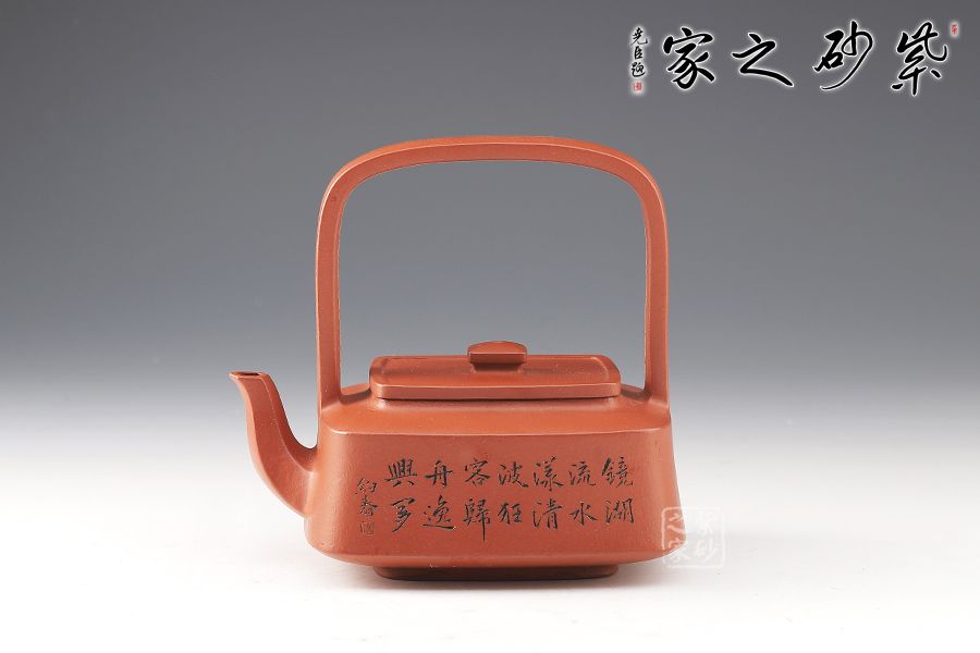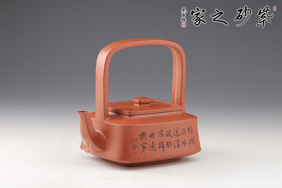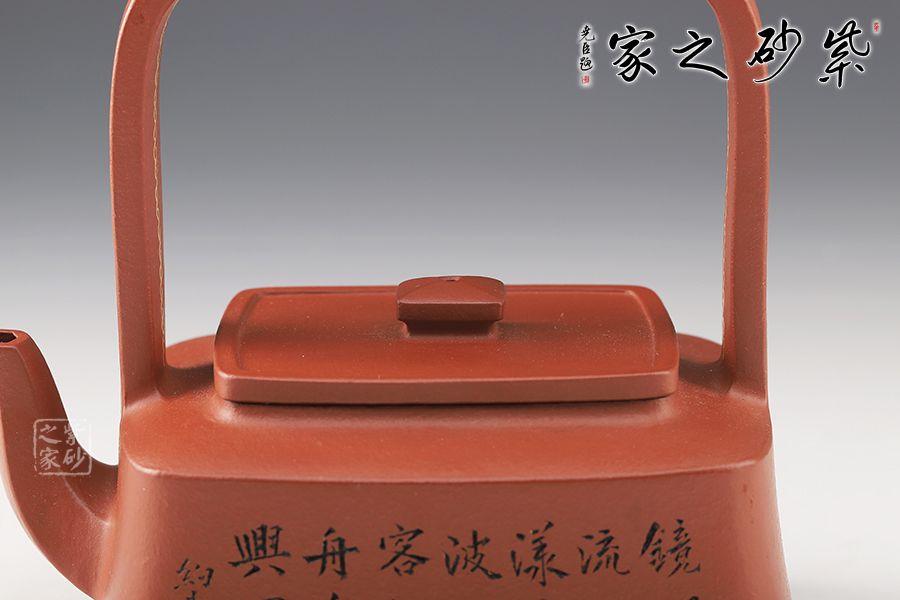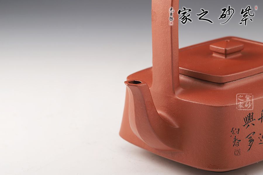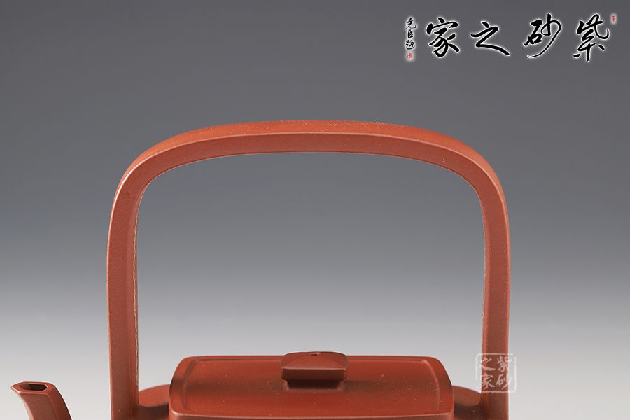 提壁壺是紫砂壺的經(jīng)典造型之一,此壺改圓為方,方中寓圓,壺體呈扁四方狀,平蓋扁鈕,與壺體上下呼應(yīng)。壺流自壺腹胥出,以棱線飾之,延伸至壺面,寬柄提梁凌空拔起,與壺體產(chǎn)生虛實對比,氣勢十足,襯托出全壺之大將風(fēng)范。整器剛?cè)岵?jì),和諧勻稱,是一把欣賞、把玩、實用的佳作。