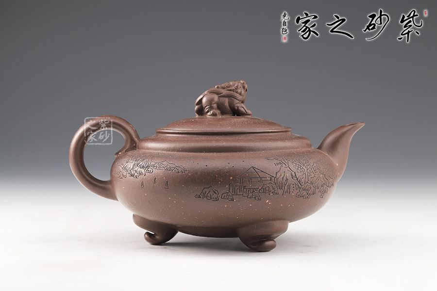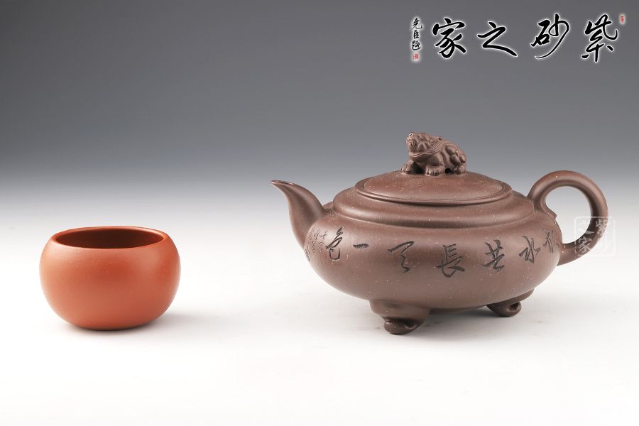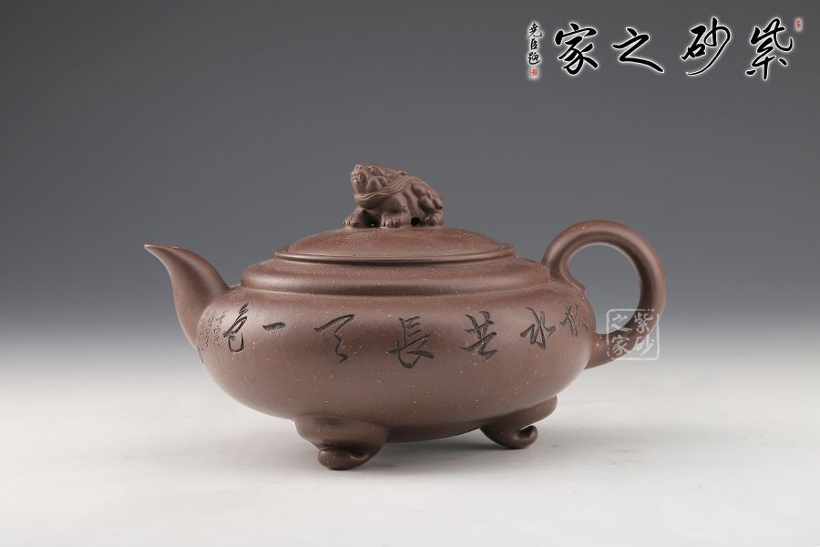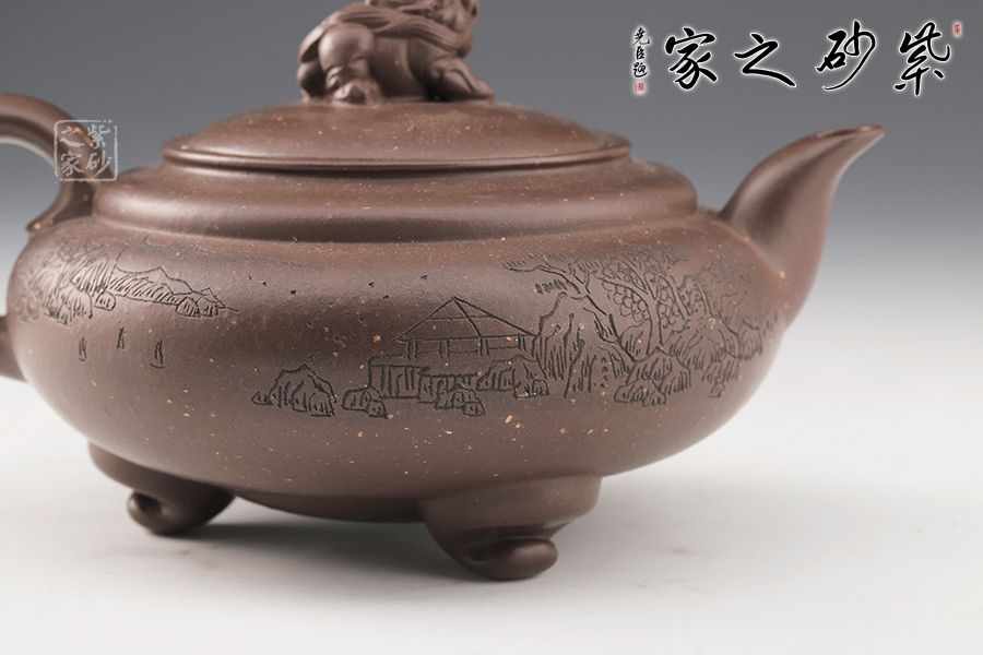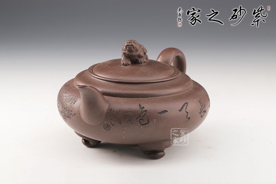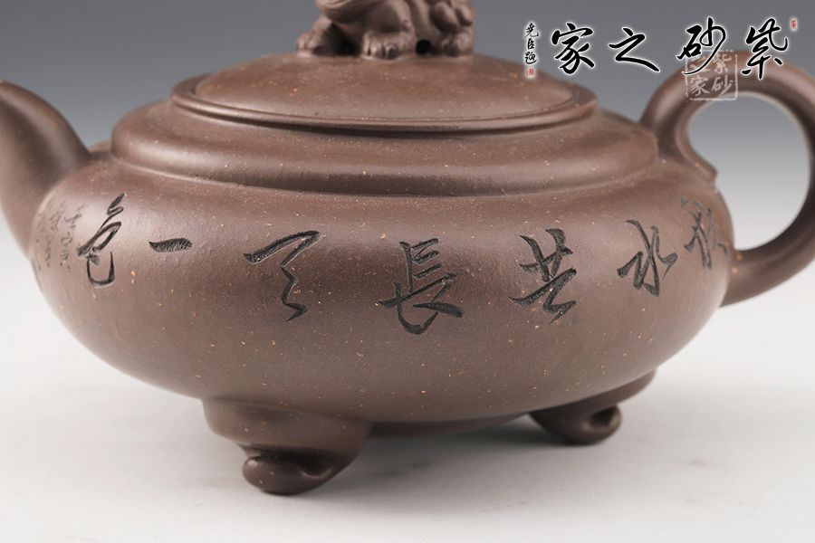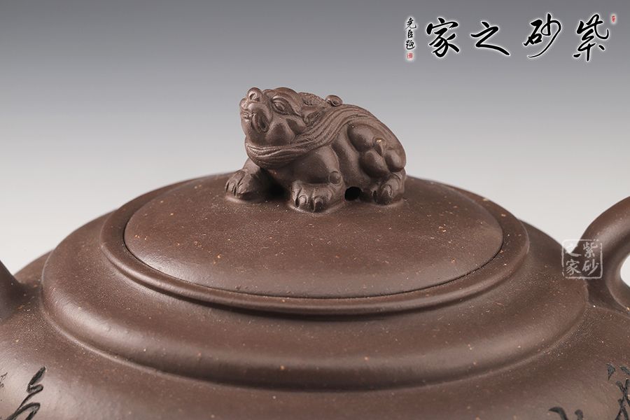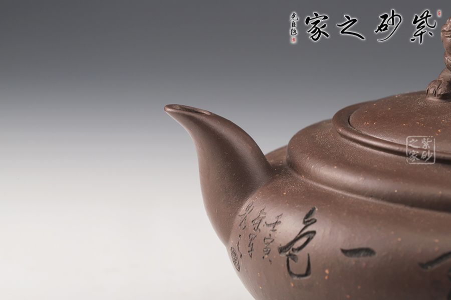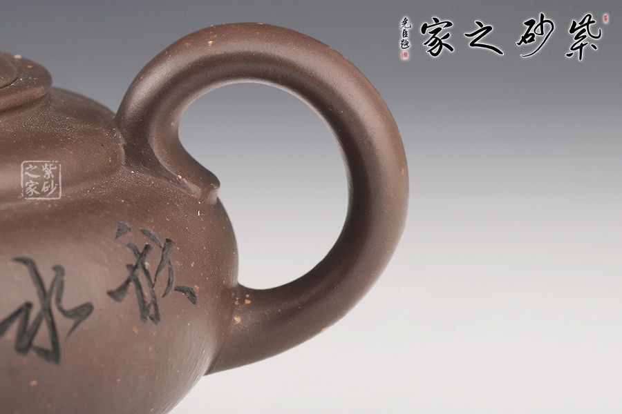 此壺以球體為基本造型,古樸雅致,為世人所喜愛(ài)。此壺色澤清亮,明潤(rùn)柔和,手感頗好。從器型來(lái)看,此壺球腹,矮頸,彎嘴耳把,頗具風(fēng)味!半球形蓋,雄獅鈕,子母線口蓋溫和嚴(yán)密,骨肉亭勻,簡(jiǎn)練大方,制作頗見(jiàn)老師深厚制壺功力。