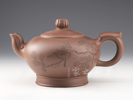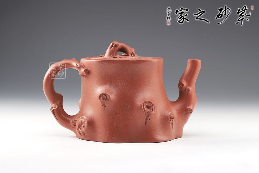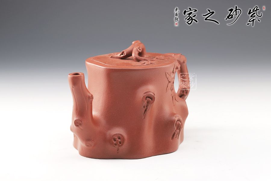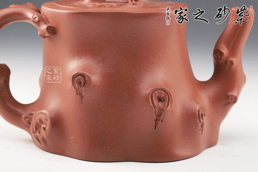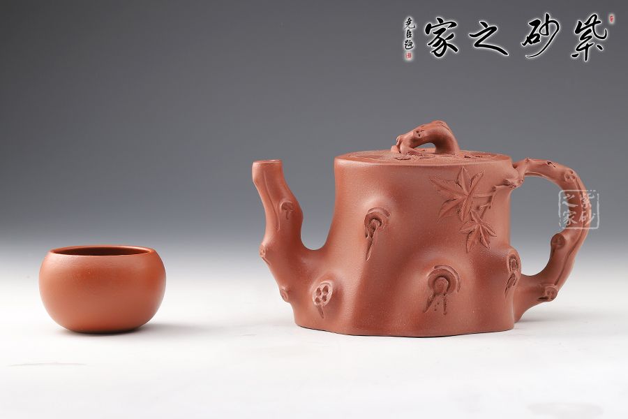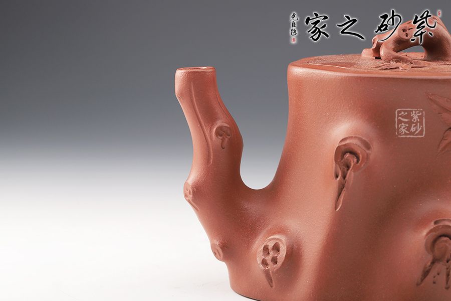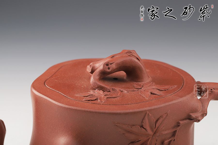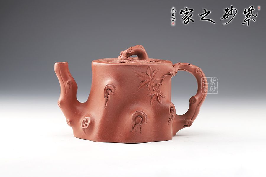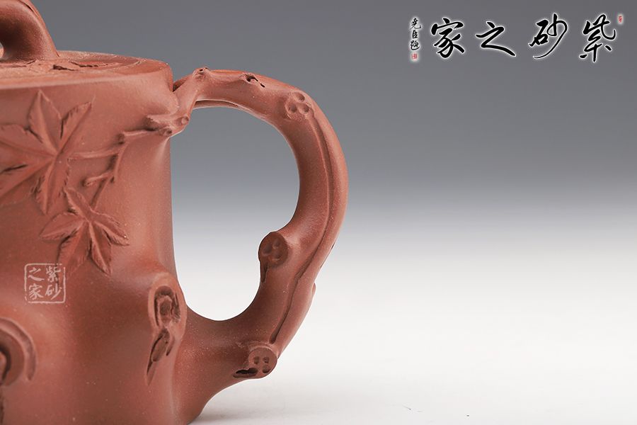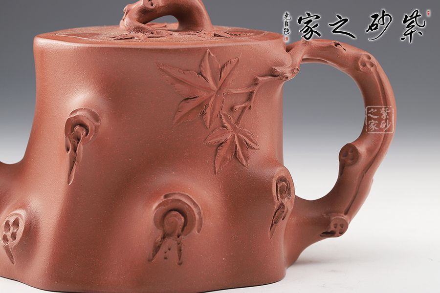 “樁”系花器造型,壺身造型如樹樁一段,樹皮褶皺紋理自然,斷枝疤痕形象逼真,達到花塑器的“象形”標準。壺把、鈕也呈枝條狀,壺把一側(cè),斜長出一枝,楓葉舒展自然,形象自然。壺鈕為一只枝干,仿真形象。