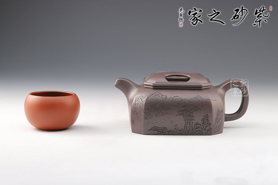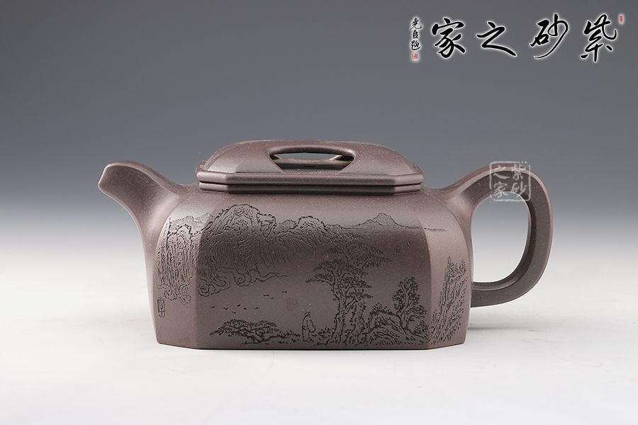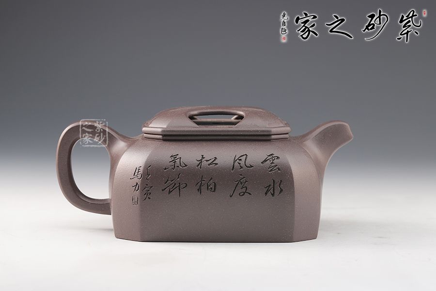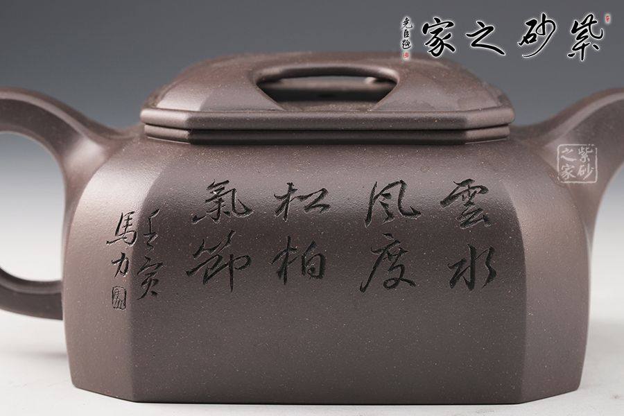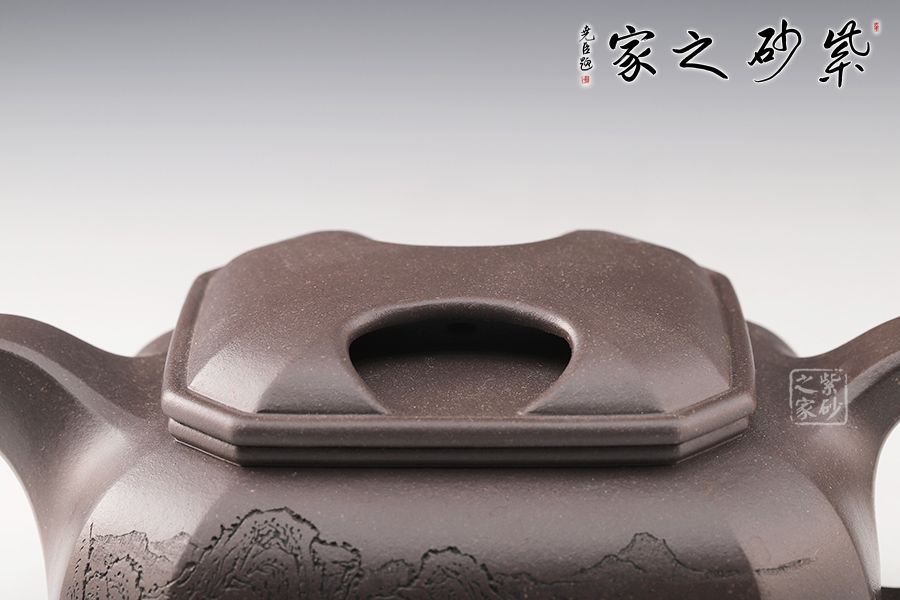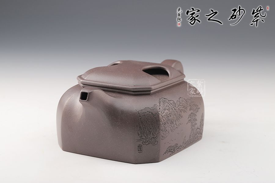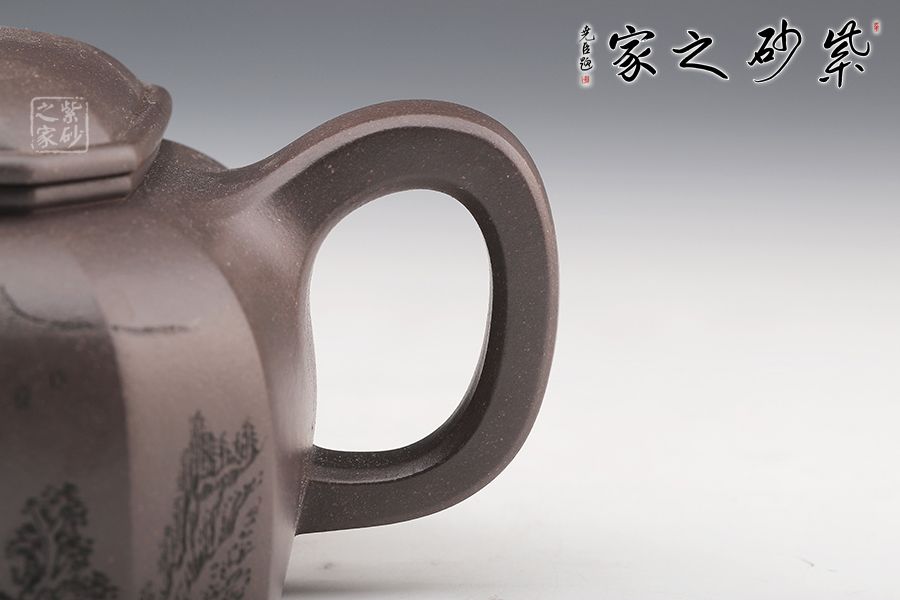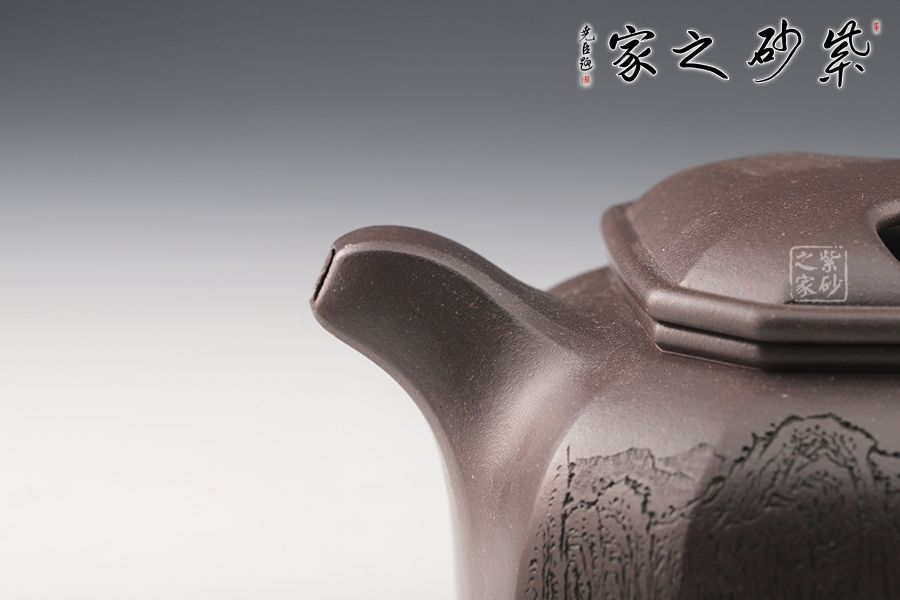 此壺選用天青泥精制而成,泥色古樸雅致。整器為八方抽角造型,線條簡潔有力,牛蓋設(shè)計磅礴大氣。彎流挺拔上揚(yáng),出水爽利,耳把剛?cè)岵?jì),把握舒適。整壺制作精美,弧度分明,于方圓之中顯氣魄,刻繪裝飾,更添韻味,是一把欣賞、把玩、實(shí)用的佳作。
