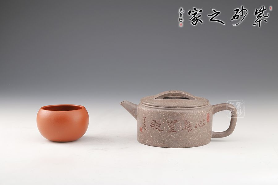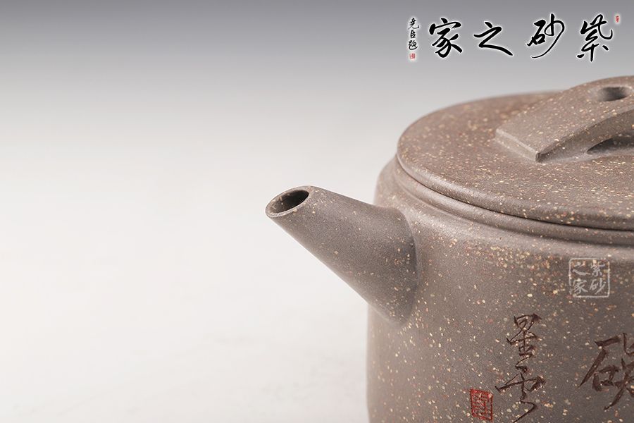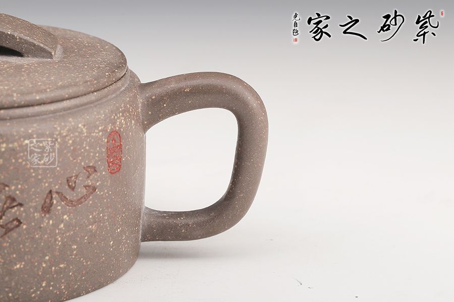 整器以簡(jiǎn)潔的線條勾勒出淳樸凝重的形體,深厚且具神韻。壺身呈矮圓柱形,渾厚沉穩(wěn),大口蓋壓口平整有力,投茶爽利。橋鈕、彎流、耳把剛?cè)岵?jì),比例和諧,相得益彰。