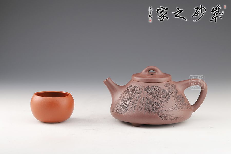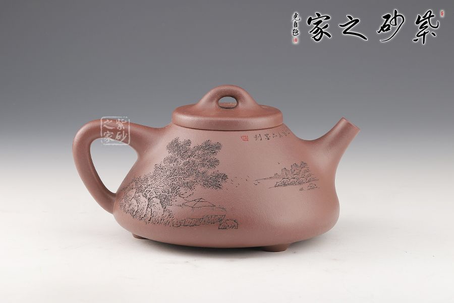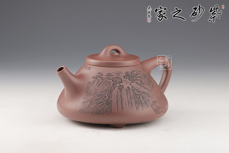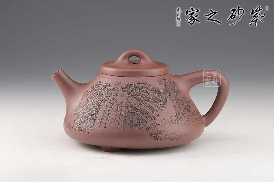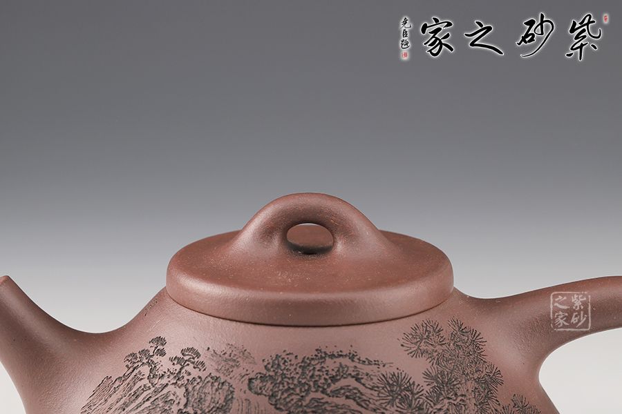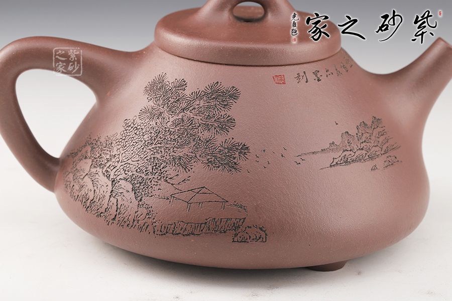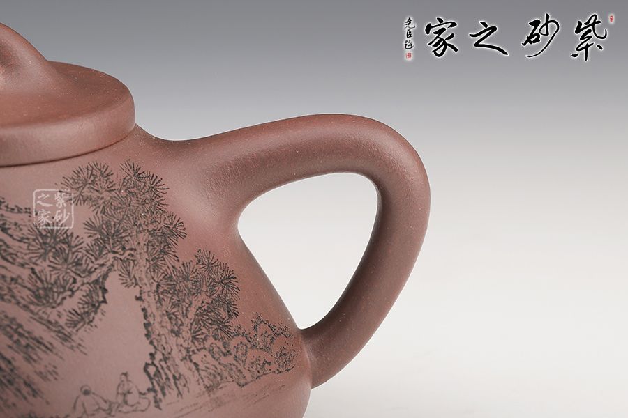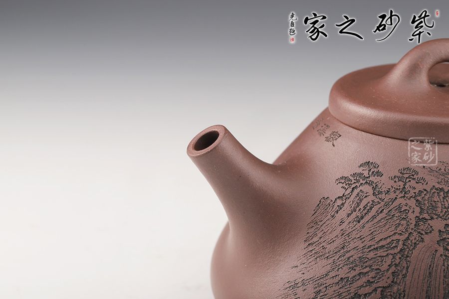 此壺為作者摹古而作,取經(jīng)典子冶石瓢之型,精選原礦紫泥,全手制作而成,泥色溫潤淳厚,完美襯托石瓢之古樸氣質(zhì)。整體造型簡約大方,壺身呈金字塔形,豐潤飽滿,壓蓋之上以橋鈕裝飾,直流簡而有力,出水順暢,壺把呈倒三角勢,與壺身之型互補,形成和諧的美學(xué)效果。壺身陶刻山水,工藝精巧,刻畫入微,是一把使用、賞玩皆宜的文人壺佳作。