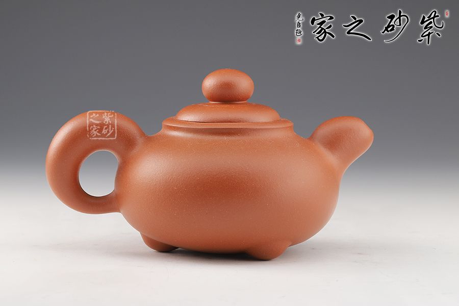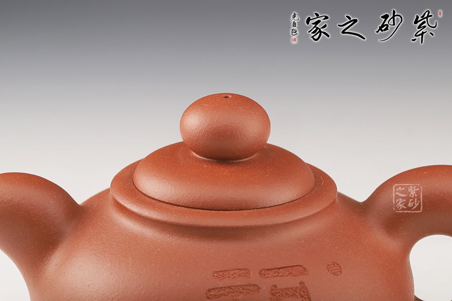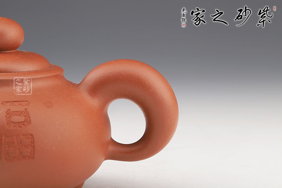 壺體飽滿,壺蓋穹起飽滿的弧度,圓珠壺鈕綴蓋頂,一彎流與圓耳把造型憨厚樸拙。