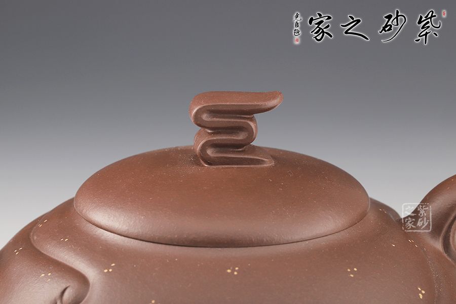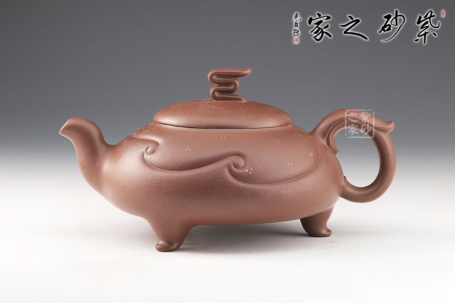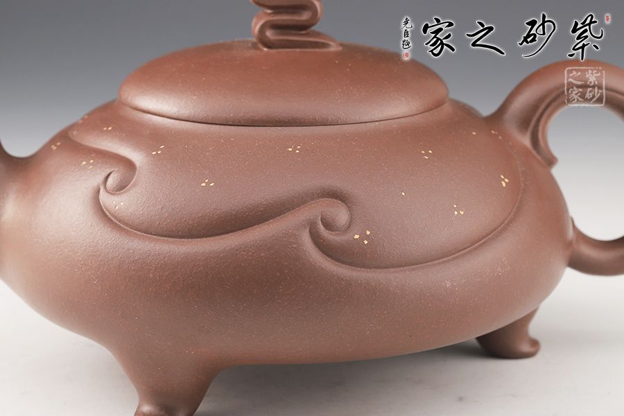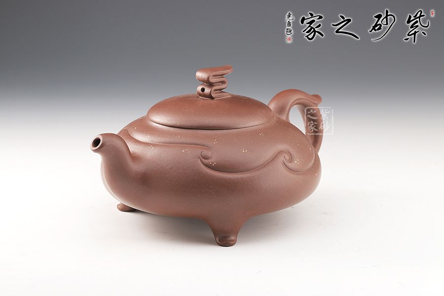 整壺設(shè)計(jì)巧思,線條流暢明快,沉靜中透出活潑,令人嘆為觀止。壓蓋設(shè)計(jì)嚴(yán)絲合縫,壺鈕十分特別,點(diǎn)睛之筆。壺腹飽滿,線條裝飾,飄逸自然。三彎嘴出水流暢,飛把飛把靈動(dòng)飄逸。三足挺拔壺身,穩(wěn)重霸氣。