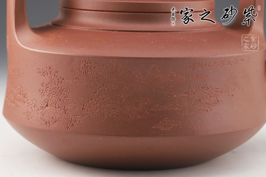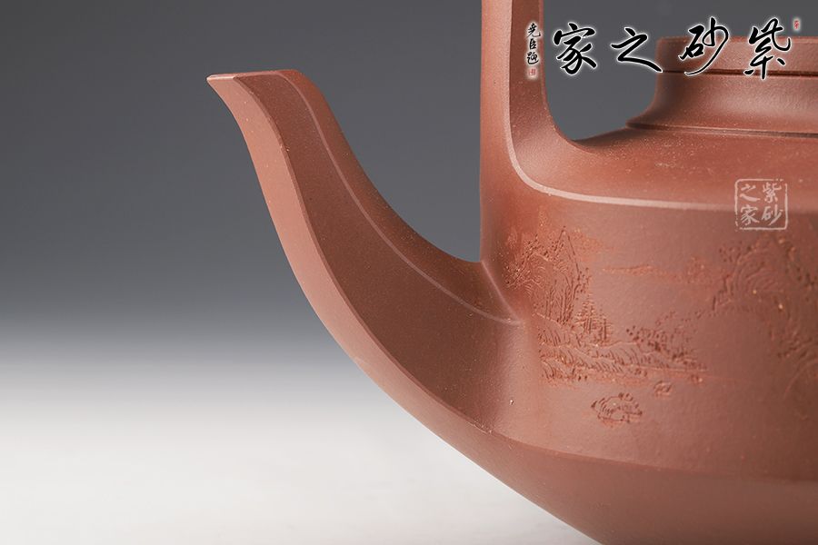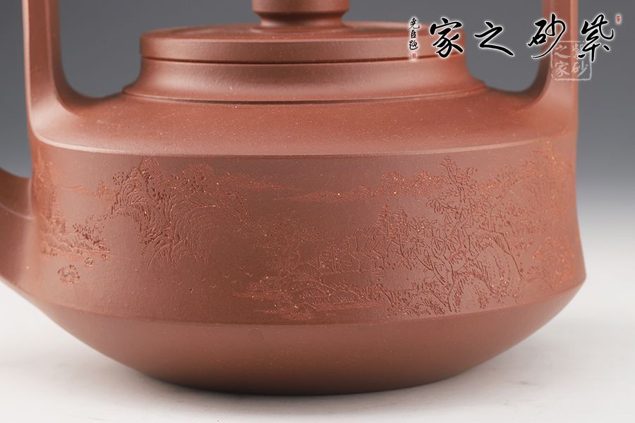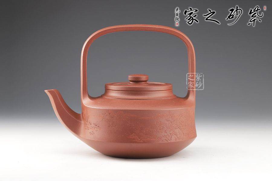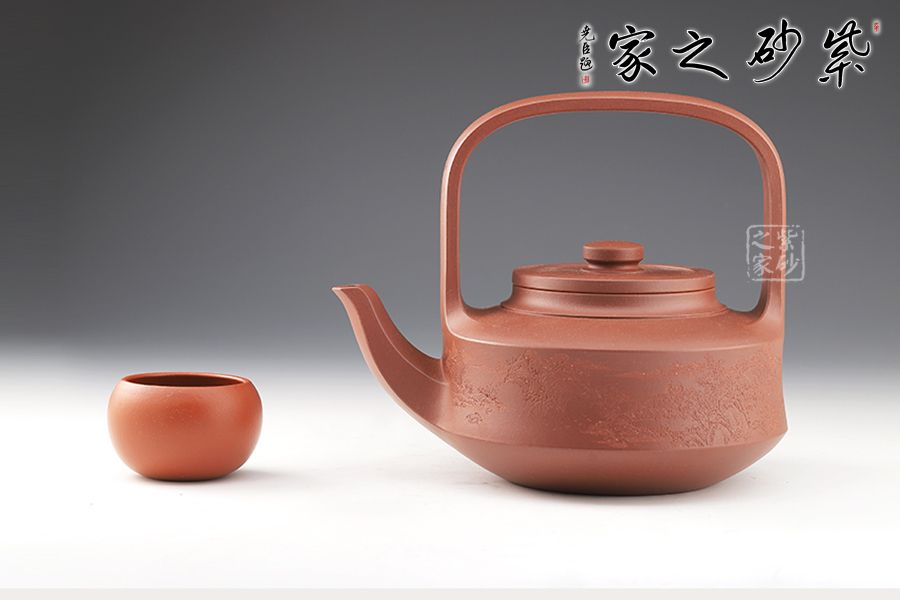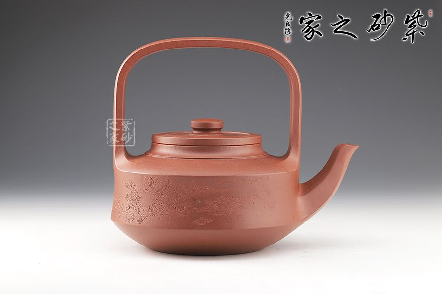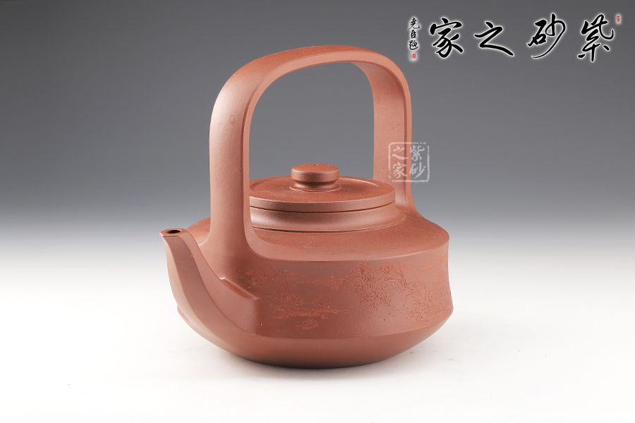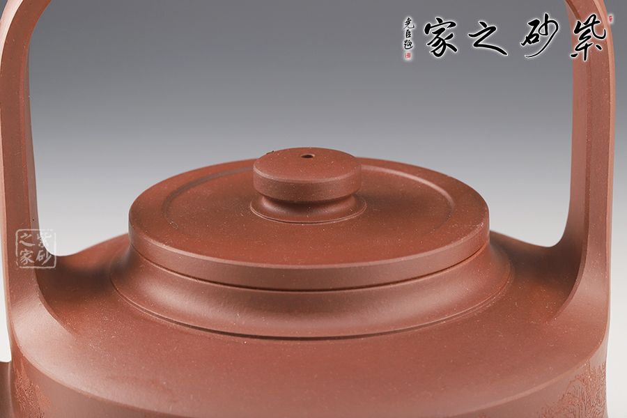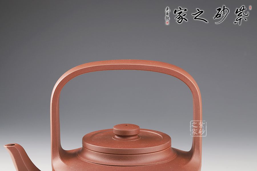 提梁壺是紫砂壺的經(jīng)典造型之一,壺體呈扁圓筒狀,壺頸束云肩線,平蓋扁鈕,與壺體上下呼應(yīng)。壺流自壺腹胥出,以棱線飾之,延伸至壺面,寬柄提梁凌空拔起,與壺體產(chǎn)生虛實(shí)對(duì)比,氣勢(shì)十足,襯托出全壺之大將風(fēng)范。整器剛?cè)岵?jì),和諧勻稱(chēng),是一把欣賞、把玩、實(shí)用的佳作。
