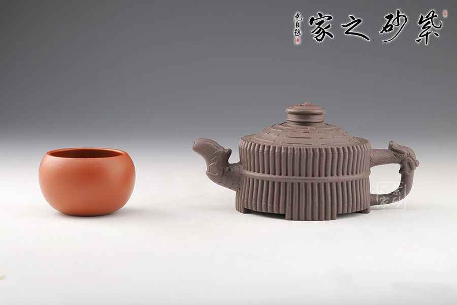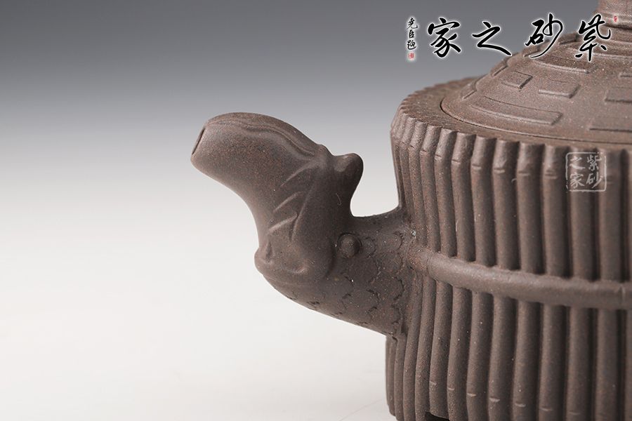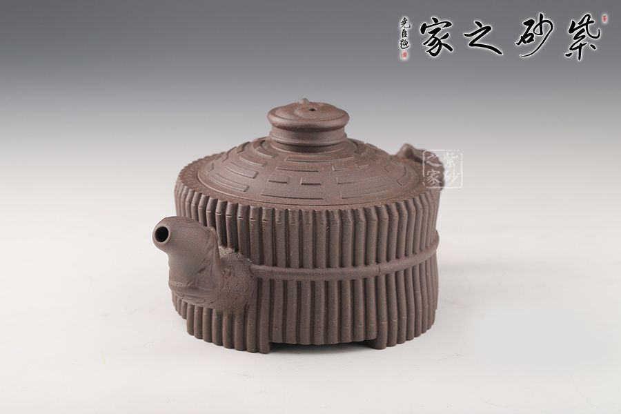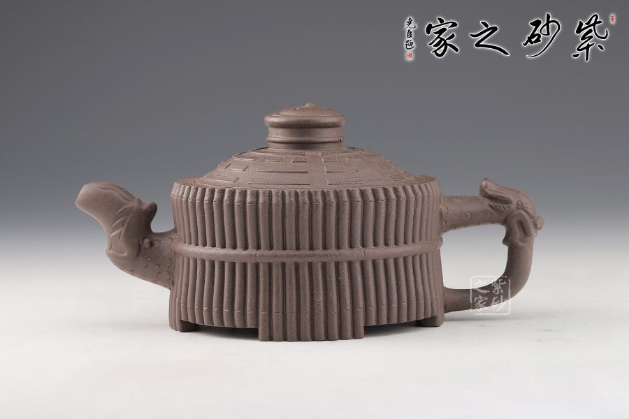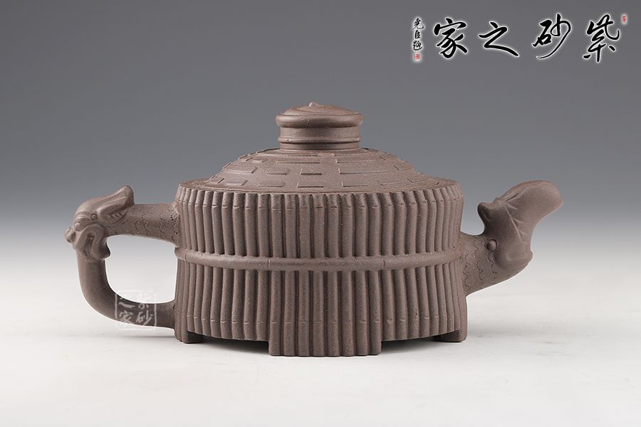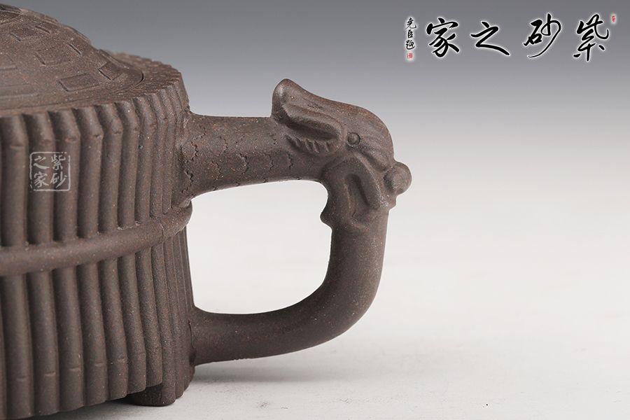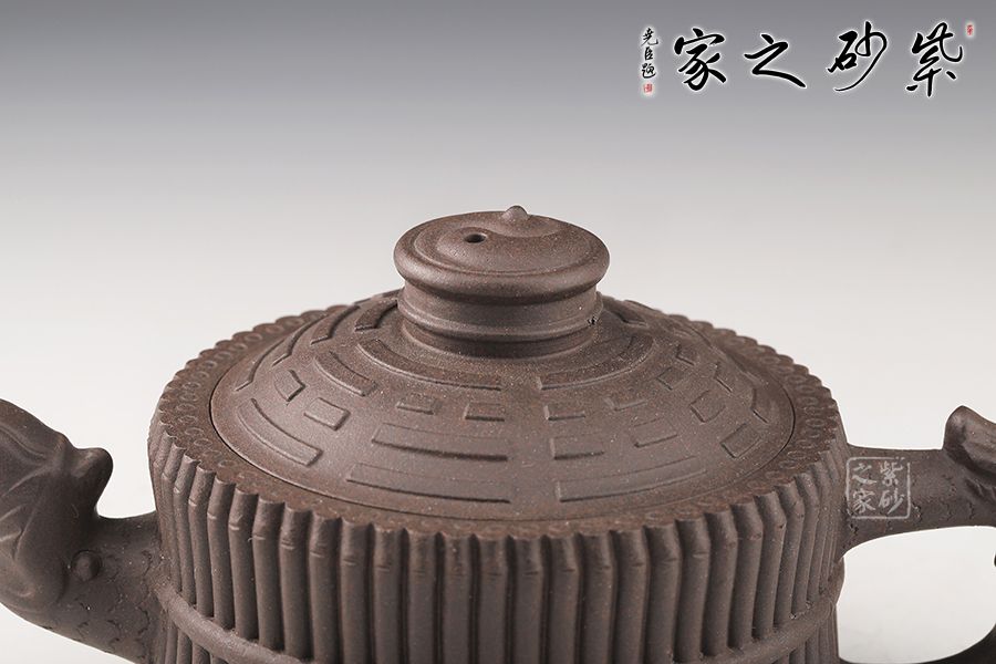 《龍頭一捆竹》壺是清代邵大亨的經(jīng)典款式,整壺以六十四根長竹段圍成壺身,正合六十四卦之?dāng)?shù);又以三十二根短竹段分成四組,每組八根,結(jié)以成足;壺蓋浮雕八卦圖,蓋鈕成太極之形,流把塑龍首,霸氣昂揚(yáng);壺身束竹段腰帶,壺底塑河圖洛書。