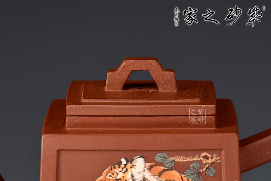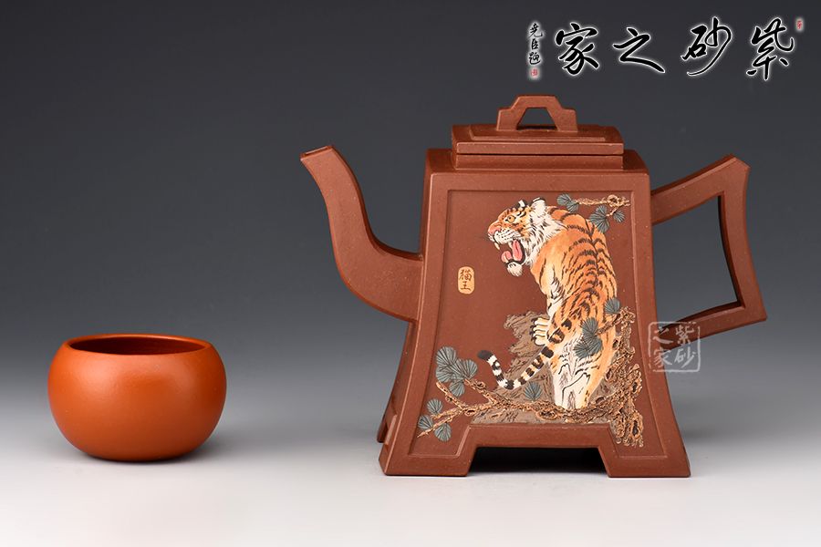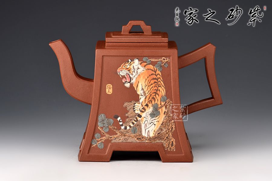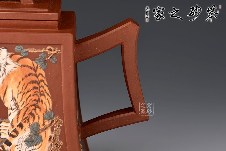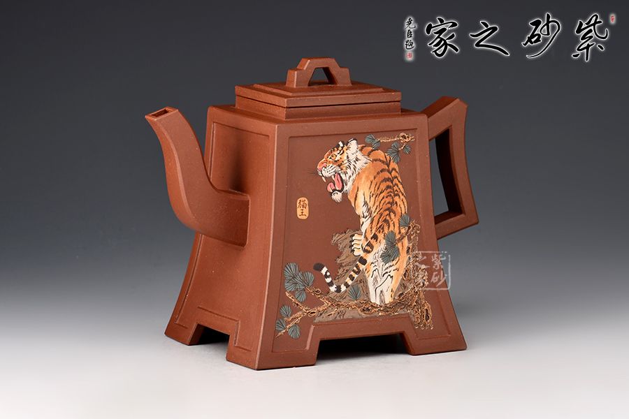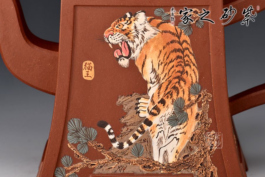 此作挑高的壺身、略呈筒形的腹腰、闊底、方形把、斜出的四方流。四方嵌蓋、橋形壺鈕挺拔壺身。壺身泥繪猛虎逼真?zhèn)魃?,整壺全手工成型,造型端莊大氣,王者風范盡顯,推薦入手。