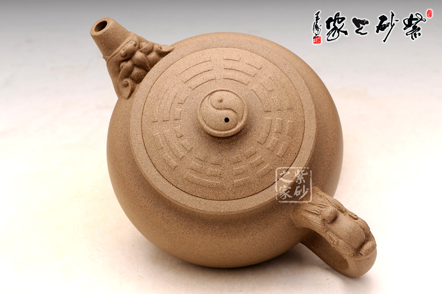 乾坤之象作為鈕,八卦之盤(pán)作為蓋,龍嘴直流胥出,爽利有勁,耳形把,飛馳一龍頭,壺身呈鐘鼎之形,大氣古雅,龍騰之勢(shì)在乾坤之間全然而生。此壺將中華民族傳統(tǒng)的龍、道教文化相互結(jié)合,具有意想不到的效果,寓意明朗、和諧,有龍騰盛世之意。此壺采用原礦段泥精制而成,細(xì)節(jié)點(diǎn)到之處,令觀壺之人無(wú)不感慨作者手法之精妙,并以吉祥的寓意為多少愛(ài)壺之人久久無(wú)法平息其惜壺之心。